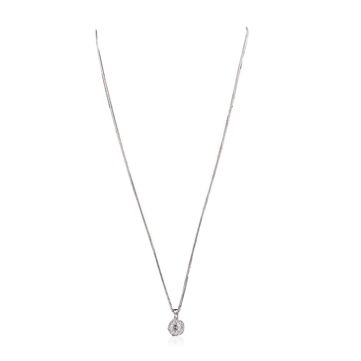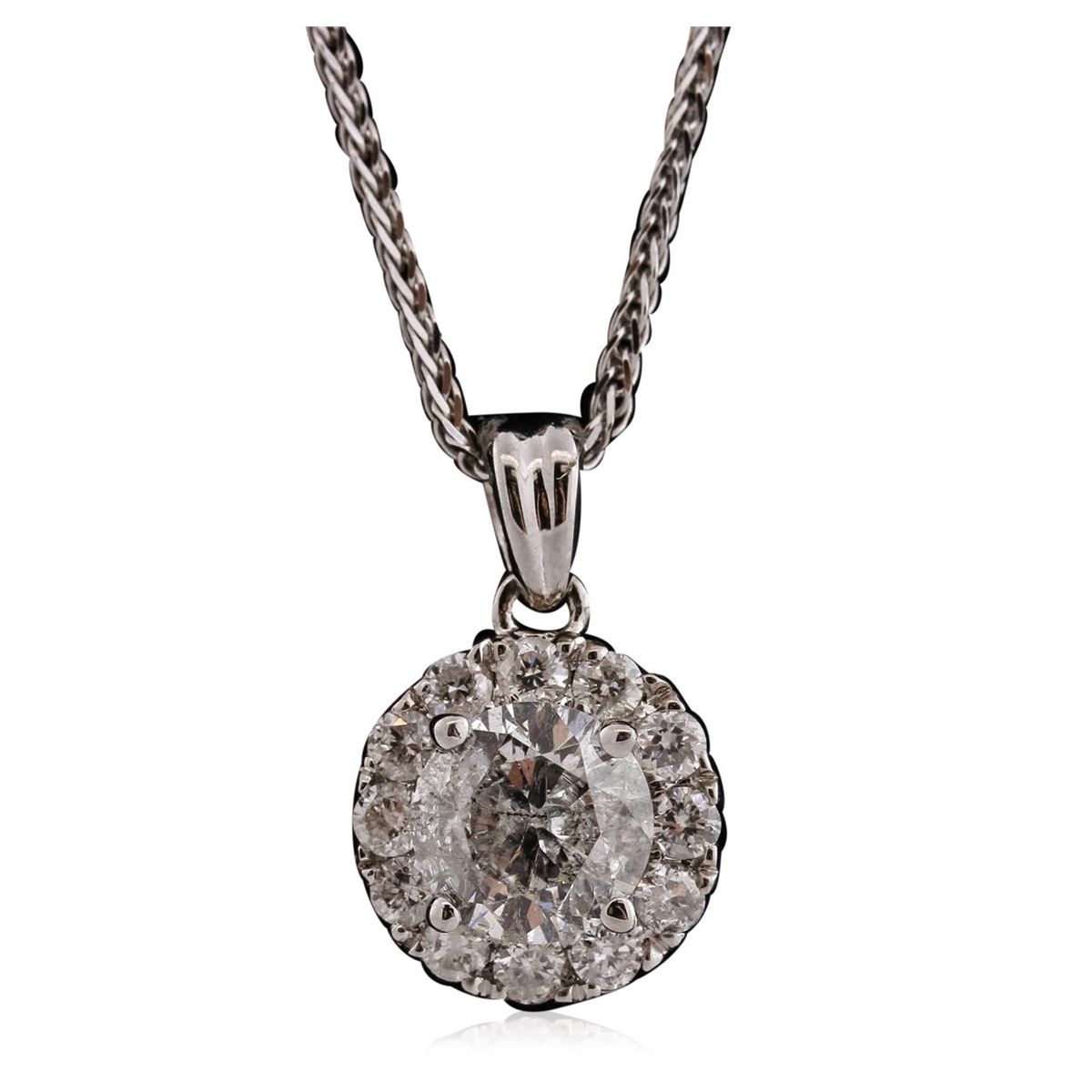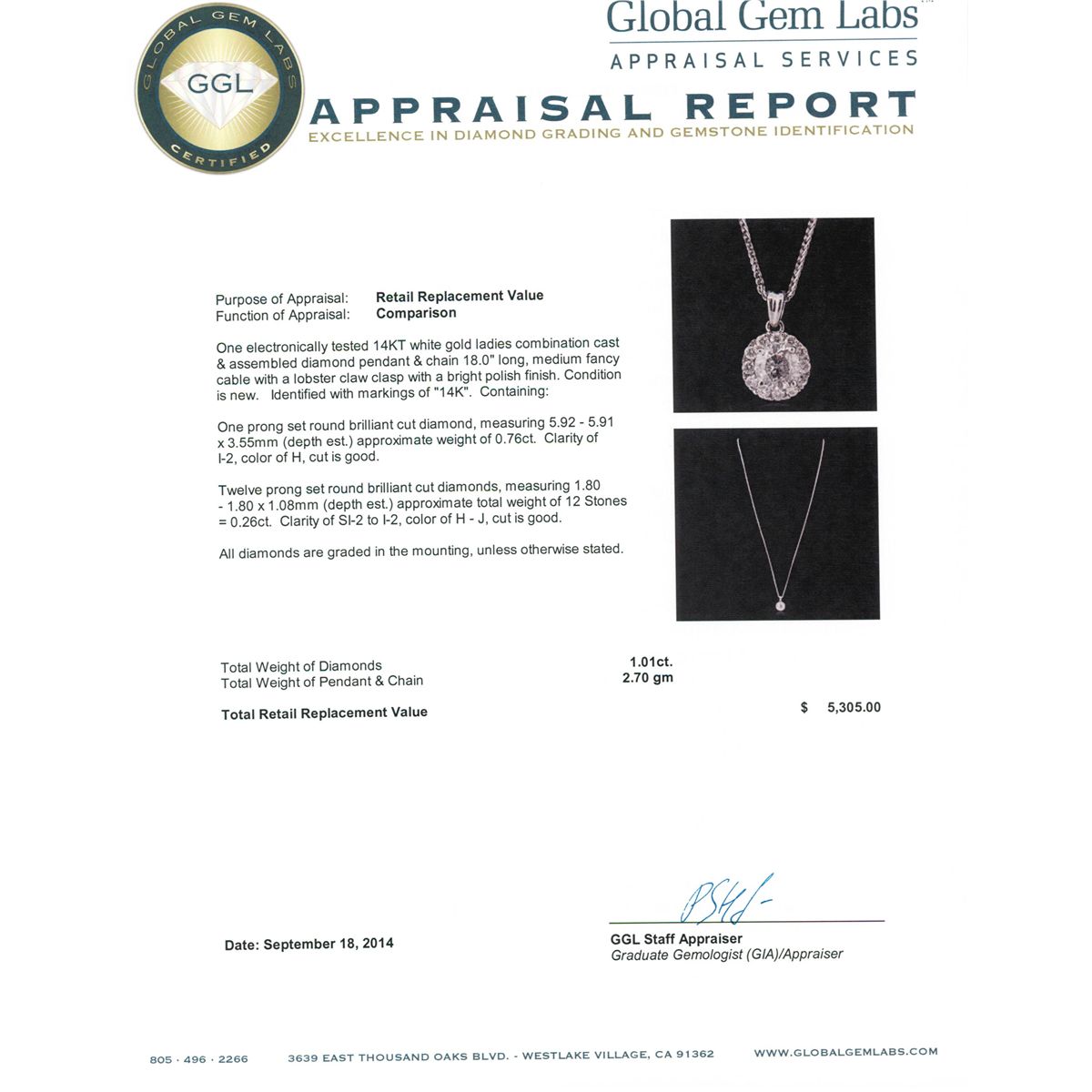 One electronically tested 14KT white gold ladies combination cast & assembled diamond pendant & chain 18.0" long, medium fancy cable with a lobster claw clasp with a bright polish finish. Identified with markings of "14K". Condition is new. Containing: One prong set round brilliant cut diamond, measuring 5.92 - 5.91 x 3.55mm (depth est.) approximate weight of 0.76ct. Clarity: I-2. Color: H, Cut is Good. Twelve prong set round brilliant cut diamonds, measuring 1.80 - 1.80 x 1.08mm (depth est.) approximate total weight of 12 Stones = 0.26ct. Clarity: SI-2 to I-2. Color: H - J, Cut is Good. All diamonds are graded in the mounting, unless otherwise stated. Total Weight of Diamonds 1.01ct. Total Weight of Pendant & Chain 2.70 grams. GGL Appraised at $5,305.00. GGL Appraised at $7,435.00.