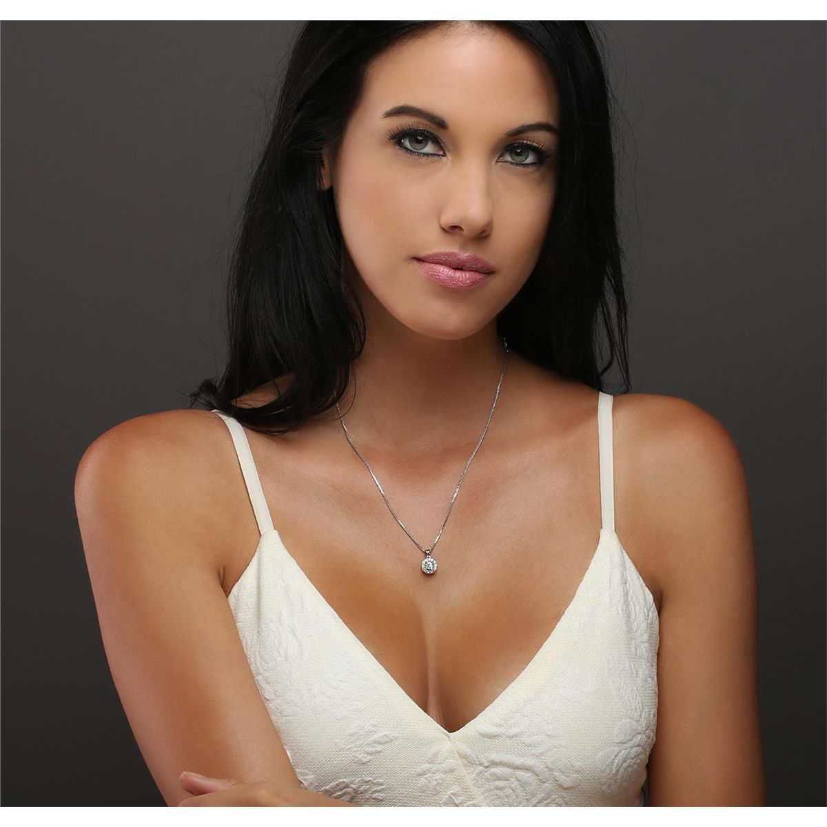 One electronically tested 14KT white gold ladies combination cast & assembled diamond pendant & chain 18.0" long, medium fancy cable with a lobster claw clasp with a bright polish finish. Identified with markings of "14K". Condition is new. Containing: One prong set round brilliant cut diamond, measuring 5.92 - 5.91 x 3.55mm (depth est.) approximate weight of 0.76ct. Clarity: I-2. Color: H, Cut is Good. Twelve prong set round brilliant cut diamonds, measuring 1.80 - 1.80 x 1.08mm (depth est.) approximate total weight of 12 Stones = 0.26ct. Clarity: SI-2 to I-2. Color: H - J, Cut is Good. All diamonds are graded in the mounting, unless otherwise stated. Total Weight of Diamonds 1.01ct. Total Weight of Pendant & Chain 2.70 grams. GGL Appraised at $5,305.00.