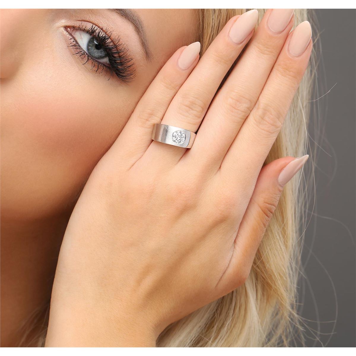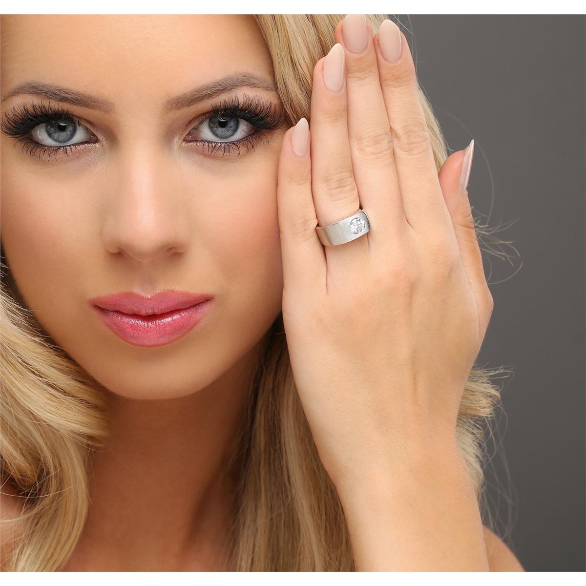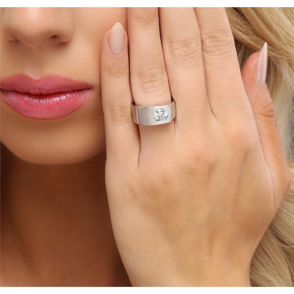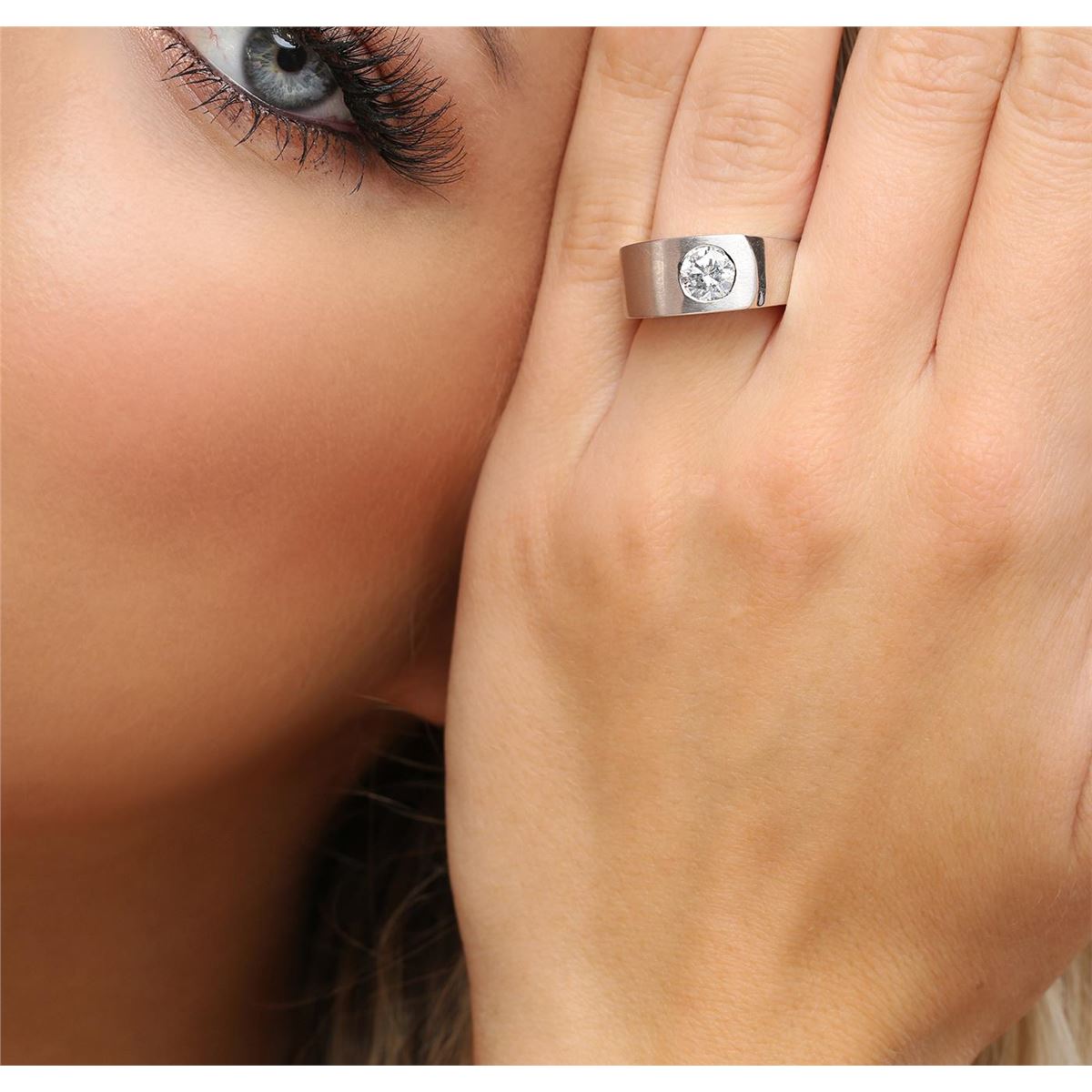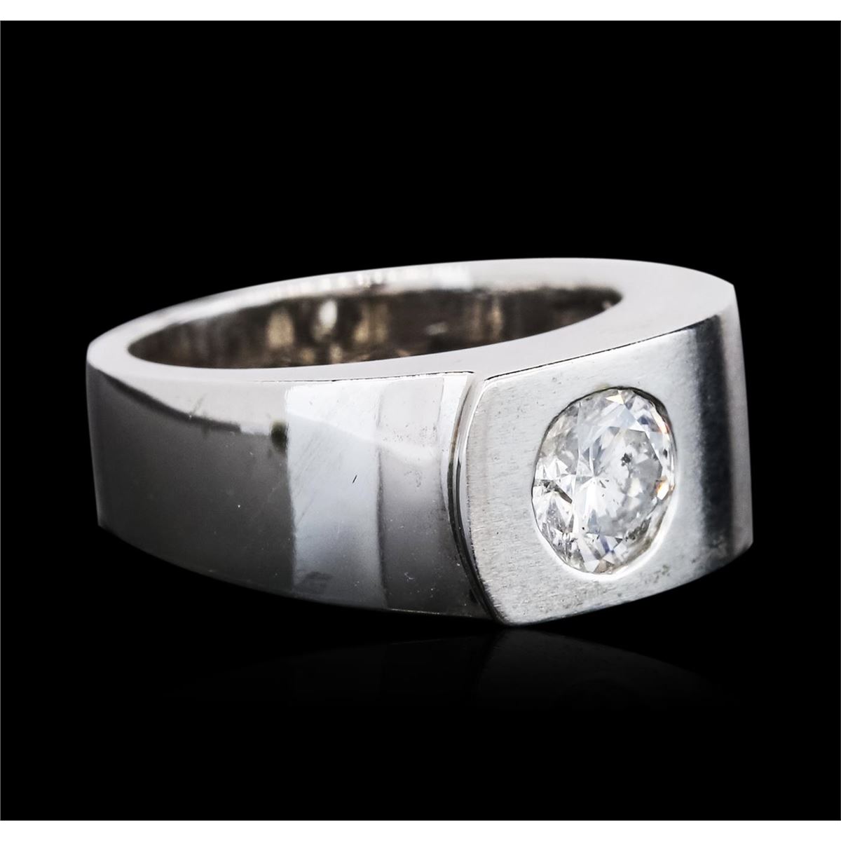 One electronically tested 14KT white gold ladies cast diamond solitaire ring with a bright and satin finish. The ring is completed by a five millimeter wide band. Identified with markings of "K14". Condition is good. Containing: One flush set round brilliant cut diamond, measuring 6.50 - 6.40 x 3.65mm (depth est.) approximate weight of 1.02ct with a medium blue fluorescence. Graded in the setting. Clarity: I-1. Color: H. Depth 56.6%. Table 60.5%. Total Weight of Diamonds 1.02ct. Total Weight of Ring 11.97 grams. AIG Appraised at $13,480.00.