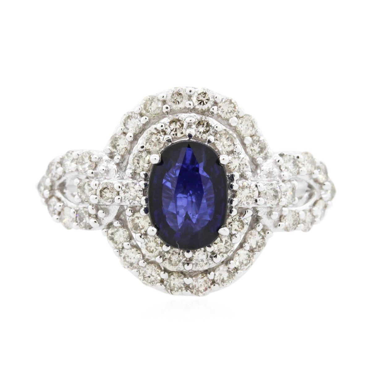 One electronically tested 14KT white gold ladies combination cast & assembled sapphire and diamond ring with a flat shank with a bright polish finish. Identified with markings of "14K". Condition is new. Containing: One prong set oval modified brilliant cut natural blue sapphire, measuring 7.09 x 5.19 x 3.37mm, approximate weight of 1.02ct., clarity is eye clean, type II, medium dark, moderately strong, blue color, (GIA B 6/4), cut is very good. Forty-Eight prong set round brilliant cut diamonds, measuring 1.50 - 1.50 x 0.90mm (depth est.) approximate total weight of 48 Stones = 0.59ct. Clarity: I-1 to I-2. Color: J - K, Cut is Good. Colored gemstones are presumed to have been subjected to commonly used enhancement processes. All diamonds and colored gemstones are graded in the mounting, unless otherwise stated. Total Weight of Colored Stones 1.02ct. Total Weight of Diamonds 0.59ct. Total Weight of Ring 3.80 grams. GGL Appraised at $3,230.00.