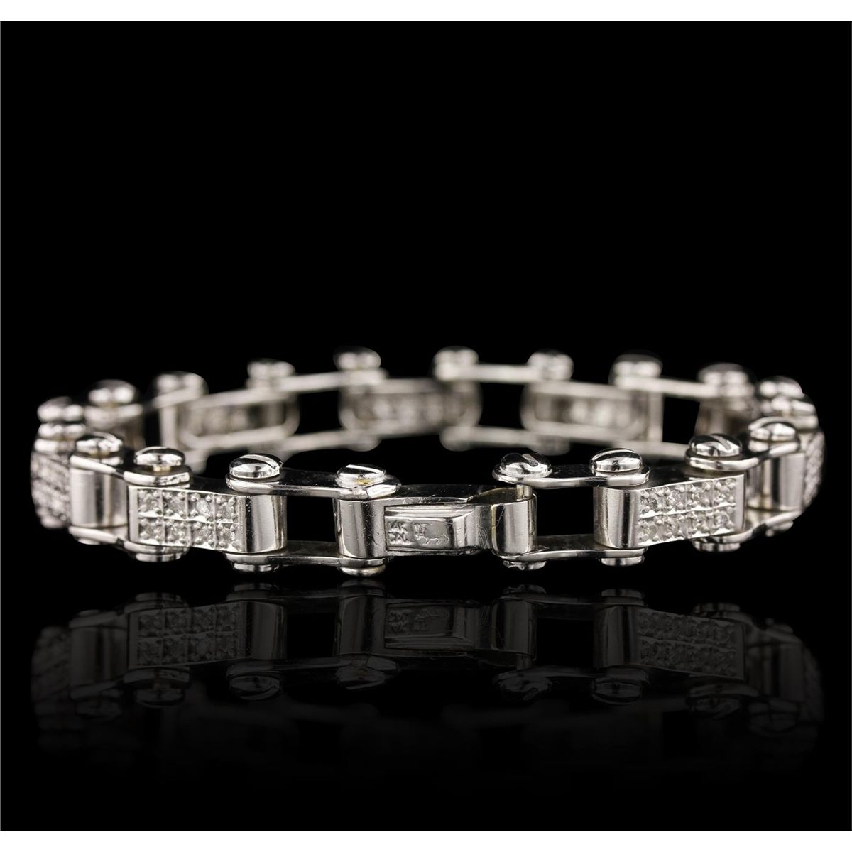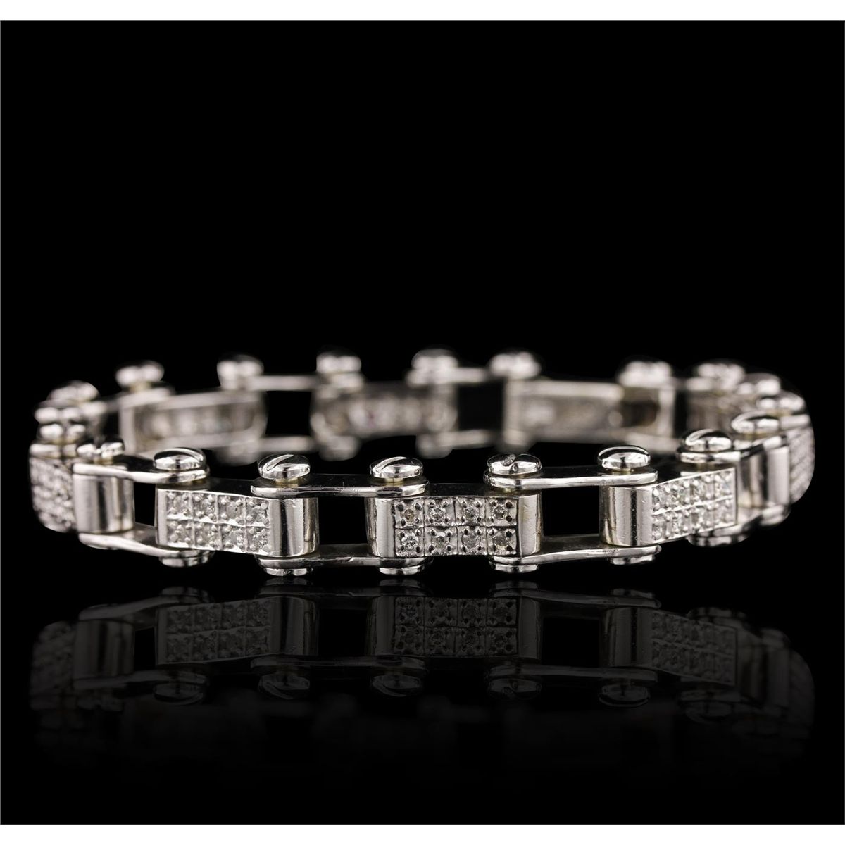 One electronically tested 14KT white gold man's combination cast & die struck bracelet with a foldover clasp with a bright polish finish. Measurements: 8" in length. Identified with markings of "14K". Condition is excellent. Containing: Seventy-Two bead set round brilliant cut diamonds, measuring 1.60 - 1.50 x 0.93mm (depth est.) approximate total weight of 72 Stones = 1.02ct. Clarity of I-1 to I-3, Color of G - I, Cut is Fair. Total Weight of Diamonds 1.02ct. Total Weight of Bracelet 55.60gm. GGL Appraised at $21,535.00.