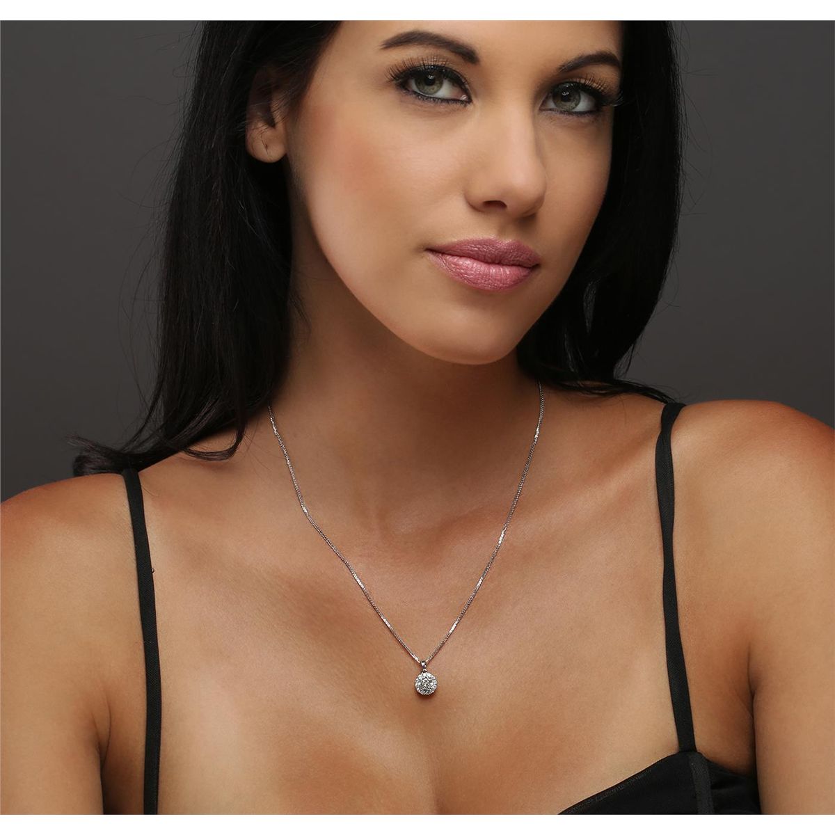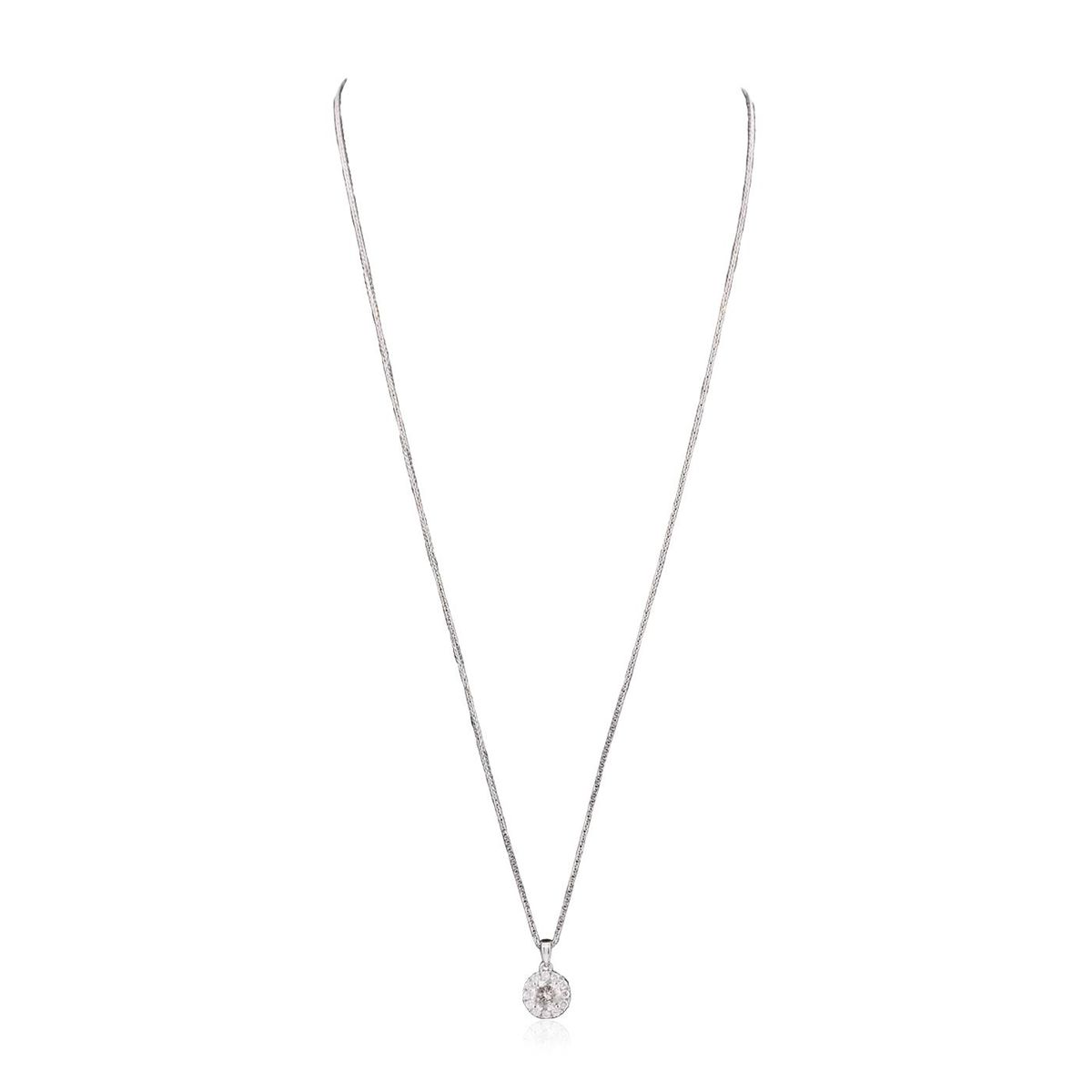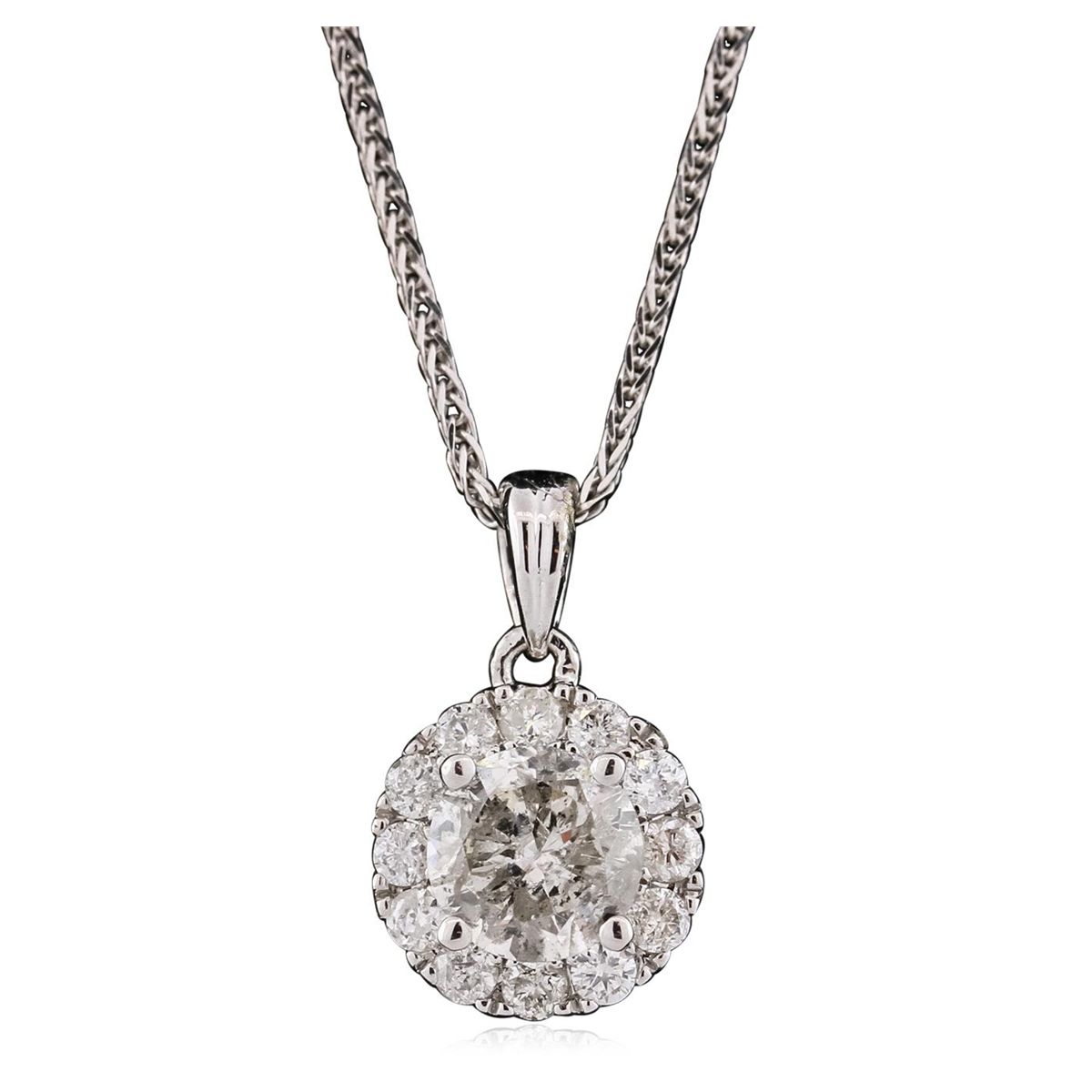 One electronically tested 14KT white gold ladies combination cast & assembled diamond pendant & chain 18.0" long, medium fancy cable with a lobster claw clasp with a bright polish finish. Identified with markings of "14K". Condition is new. Containing: One prong set round brilliant cut diamond, measuring 5.84 - 5.85 x 3.68mm (depth est.) approximate weight of 0.77ct. Clarity: I-2. Color: I, Cut is Good. Twelve prong set round brilliant cut diamonds, measuring 1.80 - 1.80 x 1.08mm (depth est.) approximate total weight of 12 Stones = 0.26ct. Clarity: SI-2 to I-2. Color: H - J, Cut is Good. All diamonds are graded in the mounting, unless otherwise stated. Total Weight of Diamonds 1.02ct. Total Weight of Pendant & Chain 2.70 grams. GGL Appraised at $5,150.00.
