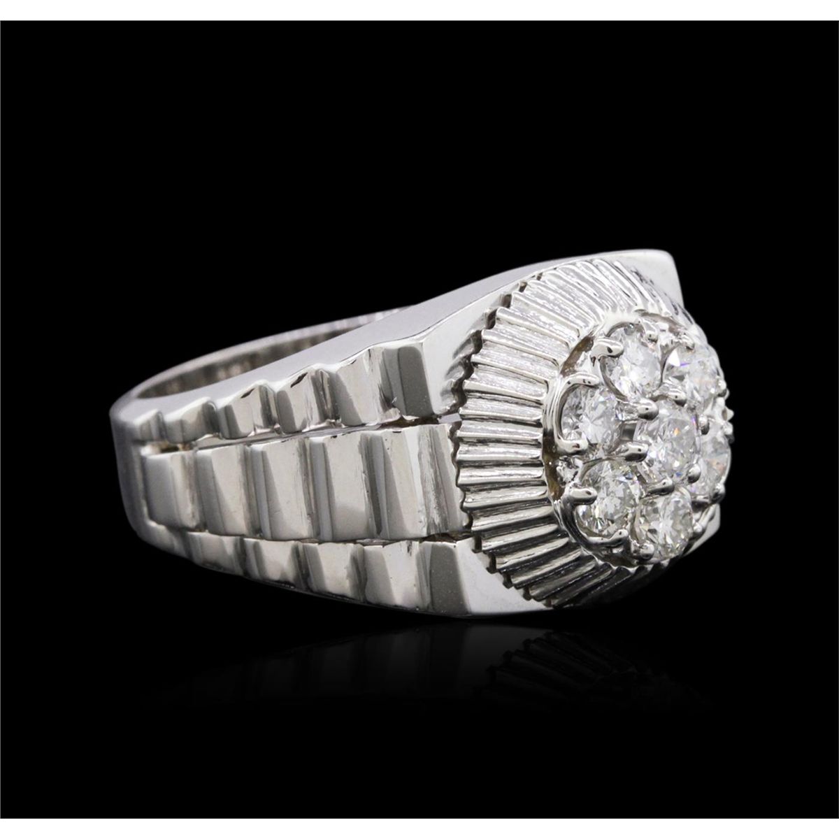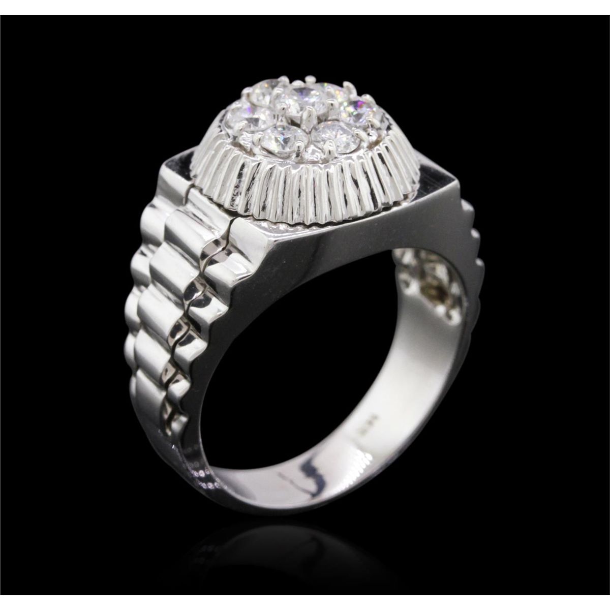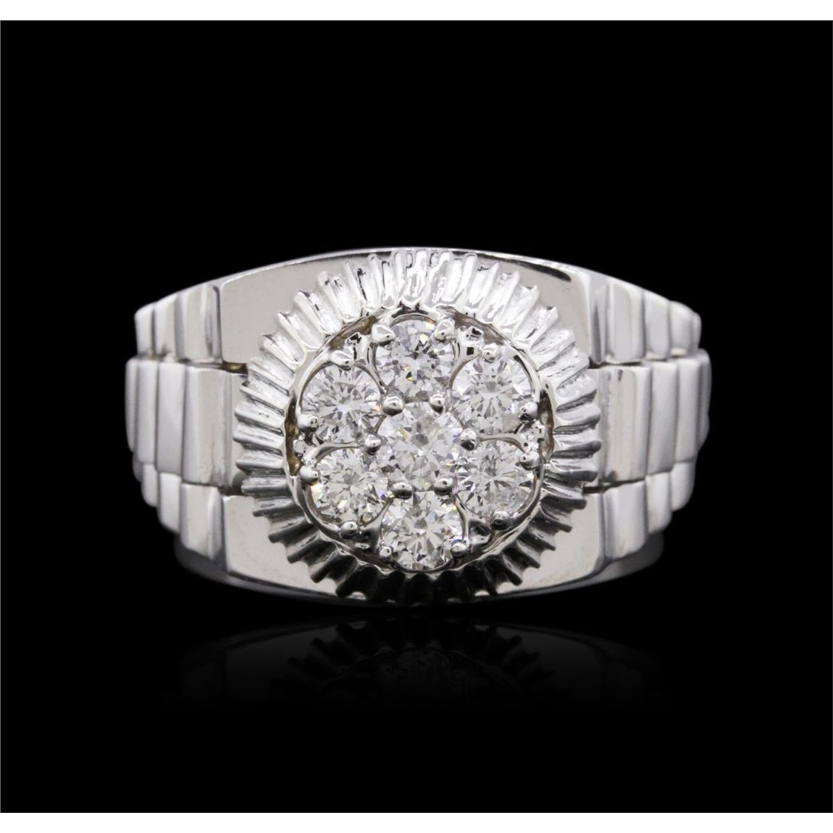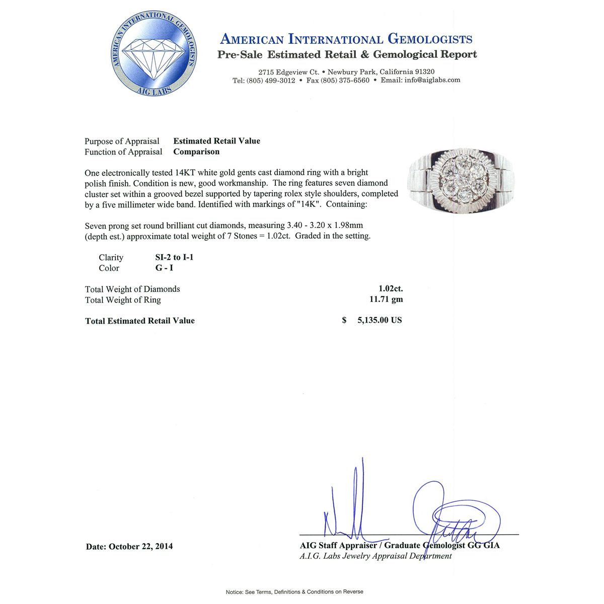 One electronically tested 14KT white gold gents cast diamond ring with a bright polish finish. The ring features seven diamond cluster set within a grooved bezel supported by tapering rolex style shoulders, completed by a five millimeter wide band. Identified with markings of 14K. Condition is new, good workmanship. Containing: Seven prong set round brilliant cut diamonds, measuring 3.40 - 3.20 x 1.98mm (depth est.) approximate total weight of 7 Stones = 1.02ct. Graded in the setting. Clarity: SI-2 to I-1. Color: G - I. Total Weight of Diamonds 1.02ct. Total Weight of Ring 11.71 grams. AIG Appraised at $5,135.00.