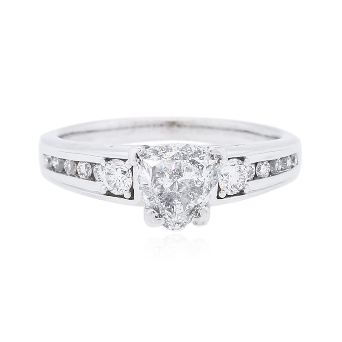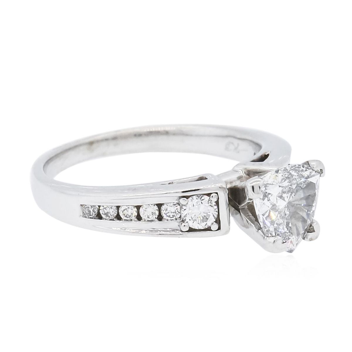 One electronically tested 14KT white gold ladies cast diamond engagement ring with a bright polish finish. Identified with markings of "14K". Condition is new. Containing: One prong set triangle brilliant cut diamond, measuring 6.20 x 6.20 x 3.84mm (depth est.) approximate weight of 0.84ct. Clarity: I-2. Color: K, Cut is Good. Twelve channel set round brilliant cut diamonds, measuring 2.50 - 1.30 x 1.14mm (depth est.) approximate total weight of 12 Stones = 0.18ct. Clarity: SI-2 to I-1. Color: I, Cut is Good. All diamonds are graded in the mounting, unless otherwise stated. Total Weight of Diamonds 1.02ct. Total Weight of Ring 3.60 grams. GGL Appraised at $4,490.00.