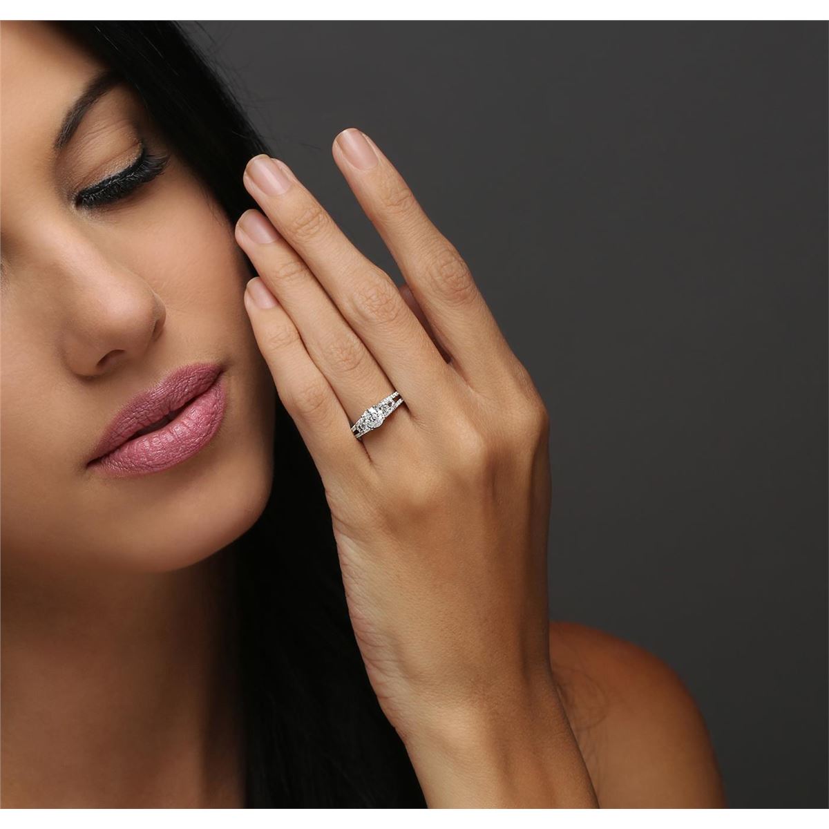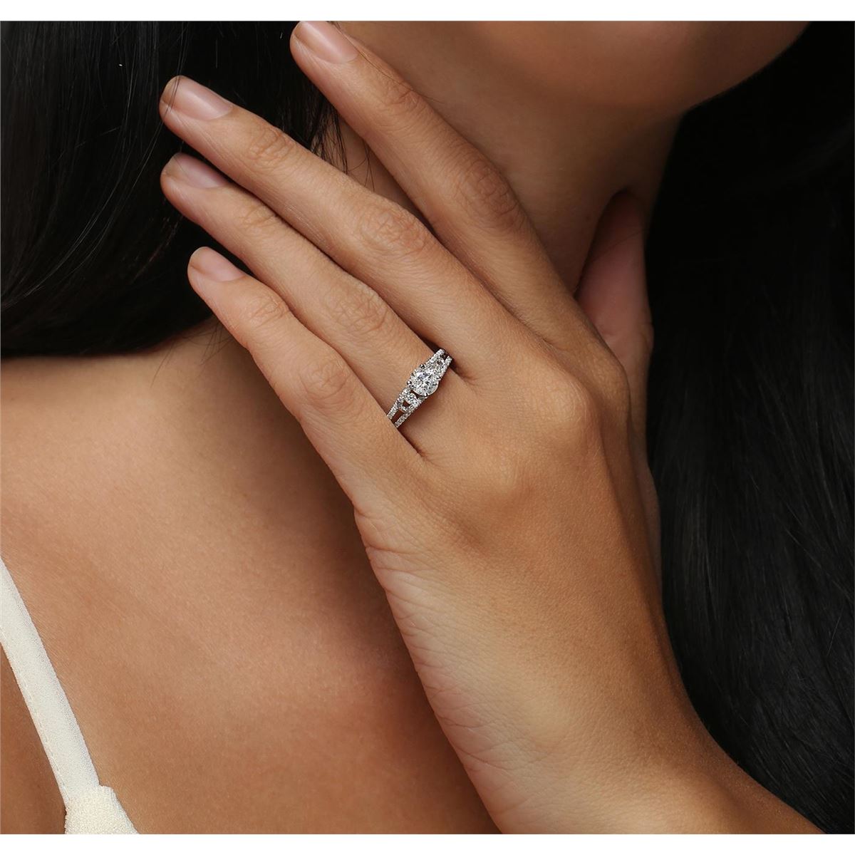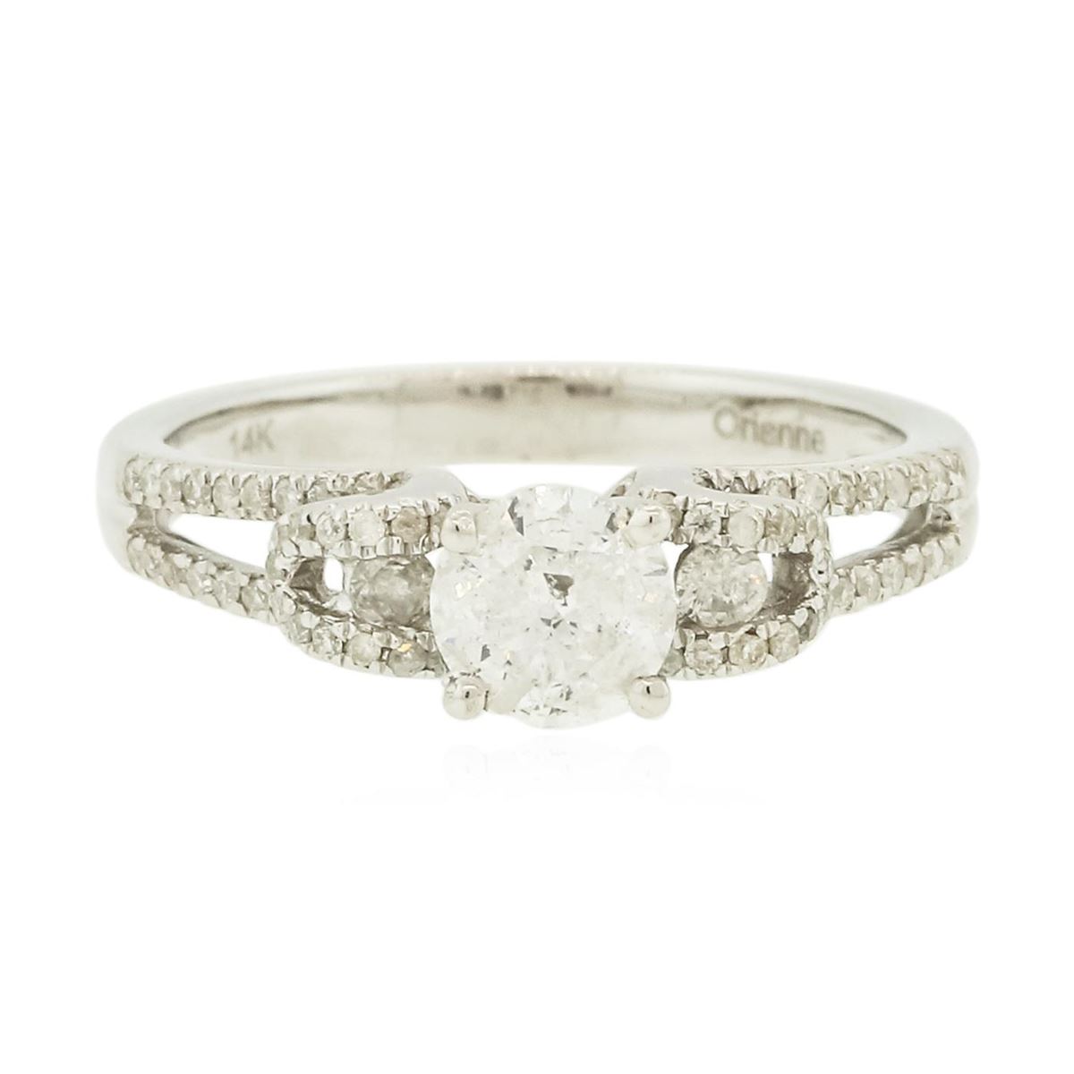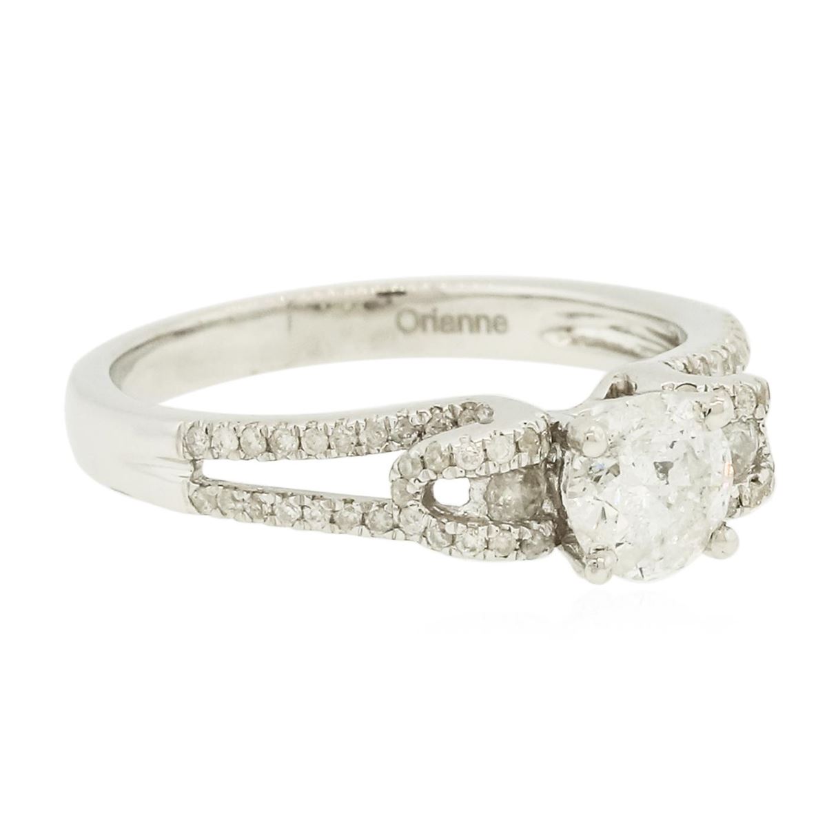 One electronically tested 14KT white gold ladies combination cast & assembled engagement ring with a split shank with a bright polish finish. Identified with markings of "14K". Condition is new. Containing: One prong set round brilliant cut diamond, measuring 5.61 - 5.65 x 3.21mm (depth est.) approximate weight of 0.62ct. Clarity: I-2. Color: I, Cut is Good. Sixty-Eight prong set round brilliant cut diamonds, measuring 1.90 - 1.10 x 0.90mm (depth est.) approximate total weight of 68 Stones = 0.40ct. Clarity: SI-2 to I-2. Color: I - J, Cut is Good. All diamonds are graded in the mounting, unless otherwise stated. Total Weight of Diamonds 1.02ct. Total Weight of Ring 3.20 grams. GGL Appraised at $5,245.00.