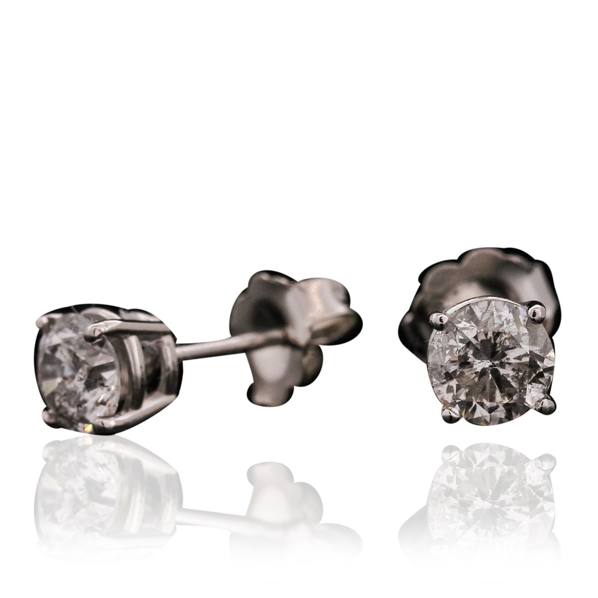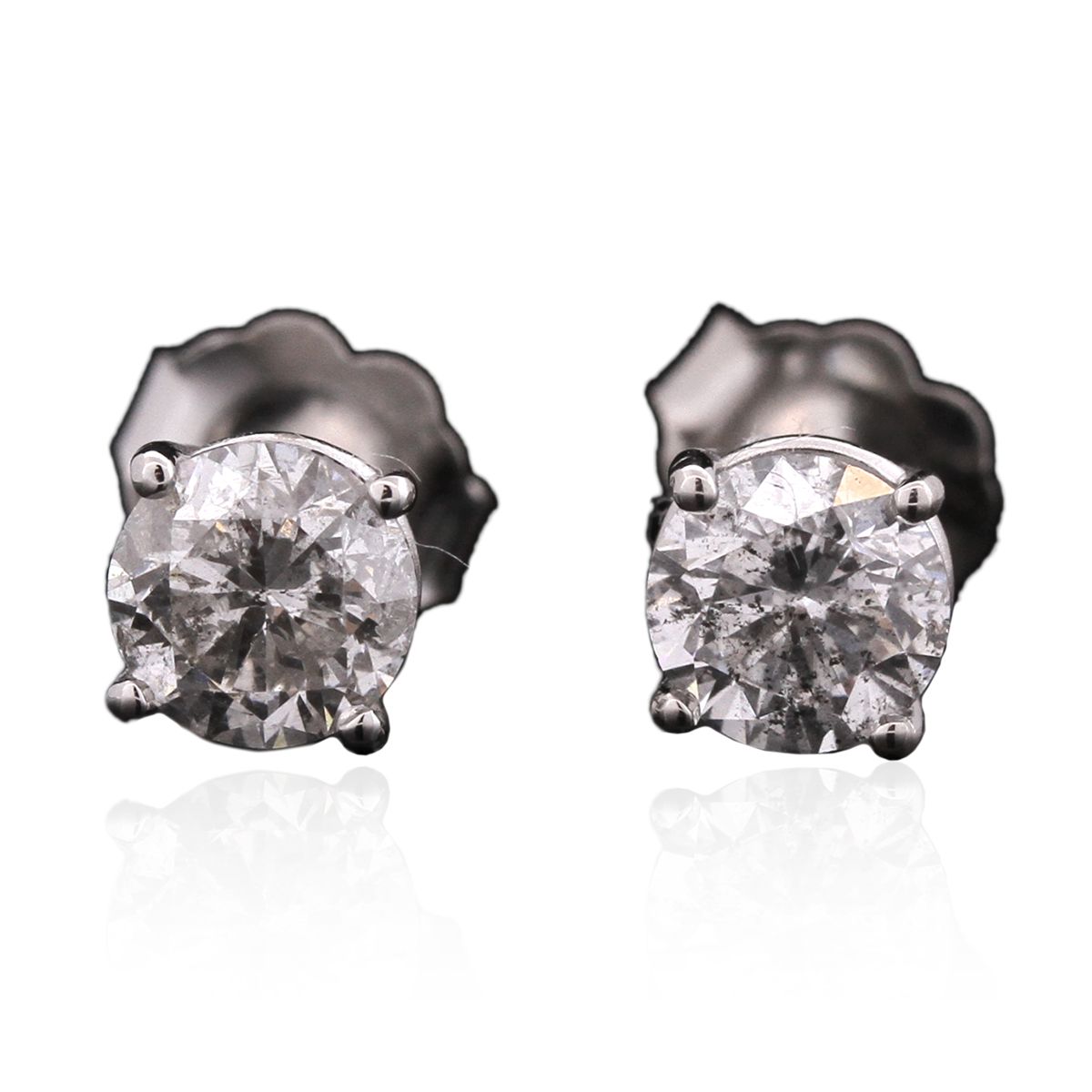 One pair electronically tested 14KT white gold cast & assembled diamond solitaire earrings with standard backs. Identified with markings of "14K". Condition is new, good workmanship. Containing: One prong set round brilliant cut diamond, measuring 5.00 - 5.00 x 3.16mm (depth est.), 2.00% GTCF approximate weight of 0.50ct with a faint blue fluorescence. Graded in the setting. Clarity: I-1. Color: 63.2%. Table 58.0%. One prong set round brilliant cut diamond, measuring 5.08 - 5.05 x 3.28mm (depth est.), 2.00% GTCF approximate weight of 0.52ct. Graded in the setting. Clarity: I-2. Color: I. Depth 64.7%. Table 60.2%. Total Weight of Diamonds 1.02ct. Total Weight of Earrings 0.98 grams. AIG Appraised at $3,990.00.