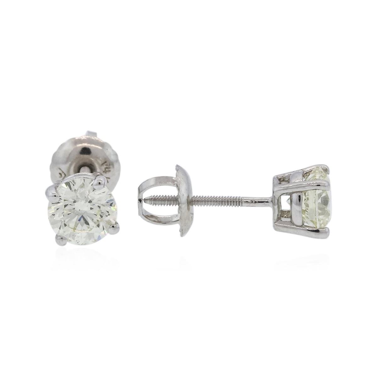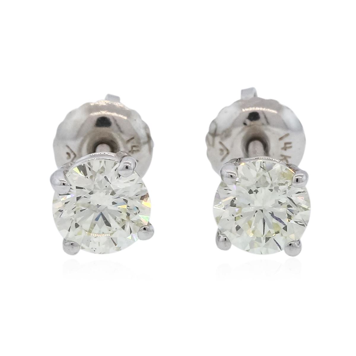 One pair electronically tested 14KT white gold cast & assembled diamond solitaire earrings with screw backs. Condition is new, good workmanship. Containing: One prong set round brilliant cut diamond, measuring 5.10 - 5.10 x 3.23mm (depth est.) approximate weight of 0.51ct with a medium blue fluorescence. Graded in the setting. Clarity: I-1. Color: L. Depth 63.3%. Table 54.3%. One prong set round brilliant cut diamond, measuring 5.10 - 5.00 x 3.30mm (depth est.), 2.00% GTCF approximate weight of 0.52ct with a very strong blue fluorescence. Graded in the setting. Clarity: I-1. Color: N. Depth 65.4%. Table 56.4%. Total Weight of Diamonds 1.03ct. Total Weight of Earrings 0.95 grams. AIG Appraised at $3,450.00.