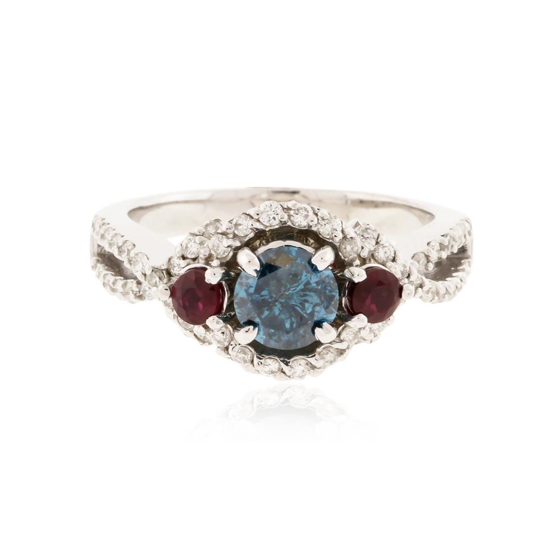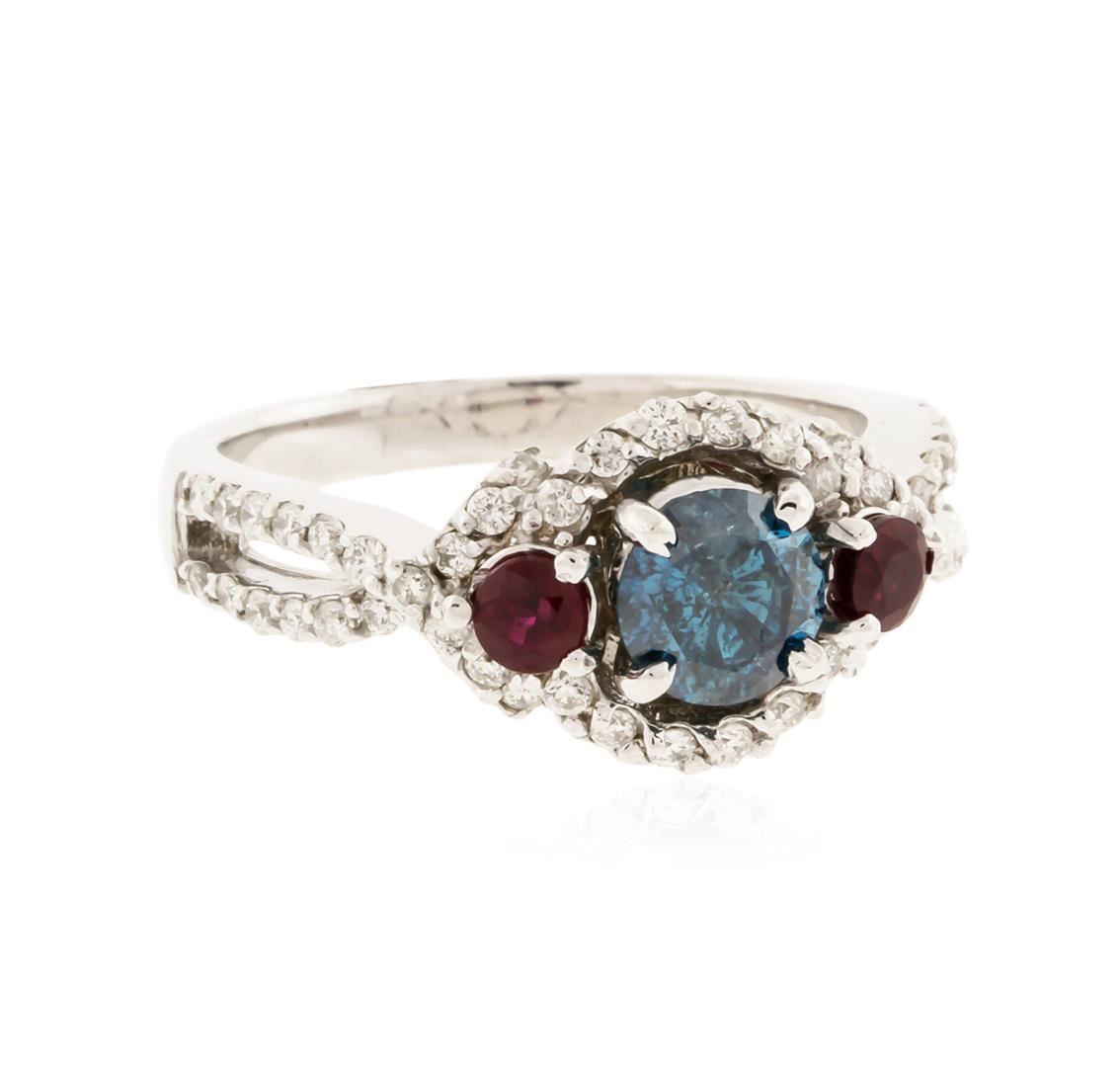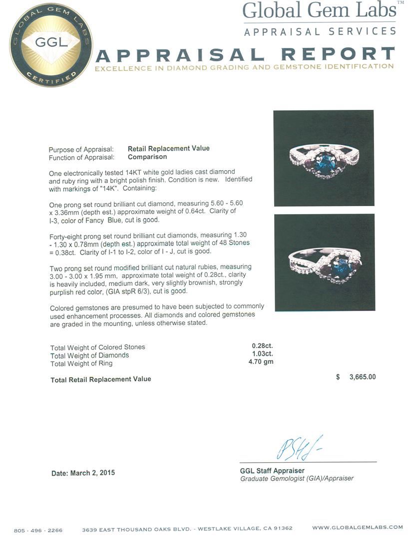 One electronically tested 14KT white gold ladies cast diamond and ruby ring with a bright polish finish. Identified with markings of "14K". Condition is new. Containing: One prong set round brilliant cut diamond, measuring 5.60 - 5.60 x 3.36mm (depth est.) approximate weight of 0.64ct. Clarity: I-3, Cut is Good. Forty-Eight prong set round brilliant cut diamonds, measuring 1.30 - 1.30 x 0.78mm (depth est.) approximate total weight of 48 Stones = 0.38ct. Clarity: I-1 to I-2. Color: I - J, Cut is Good. Two prong set round modified brilliant cut natural rubies, measuring 3.00 - 3.00 x 1.95 mm, approximate total weight of 0.28ct., clarity is heavily included, medium dark, very slightly brownish, strongly purplish red color, (GIA stpR 6/3), cut is good. Colored gemstones are presumed to have been subjected to commonly used enhancement processes. All diamonds and colored gemstones are graded in the mounting, unless otherwise stated. Total Weight of Colored Stones 0.28ct. Total Weight of Diamonds 1.03ct. Total Weight of Ring 4.70 grams. GGL Appraised at $3,665.00.