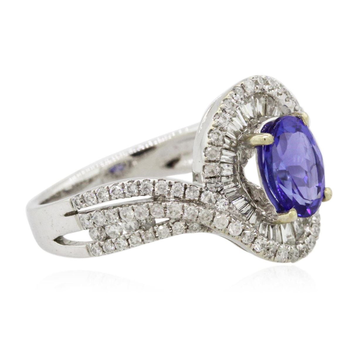 One electronically tested 14KT white gold Ladies combination cast & assembled ring with a bright polish finish. Condition is new. Identified with markings of "14K". Containing: One prong set oval modified brilliant cut natural tanzanite, measuring 7.60 x 5.50 x 3.58mm, approximate weight of 1.03ct., clarity is eye clean, type I, medium, moderately strong, bluish violet color, (GIA bV 5/4), cut is very good. Colored gemstones are presumed to have been subjected to commonly used color/clarity enhancement processes. Ninety-Four bead set round brilliant cut diamonds, measuring 1.10 - 1.10 x 0.66mm (depth est.) approximate. Total Weight of 94 Stones = 0.45ct. Clarity: I-1 to I-2. Color: H - I, Cut is Good. Twenty-Eight channel set baguette cut diamonds, measuring 1.30 x 1.00 x 0.85mm (depth est.) approximate. Total Weight of 28 Stones = 0.28ct. Clarity: SI-1 to SI-2. Color: H - I, Cut is Good. Total Weight of Colored Stones 1.03ct. Total Weight of Diamonds 0.73ct. Total Weight of Ring 5.00 grams. GGL Appraised at $4,895.00.