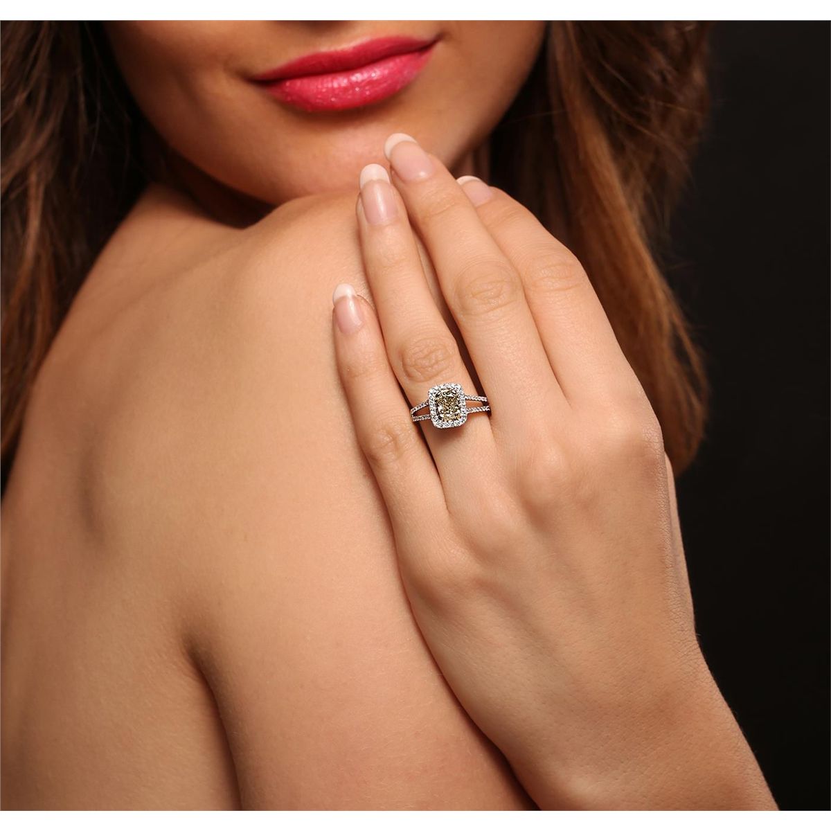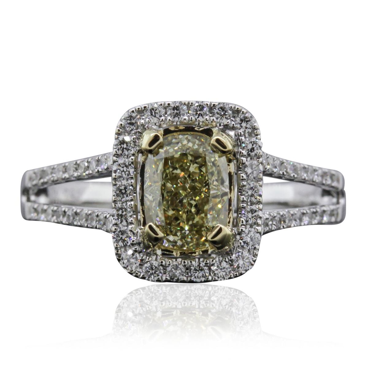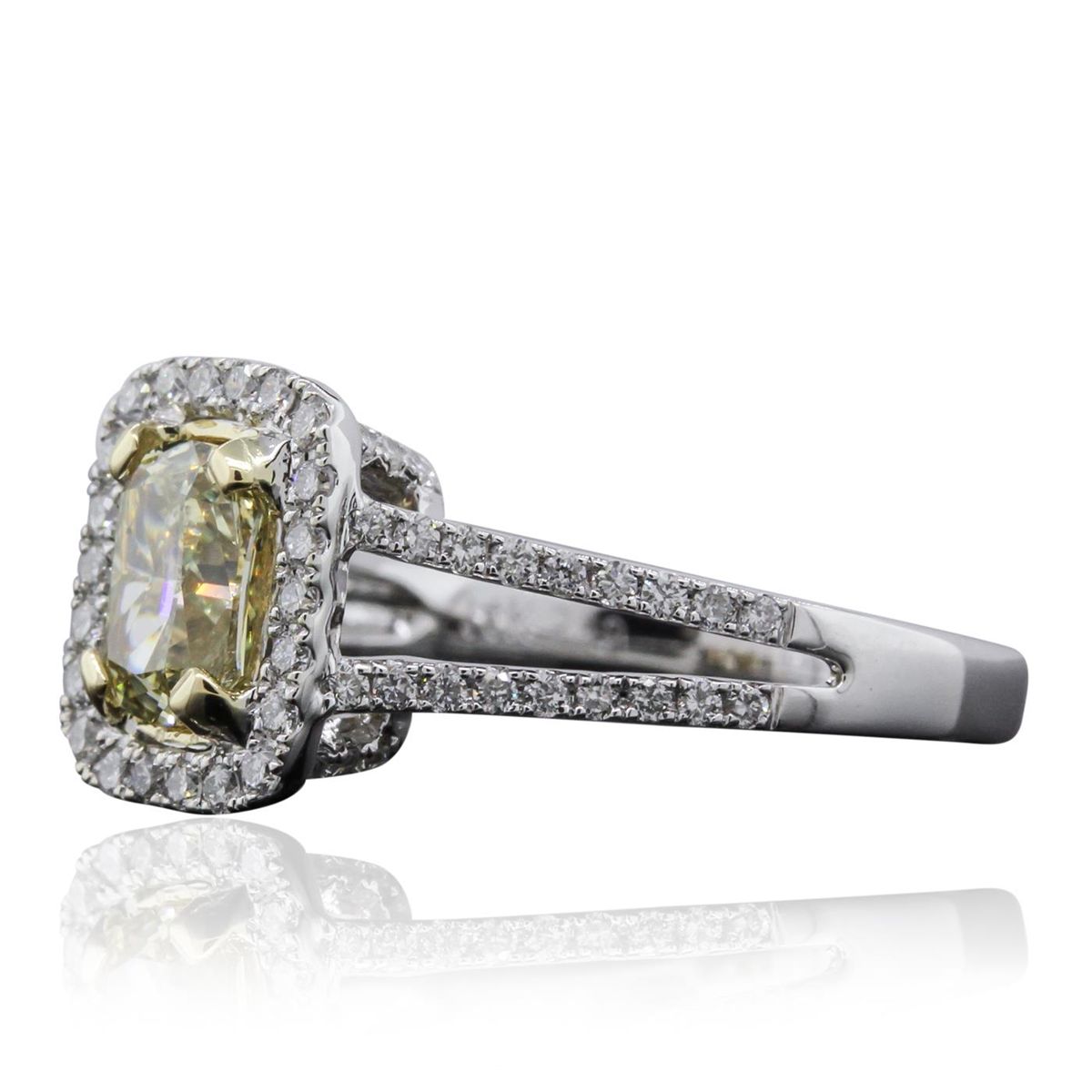One electronically tested 14KT white gold ladies cast diamond unity ring. Condition is new, good workmanship. The featured diamond is set within a diamond bezel supported by a diamond set under gallery and diamond set shoulders, completed by a two millimeter wide band. Bright polish finish with yellow gold accents. Identified with markings of "14K 585". Containing: One prong set cushion cut diamond, measuring 6.55 x 4.85 x 3.30mm (depth est.) approximate weight of 1.03ct. Graded in the setting. Clarity SI-1 Depth 68.0%Table 61.9% Seventy prong set round brilliant cut diamonds, measuring 1.20 - 1.00 x 0.66mm (depth est.) approximate total weight of 70 Stones = 0.43ct. Graded in the setting. Clarity VS-1 to SI-1 Color G - I Total Weight of Diamonds 1.46ct. Total Weight of Ring 3.82 grams. AIG Appraised at $10,205.00.