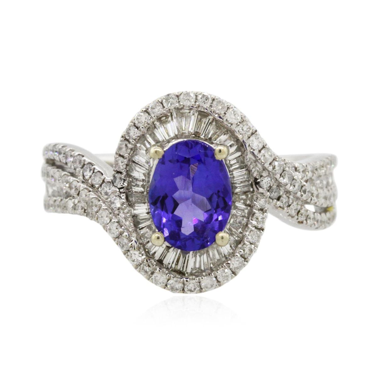 One electronically tested 14KT white gold Ladies combination cast & assembled ring with a bright polish finish. Condition is new. Identified with markings of "14K". Containing: One prong set oval modified brilliant cut natural tanzanite, measuring 7.60 x 5.50 x 3.58mm, approximate weight of 1.03ct., clarity is eye clean, type I, medium, moderately strong, bluish violet color, (GIA bV 5/4), cut is very good. Colored gemstones are presumed to have been subjected to commonly used color/clarity enhancement processes. Ninety-Four bead set round brilliant cut diamonds, measuring 1.10 - 1.10 x 0.66mm (depth est.) approximate. Total Weight of 94 Stones = 0.45ct. Clarity: I-1 to I-2. Color: H - I, Cut is Good. Twenty-Eight channel set baguette cut diamonds, measuring 1.30 x 1.00 x 0.85mm (depth est.) approximate. Total Weight of 28 Stones = 0.28ct. Clarity: SI-1 to SI-2. Color: H - I, Cut is Good. Total Weight of Colored Stones 1.03ct. Total Weight of Diamonds 0.73ct. Total Weight of Ring 5.00 grams. GGL Appraised at $4,895.00.