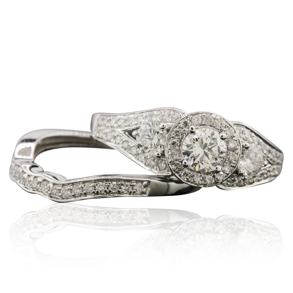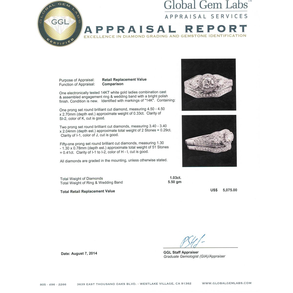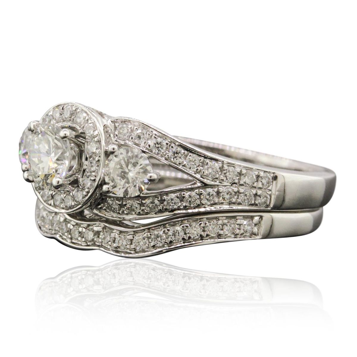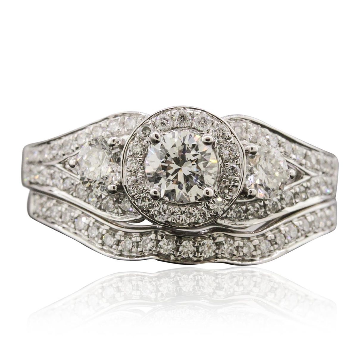 One electronically tested 14KT white gold ladies combination cast & assembled engagement ring & wedding band with a bright polish finish. Identified with markings of "14K". Condition is new. Containing: One prong set round brilliant cut diamond, measuring 4.50 - 4.50 x 2.70mm (depth est.) approximate weight of 0.33ct. Clarity: SI-2. Color: K, Cut is Good. Two prong set round brilliant cut diamonds, measuring 3.40 - 3.40 x 2.04mm (depth est.) approximate total weight of 2 Stones = 0.29ct. Clarity: I-1. Color: J, Cut is Good. Fifty-One prong set round brilliant cut diamonds, measuring 1.30 - 1.30 x 0.78mm (depth est.) approximate total weight of 51 Stones = 0.41ct. Clarity: I-1 to I-2. Color: H - I, Cut is Good. All diamonds are graded in the mounting, unless otherwise stated. Total Weight of Diamonds 1.03ct. Total Weight of Ring & Wedding Band 5.50 grams. GGL Appraised at $5,075.00.