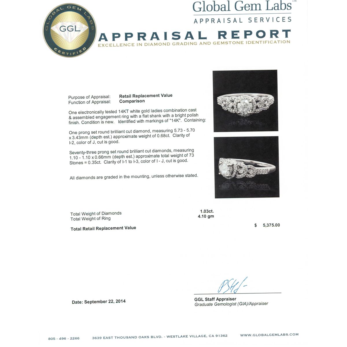 One electronically tested 14KT white gold ladies combination cast & assembled engagement ring with a flat shank with a bright polish finish. Identified with markings of "14K". Condition is new. Containing: One prong set round brilliant cut diamond, measuring 5.73 - 5.70 x 3.43mm (depth est.) approximate weight of 0.68ct. Clarity: I-2. Color: J, Cut is Good. Seventy-Three prong set round brilliant cut diamonds, measuring 1.10 - 1.10 x 0.66mm (depth est.) approximate total weight of 73 Stones = 0.35ct. Clarity: I-1 to I-3. Color: I - J, Cut is Good. All diamonds are graded in the mounting, unless otherwise stated. Total Weight of Diamonds 1.03ct. Total Weight of Ring 4.10 grams. GGL Appraised at $5,375.00.