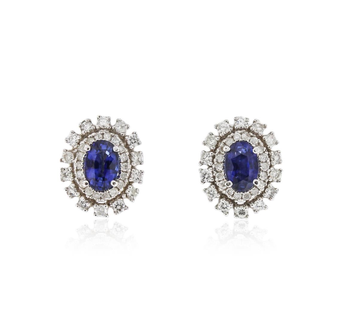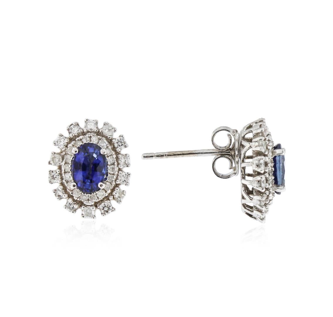 One pair electronically tested 14KT white gold ladies cast sapphire and diamond earrings with friction posts with a bright polish finish. Identified with markings of "K14". Condition is new. Containing: Two prong set oval modified brilliant cut natural blue sapphires, measuring 6.00 x 4.00 x 2.60mm, approximate total weight of 1.04ct., clarity is slightly included, type II, medium, moderately strong, blue color, (GIA B 5/4), cut is good. Sixty-Four prong set round brilliant cut diamonds, measuring 1.50 - 1.00 x 0.75mm (depth est.) approximate total weight of 64 Stones = 0.30ct. Clarity: SI-2 to I-1. Color: I - J, Cut is Good. Colored gemstones are presumed to have been subjected to commonly used enhancement processes. All diamonds and colored gemstones are graded in the mounting, unless otherwise stated. Total Weight of Colored Stones 1.04ct. Total Weight of Diamonds 0.30ct. Total Weight of Earrings 2.70 grams. GGL Appraised at $2,410.00.