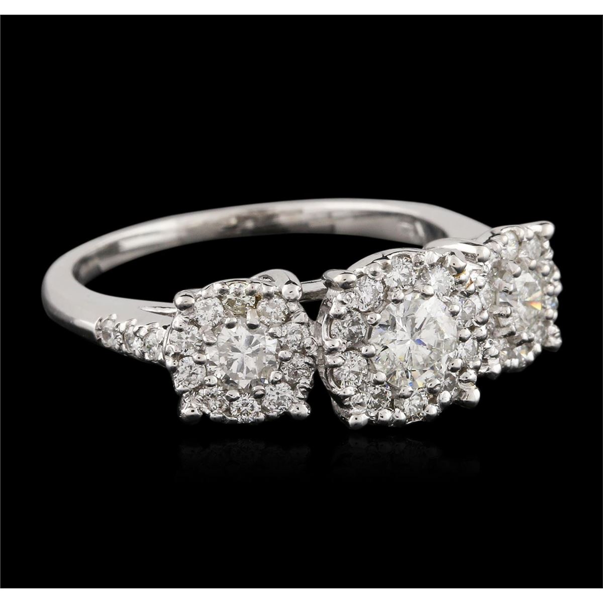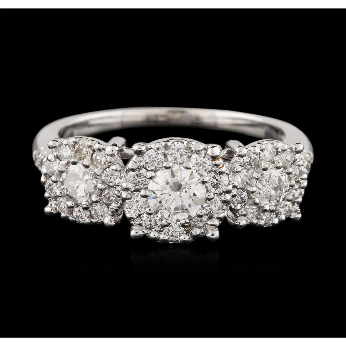One electronically tested 14KT white gold ladies cast diamond engagement ring with a bright polish finish. Identified with markings of "K14". Condition is new. Containing: One prong set round brilliant cut diamond, measuring 4.50 - 4.50 x 2.70mm (depth est.) approximate weight of 0.33ct. Clarity: I-1. Color: J, Cut is Good. Two prong set round brilliant cut diamonds, measuring 3.50 - 3.50 x 2.10mm (depth est.) approximate total weight of 2 Stones = 0.31ct. Clarity: I-1. Color: J, Cut is Good. Thirty-Six prong set round brilliant cut diamonds, measuring 1.60 - 1.30 x 0.87mm (depth est.) approximate total weight of 36 Stones = 0.40ct. Clarity: SI-2 to I-1. Color: I - J, Cut is Good. All diamonds are graded in the mounting, unless otherwise stated. Total Weight of Diamonds 1.05ct. Total Weight of Engagement Ring 4.30 grams. GGL Appraised at $3,065.00.