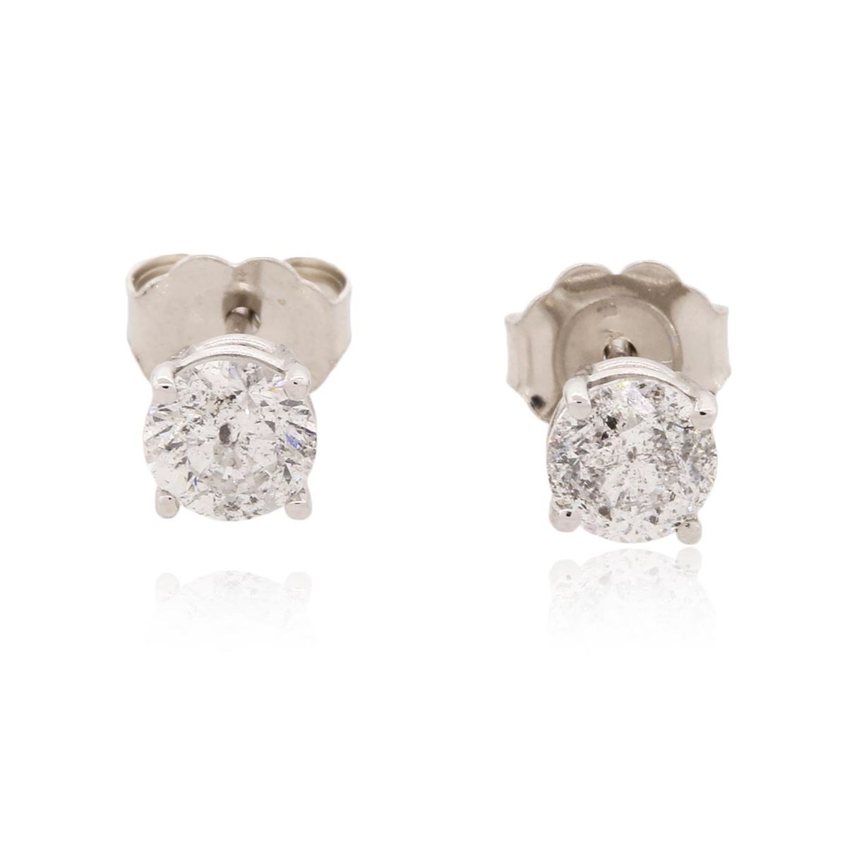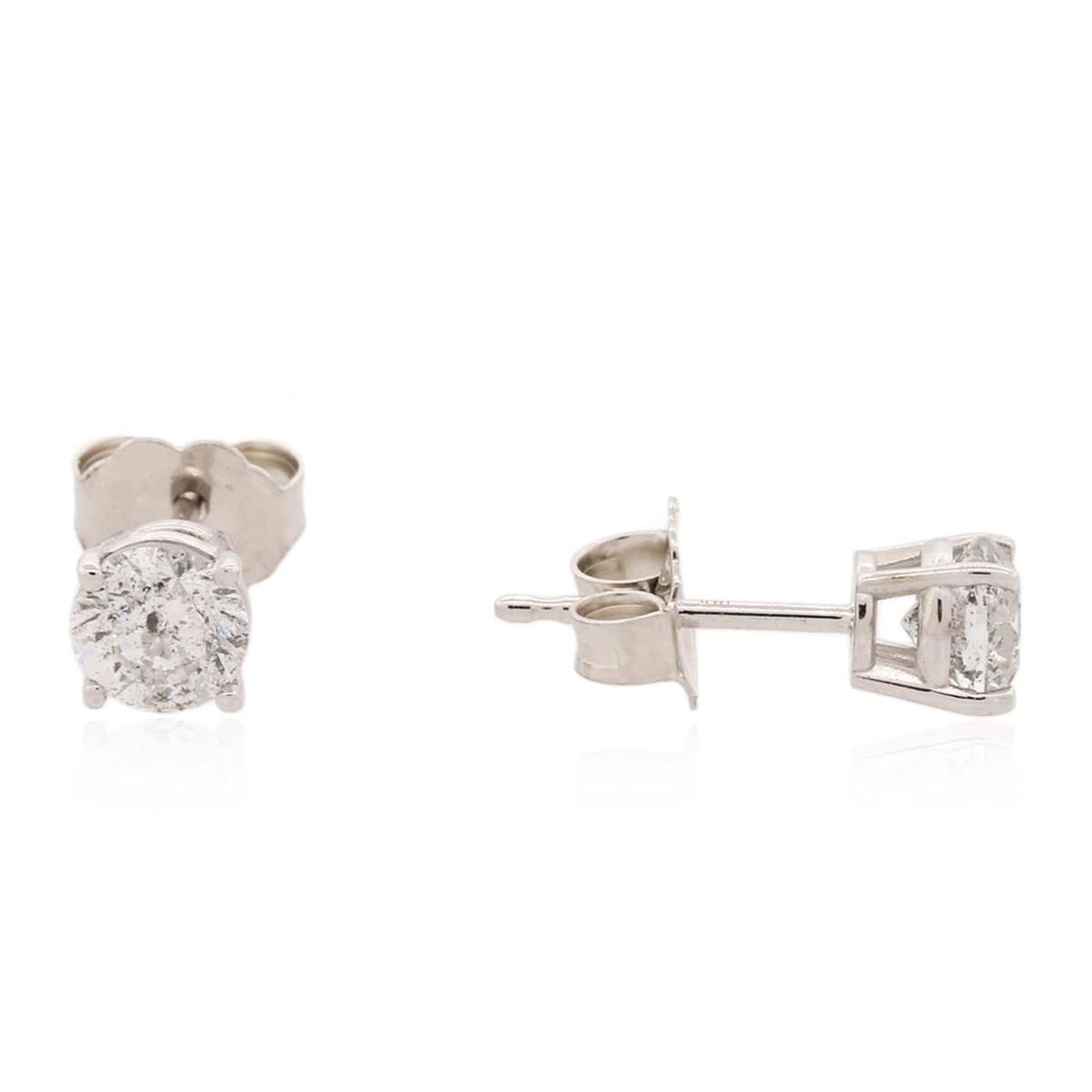 One pair electronically tested 14KT white gold cast & assembled diamond solitaire earrings with standard backs. Bright polish finish. Identified with markings of "14K". Condition is new, good workmanship. Containing: One prong set round brilliant cut diamond, measuring 4.70 - 4.65 x 3.10mm (depth est.), 4.00% GTCF approximate weight of 0.53ct. Graded in the setting. Clarity: I-1. Color: H. Depth 66.2%. Table 57.7%. One prong set round brilliant cut diamond, measuring 4.60 - 4.55 x 3.20mm (depth est.), 4.00% GTCF approximate weight of 0.52ct. Graded in the setting. Clarity: I-1. Color: I. Depth 70.0%. Table 59.1%. Total Weight of Diamonds 1.05ct. Total Weight of Earrings 0.87 grams. AIG Appraised at $5,365.00.
