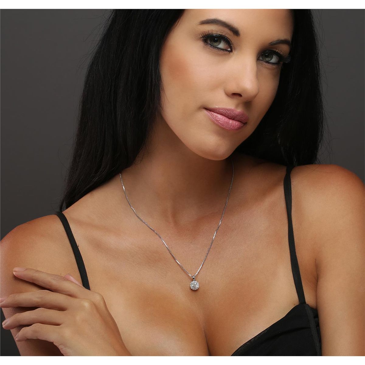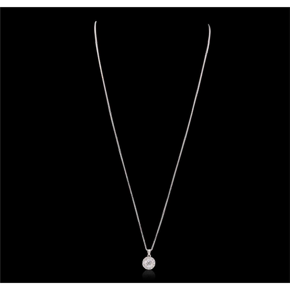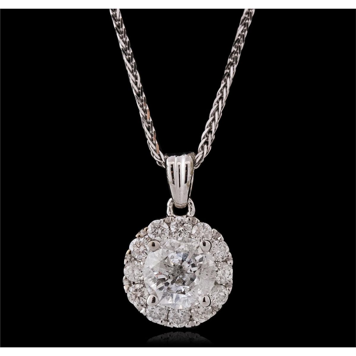 One electronically tested 14KT white gold ladies combination cast & assembled diamond pendant & chain 18.0" long, medium fancy cable with a lobster claw clasp with a bright polish finish. Identified with markings of "14K". Condition is new. Containing: One prong set round brilliant cut diamond, measuring 5.92 - 5.90 x 3.71mm (depth est.) approximate weight of 0.79ct. Clarity: I-2. Color: I, Cut is Good. Twelve prong set round brilliant cut diamonds, measuring 1.80 - 1.80 x 1.08mm (depth est.) approximate total weight of 12 Stones = 0.26ct. Clarity: SI-2 to I-2. Color: H - J, Cut is Good. All diamonds are graded in the mounting, unless otherwise stated. Total Weight of Diamonds 1.05ct. Total Weight of Pendant & Chain 2.60 grams. GGL Appraised at $5,225.00. GGL Appraised at $30,685.00.