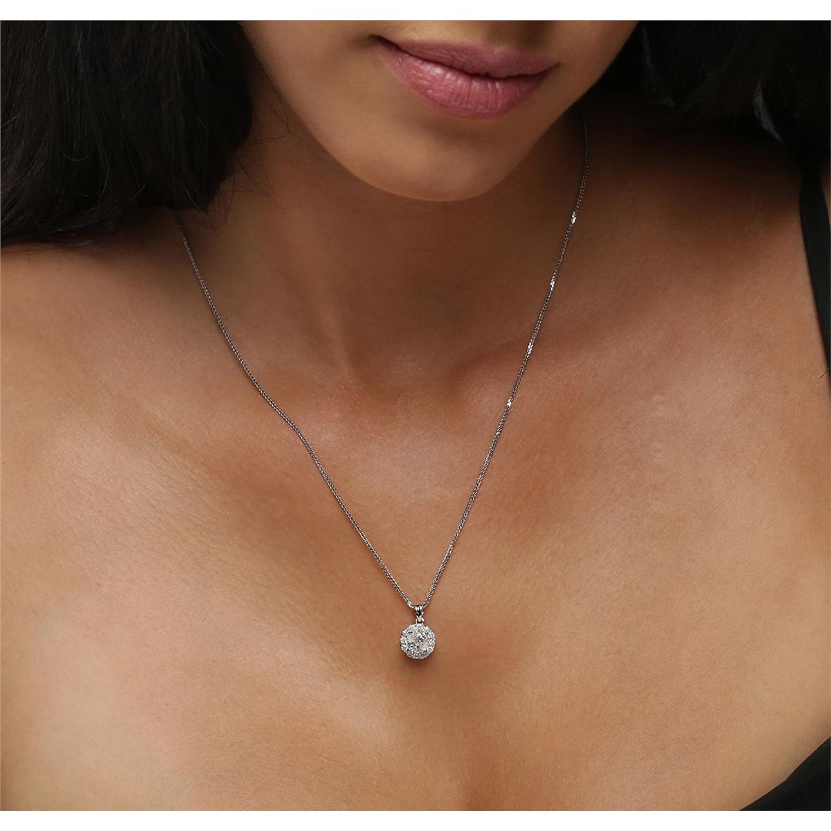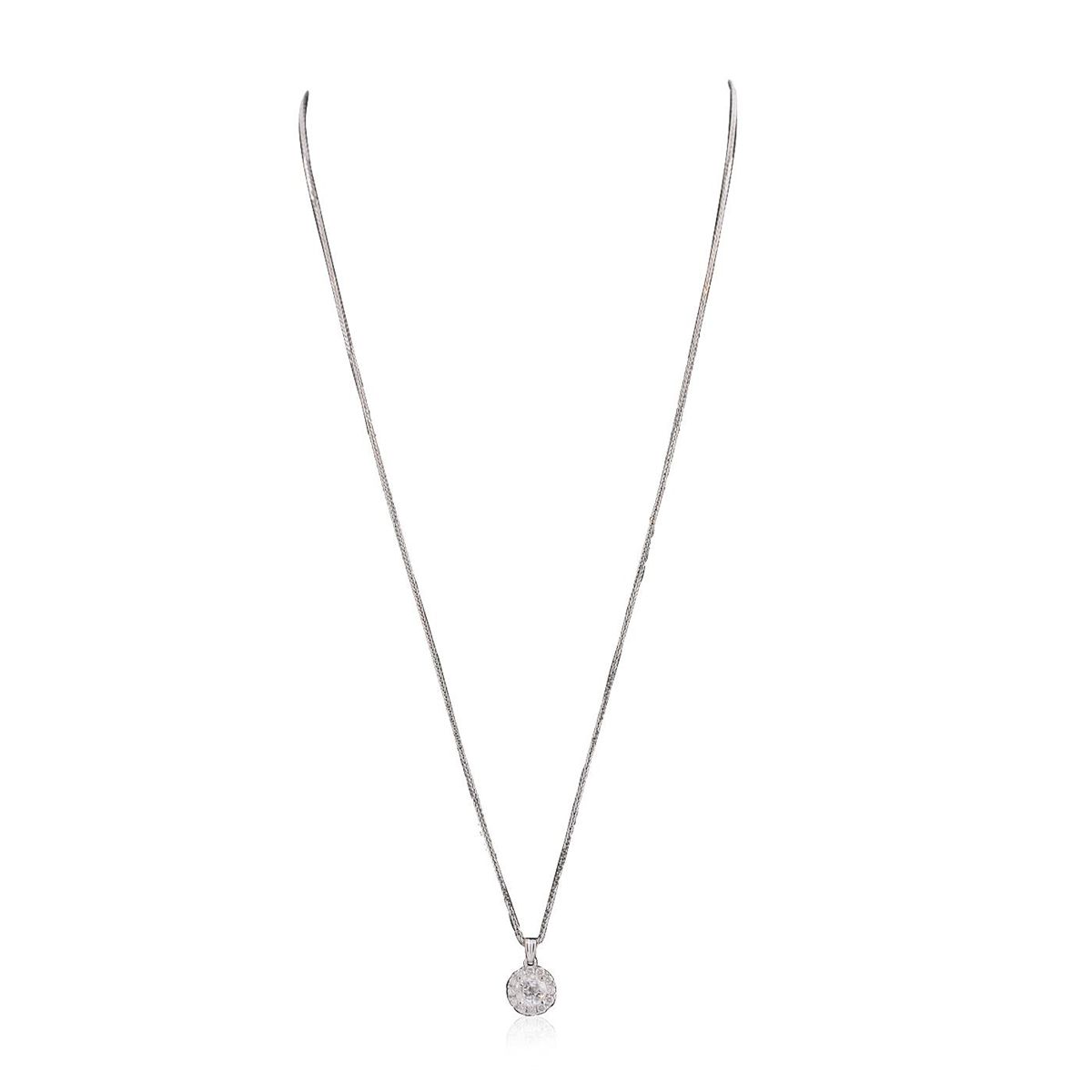 One electronically tested 14KT white gold ladies combination cast & assembled diamond pendant & chain 18.0" long, medium fancy cable with a lobster claw clasp with a bright polish finish. Identified with markings of "14K". Condition is new. Containing: One prong set round brilliant cut diamond, measuring 5.92 - 5.90 x 3.71mm (depth est.) approximate weight of 0.79ct. Clarity: I-2. Color: I, Cut is Good. Twelve prong set round brilliant cut diamonds, measuring 1.80 - 1.80 x 1.08mm (depth est.) approximate total weight of 12 Stones = 0.26ct. Clarity: SI-2 to I-2. Color: H - J, Cut is Good. All diamonds are graded in the mounting, unless otherwise stated. Total Weight of Diamonds 1.05ct. Total Weight of Pendant & Chain 2.60 grams. GGL Appraised at $5,225.00.