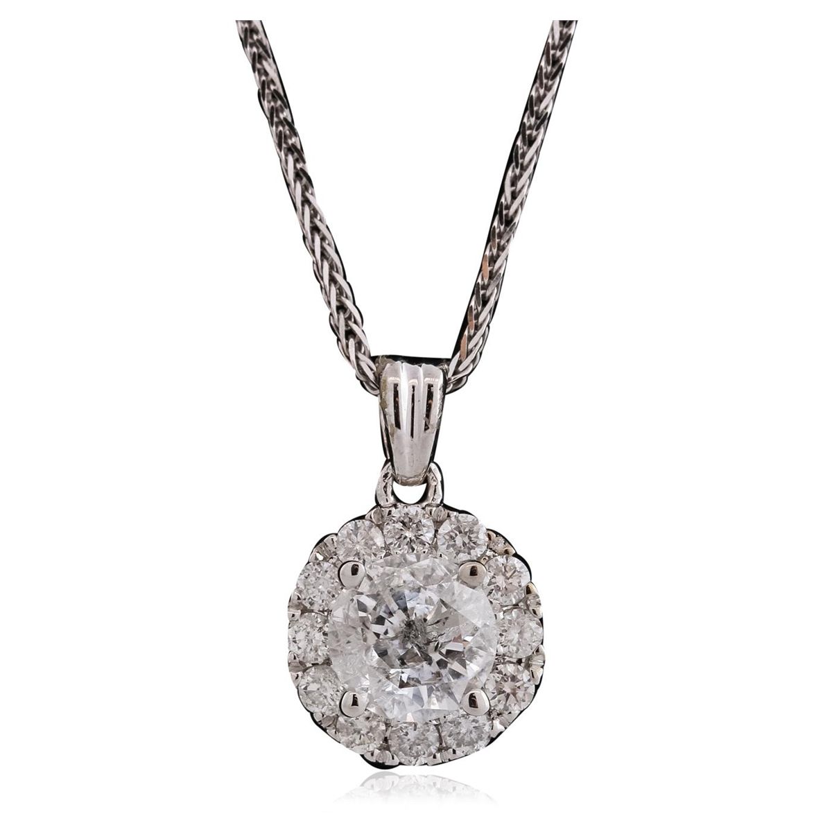 One electronically tested 14KT white gold ladies combination cast & assembled diamond pendant & chain 18.0" long, medium fancy cable with a lobster claw clasp with a bright polish finish. Identified with markings of "14K". Condition is new. Containing: One prong set round brilliant cut diamond, measuring 5.92 - 5.90 x 3.71mm (depth est.) approximate weight of 0.79ct. Clarity: I-2. Color: I, Cut is Good. Twelve prong set round brilliant cut diamonds, measuring 1.80 - 1.80 x 1.08mm (depth est.) approximate total weight of 12 Stones = 0.26ct. Clarity: SI-2 to I-2. Color: H - J, Cut is Good. All diamonds are graded in the mounting, unless otherwise stated. Total Weight of Diamonds 1.05ct. Total Weight of Pendant & Chain 2.60 grams. GGL Appraised at $5,225.00.