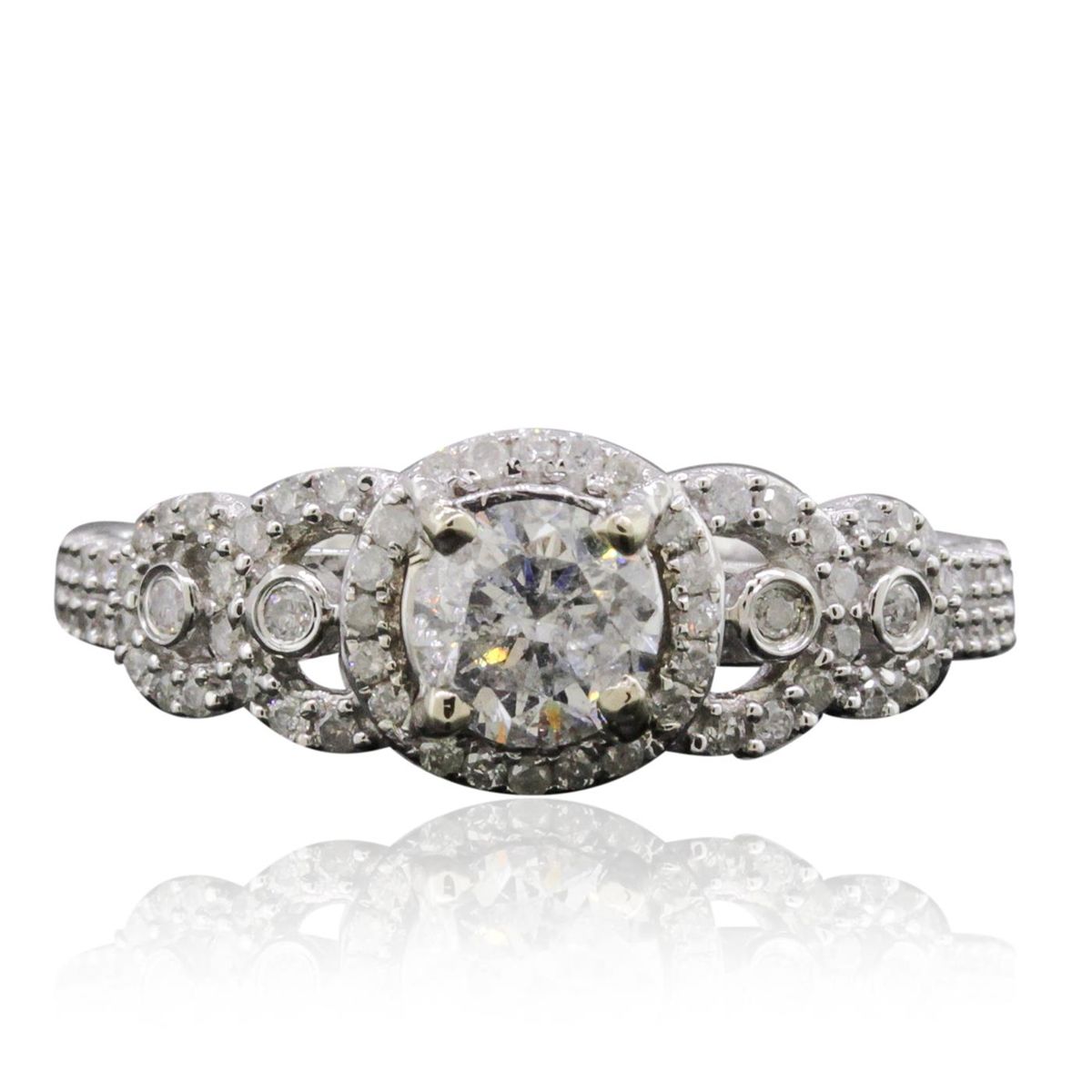 One electronically tested 14KT white gold ladies combination cast & assembled engagement ring with a flat shank with a bright polish finish. Identified with markings of "14K". Condition is new. Containing: One prong set round brilliant cut diamond, measuring 5.75 - 5.75 x 3.45mm (depth est.) approximate weight of 0.70ct. Clarity: I-2. Color: G, Cut is Good. Seventy-Three prong set round brilliant cut diamonds, measuring 1.10 - 1.10 x 0.66mm (depth est.) approximate total weight of 73 Stones = 0.35ct. Clarity: I-1 to I-2. Color: H - I, Cut is Good. All diamonds are graded in the mounting, unless otherwise stated. Total Weight of Diamonds 1.05ct. Total Weight of Ring 4.20 grams. GGL Appraised at $6,460.00. GGL Appraised at $25,150.00.