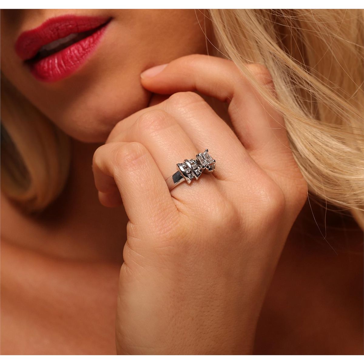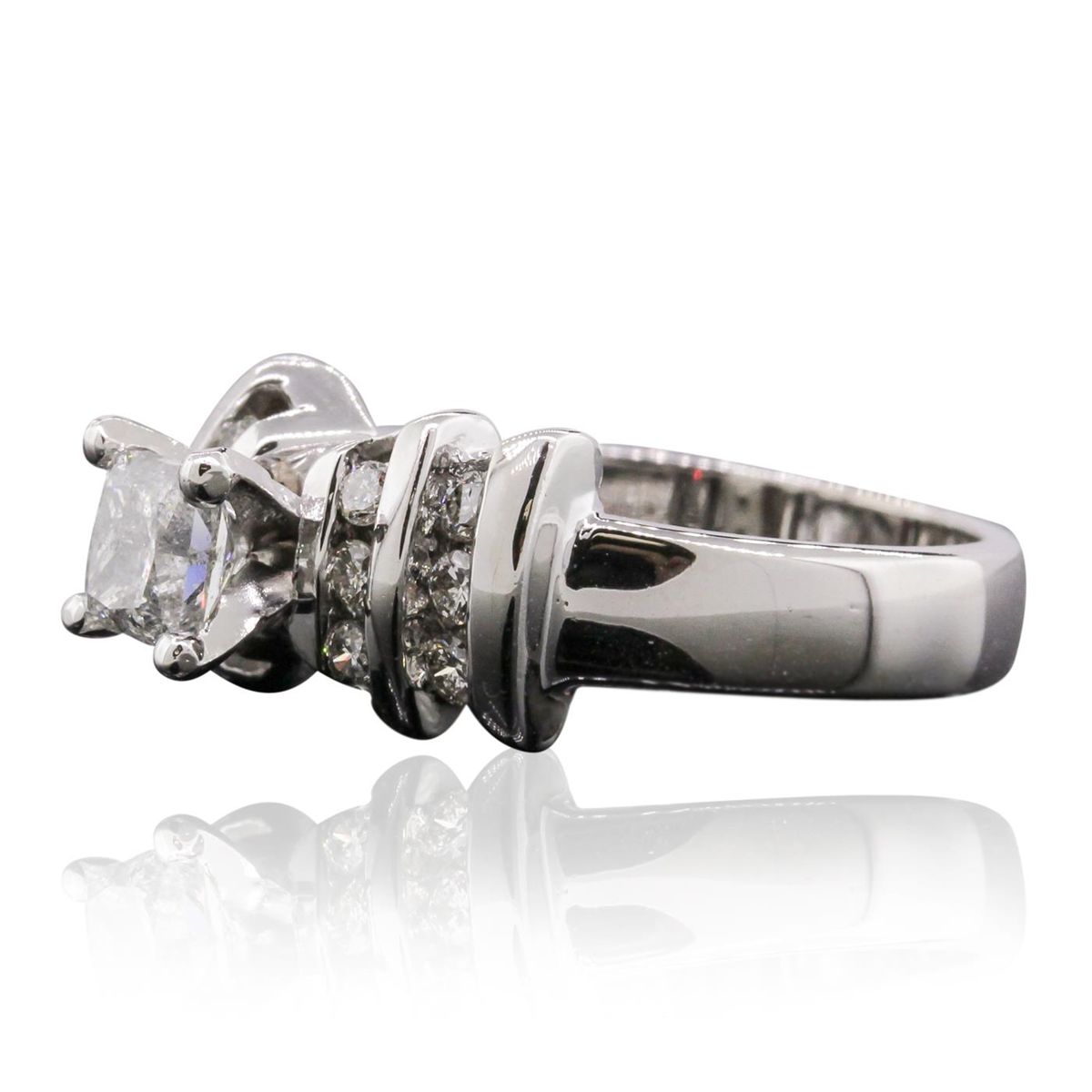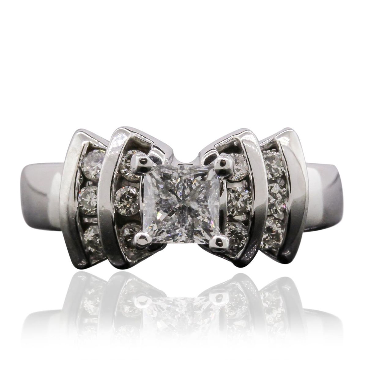 One electronically tested 14KT white gold ladies cast & assembled diamond ring with a bright polish finish. Condition is new, good workmanship. The featured diamond is supported by elaborate diamond set shoulders, completed by a four millimeter wide band. Identified with markings of "14K". Containing: One prong set princess cut diamond, measuring 4.50 x 4.35 x 3.70mm (depth est.), 10.00.%. GTCF approximate weight of 0.71ct. Graded in the setting. Clarity: I-1. Color: H Depth 85.1%. Table 71.3%. Twelve channel set round brilliant cut diamonds, measuring 1.80 - 1.70 x 1.05mm (depth est.) approximate. Total Weight of 12 Stones = 0.34ct. Graded in the setting. Clarity: SI-1 to I-1. Color: G - I. Total Weight of Diamonds 1.05ct. Total Weight of Ring 5.83 grams. AIG Appraised at $7,535.00.