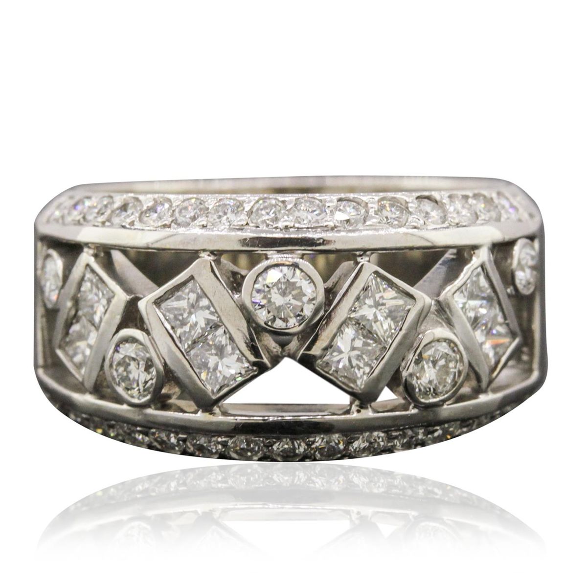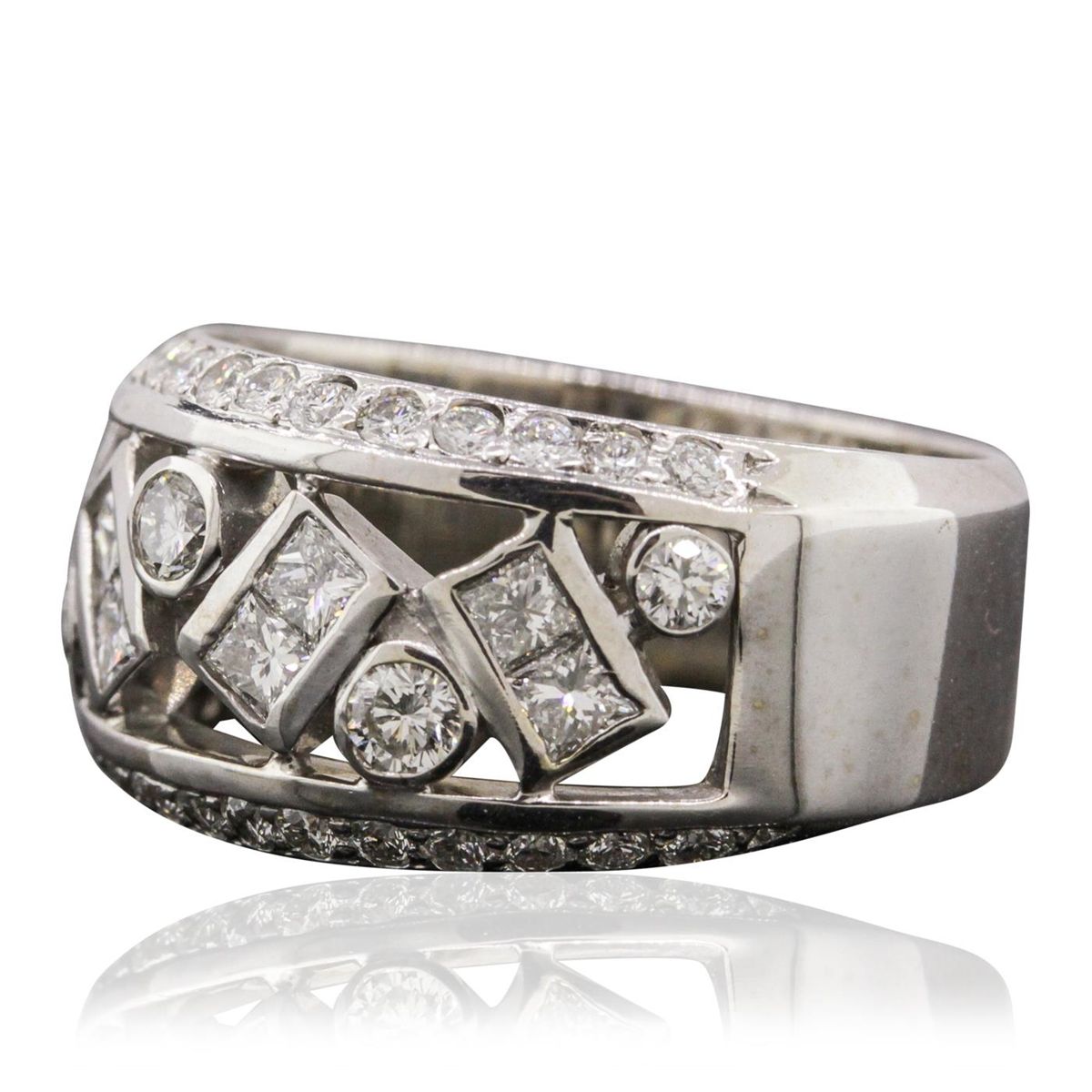 One electronically tested 14KT white gold Ladies combination cast & assembled ring with a bright polish finish. Condition is very good. Identified with markings of "14K". Containing: Eight channel set princess cut diamonds, measuring 2.00 x 2.00 x 1.50mm (depth est.) approximate. Total Weight of 8 Stones = 0.39ct. Clarity: VS-2. Color: H - I, Cut is Good. Five bezel set round brilliant cut diamonds, measuring 2.50 - 2.50 x 1.50mm (depth est.) approximate. Total Weight of 5 Stones = 0.29ct. Clarity: SI-1 to SI-2. Color: H - I, Cut is Good. Thirty bead set round brilliant cut diamonds, measuring 1.50 - 1.50 x 0.90mm (depth est.) approximate. Total Weight of 30 Stones = 0.37ct. Clarity: SI-1 to SI-2. Color: H - I, Cut is Good. All diamonds are graded in the mounting, unless otherwise stated. Total Weight of Diamonds 1.05ct. Total Weight of Ring 7.50 grams.. GGL Appraised at $5,570.00.