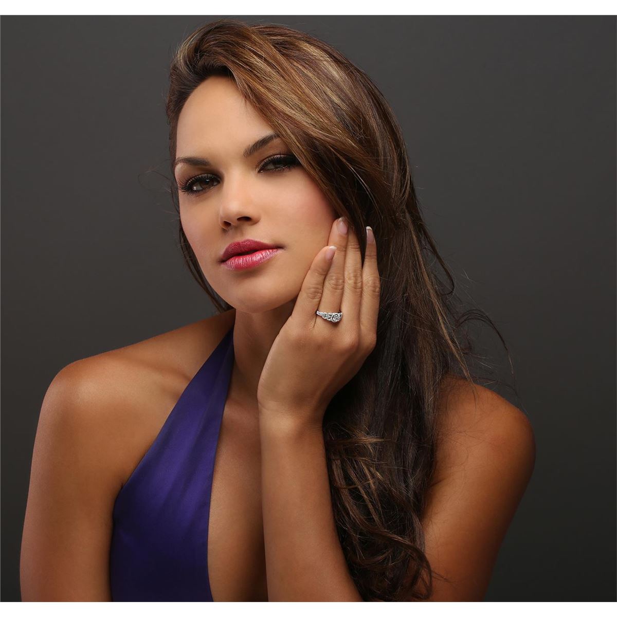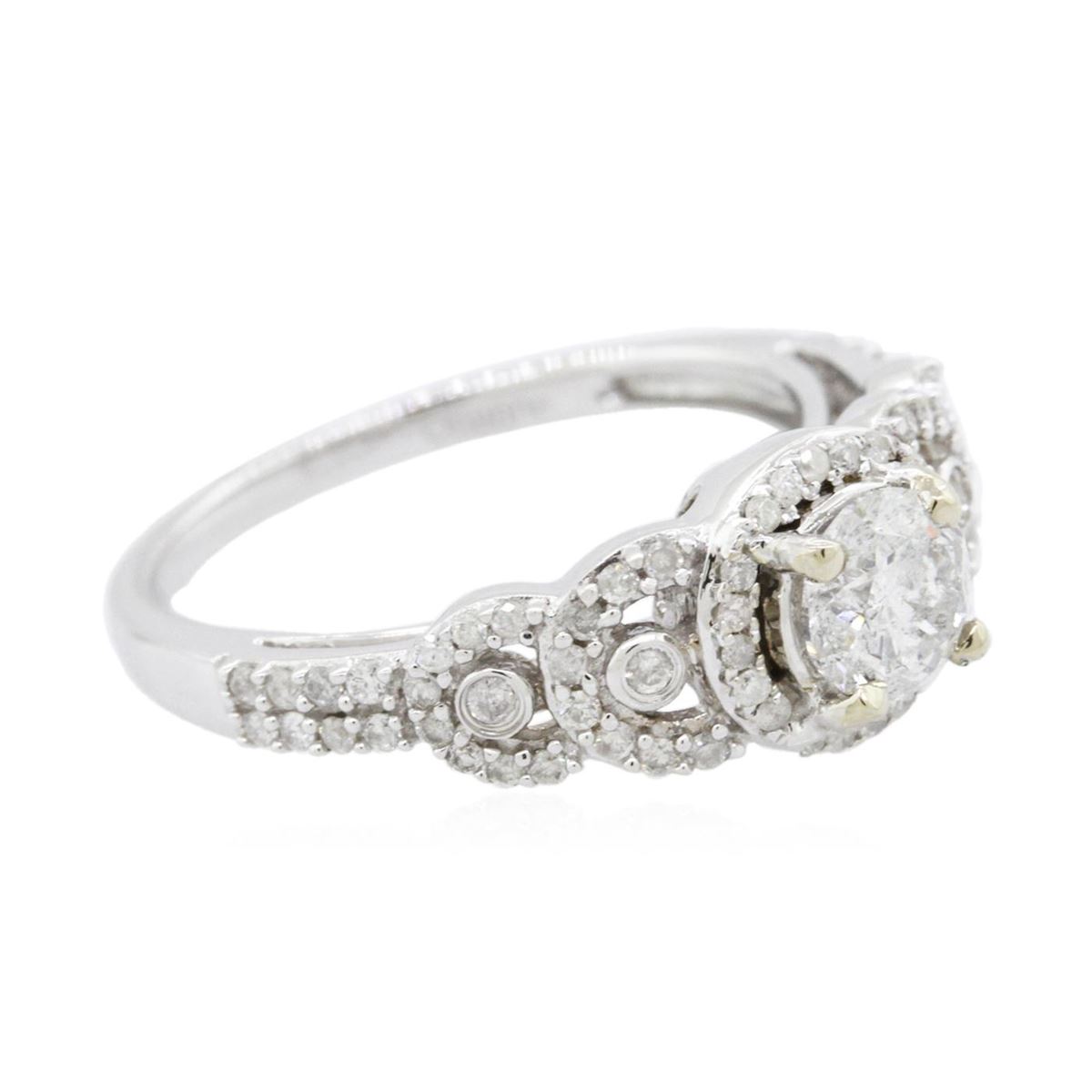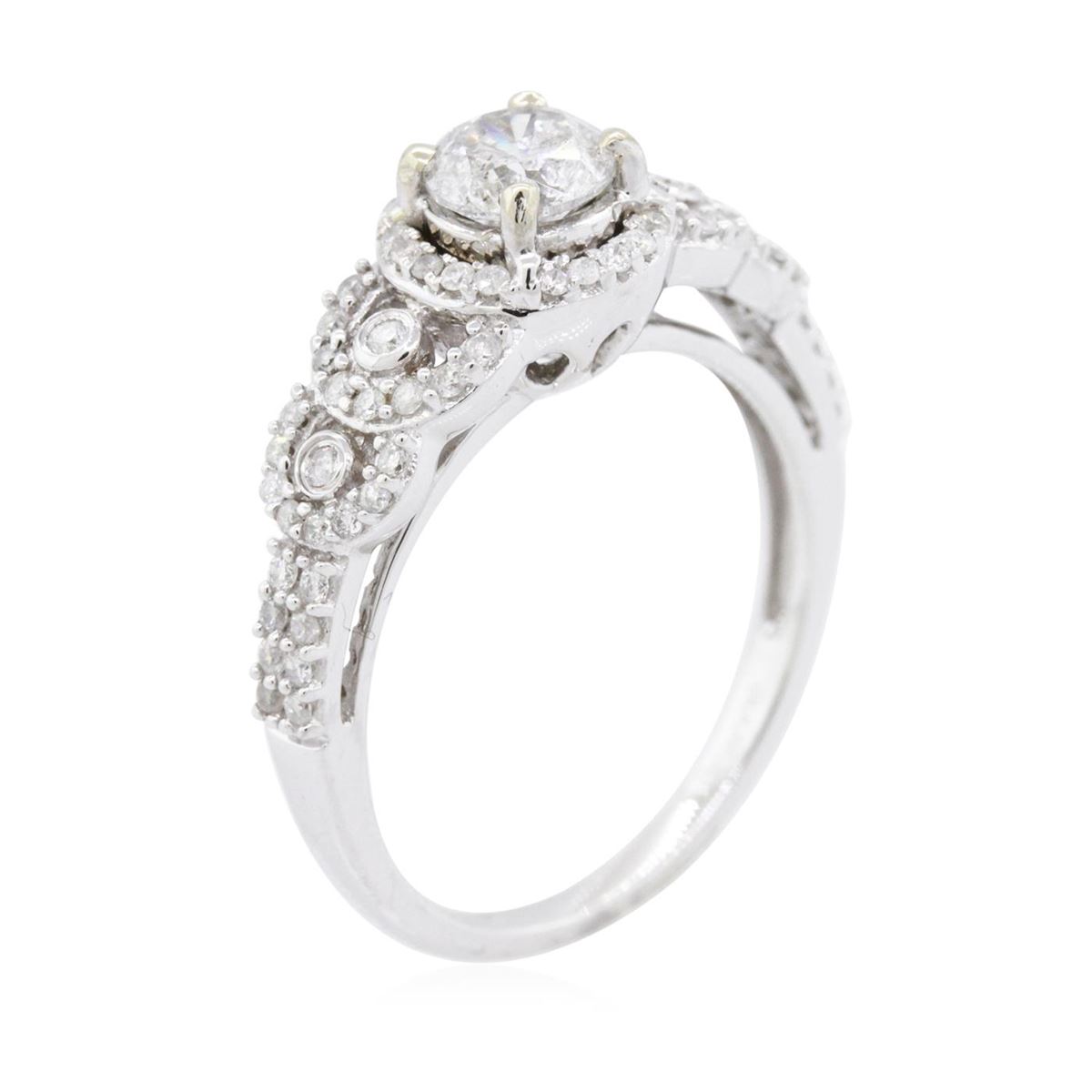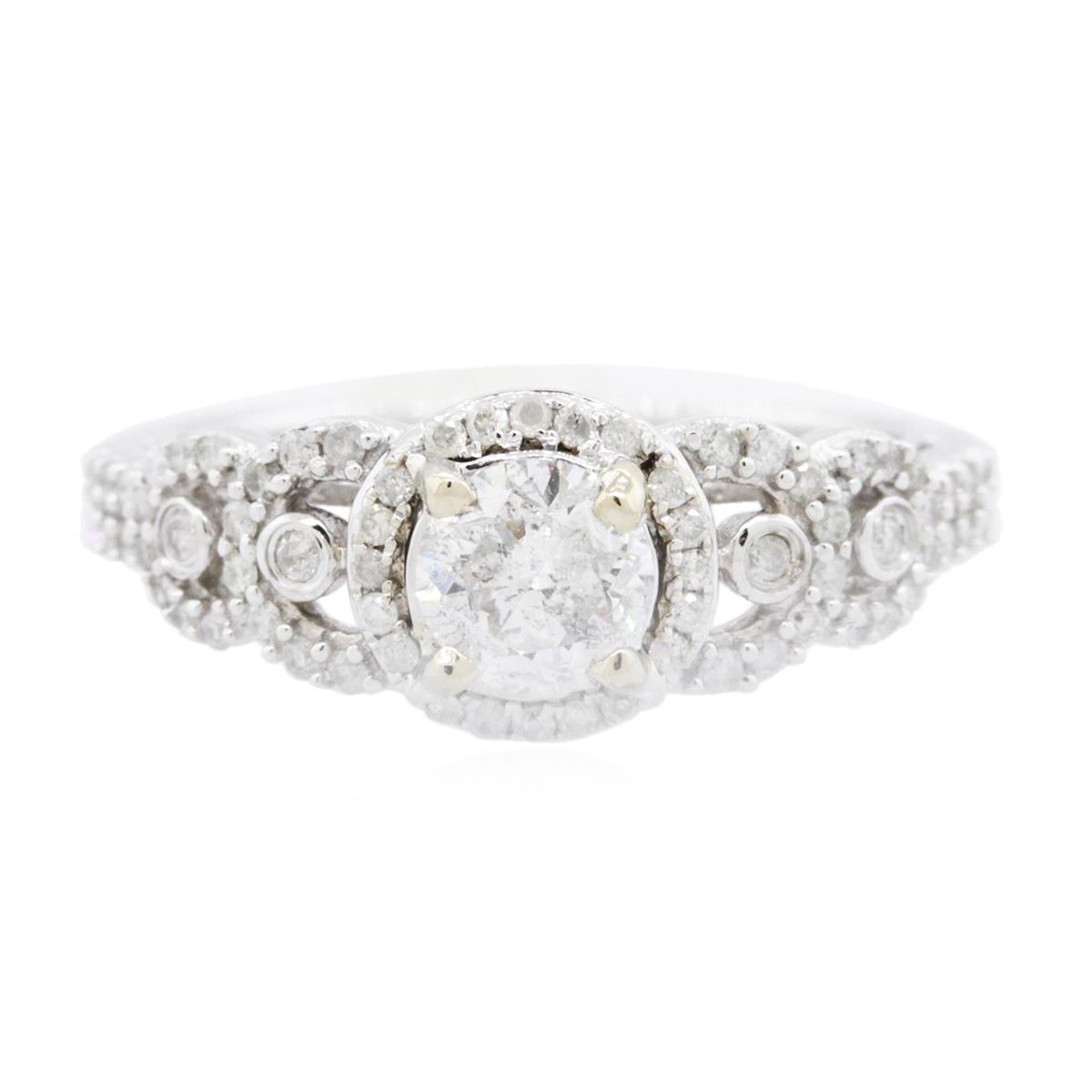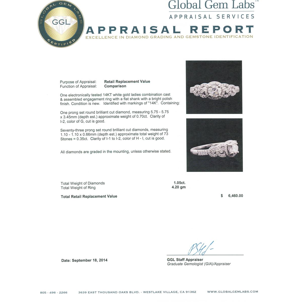 One electronically tested 14KT white gold ladies combination cast & assembled engagement ring with a flat shank with a bright polish finish. Identified with markings of "14K". Condition is new. Containing: One prong set round brilliant cut diamond, measuring 5.75 - 5.75 x 3.45mm (depth est.) approximate weight of 0.70ct. Clarity: I-2. Color: G, Cut is Good. Seventy-Three prong set round brilliant cut diamonds, measuring 1.10 - 1.10 x 0.66mm (depth est.) approximate total weight of 73 Stones = 0.35ct. Clarity: I-1 to I-2. Color: H - I, Cut is Good. All diamonds are graded in the mounting, unless otherwise stated. Total Weight of Diamonds 1.05ct. Total Weight of Ring 4.20 grams. GGL Appraised at $6,460.00.