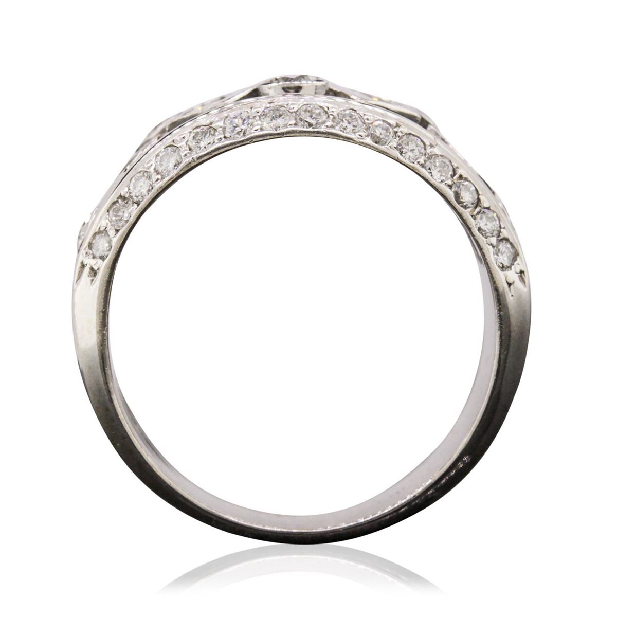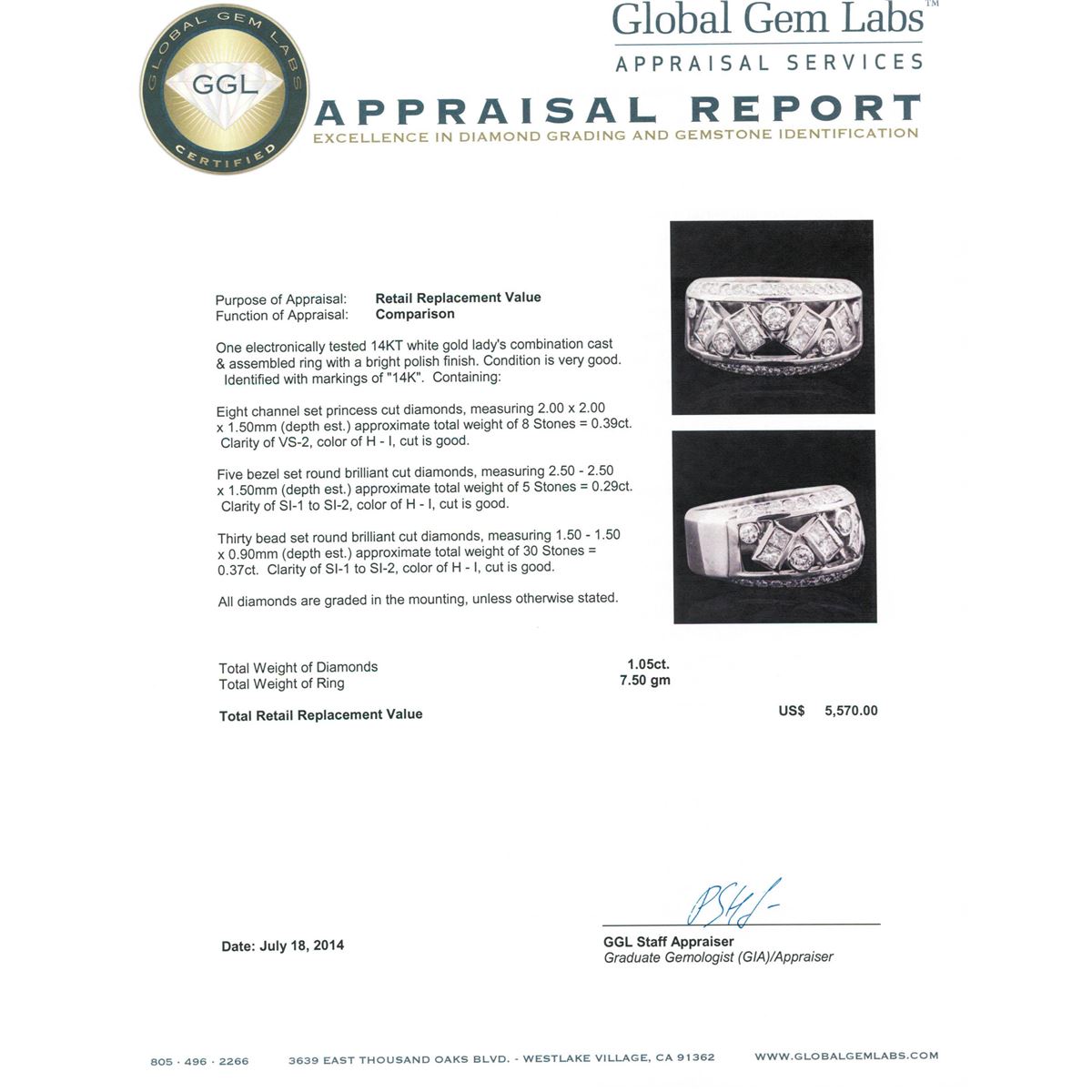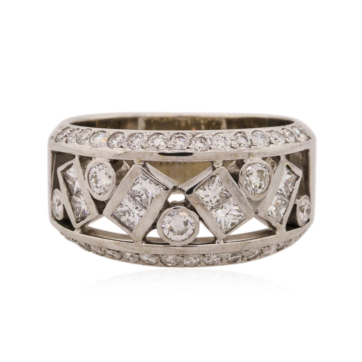 One electronically tested 14KT white gold Ladies combination cast & assembled ring with a bright polish finish. Condition is very good. Identified with markings of "14K". Containing: Eight channel set princess cut diamonds, measuring 2.00 x 2.00 x 1.50mm (depth est.) approximate. Total Weight of 8 Stones = 0.39ct. Clarity: VS-2. Color: H - I, Cut is Good. Five bezel set round brilliant cut diamonds, measuring 2.50 - 2.50 x 1.50mm (depth est.) approximate. Total Weight of 5 Stones = 0.29ct. Clarity: SI-1 to SI-2. Color: H - I, Cut is Good. Thirty bead set round brilliant cut diamonds, measuring 1.50 - 1.50 x 0.90mm (depth est.) approximate. Total Weight of 30 Stones = 0.37ct. Clarity: SI-1 to SI-2. Color: H - I, Cut is Good. All diamonds are graded in the mounting, unless otherwise stated. Total Weight of Diamonds 1.05ct. Total Weight of Ring 7.50 grams.. GGL Appraised at $5,570.00.