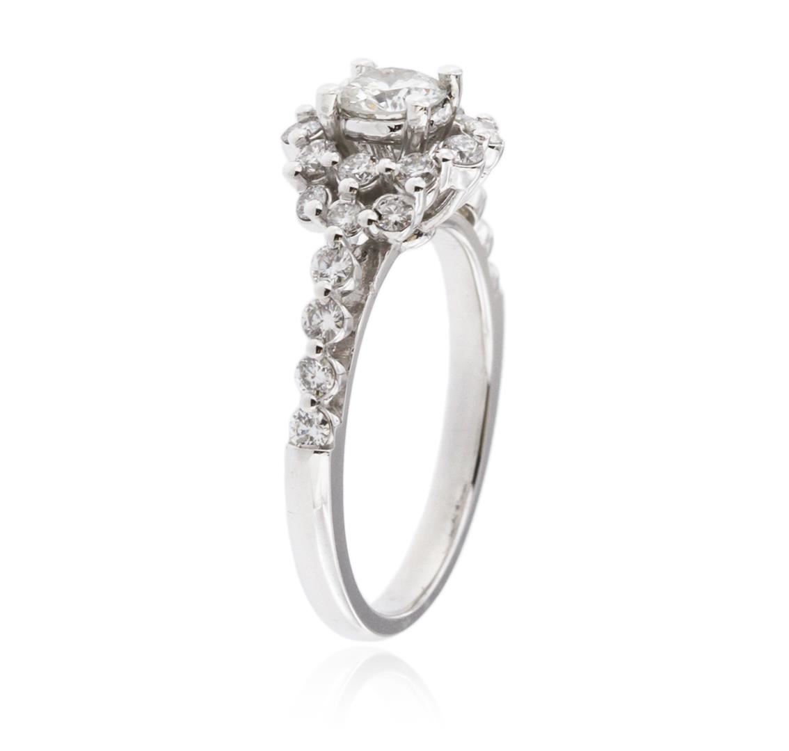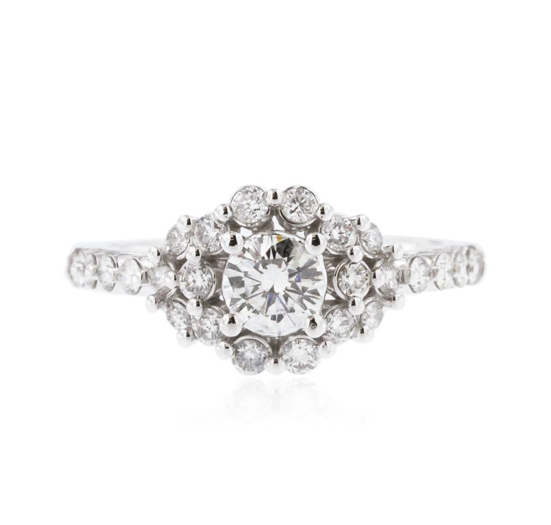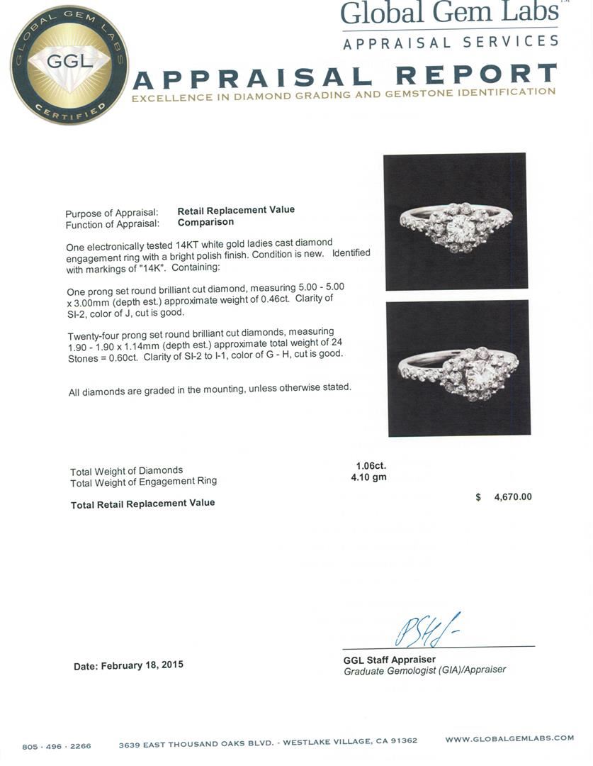 One electronically tested 14KT white gold ladies cast diamond engagement ring with a bright polish finish. Identified with markings of "14K". Condition is new. Containing: One prong set round brilliant cut diamond, measuring 5.00 - 5.00 x 3.00mm (depth est.) approximate weight of 0.46ct. Clarity: SI-2. Color: J, Cut is Good. Twenty-Four prong set round brilliant cut diamonds, measuring 1.90 - 1.90 x 1.14mm (depth est.) approximate total weight of 24 Stones = 0.60ct. Clarity: SI-2 to I-1. Color: G - H, Cut is Good. All diamonds are graded in the mounting, unless otherwise stated. Total Weight of Diamonds 1.06ct. Total Weight of Engagement Ring 4.10 grams. GGL Appraised at $4,670.00.