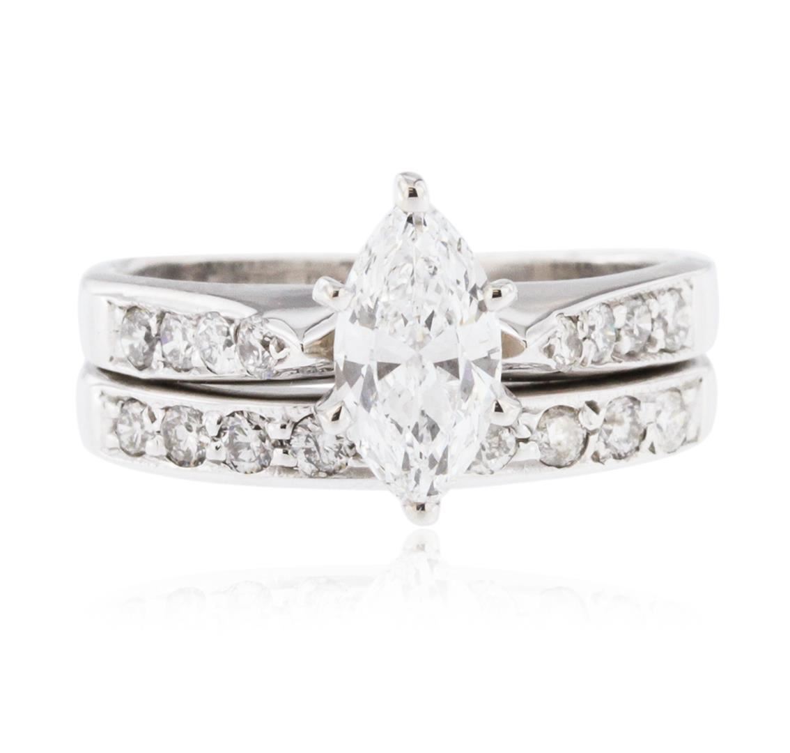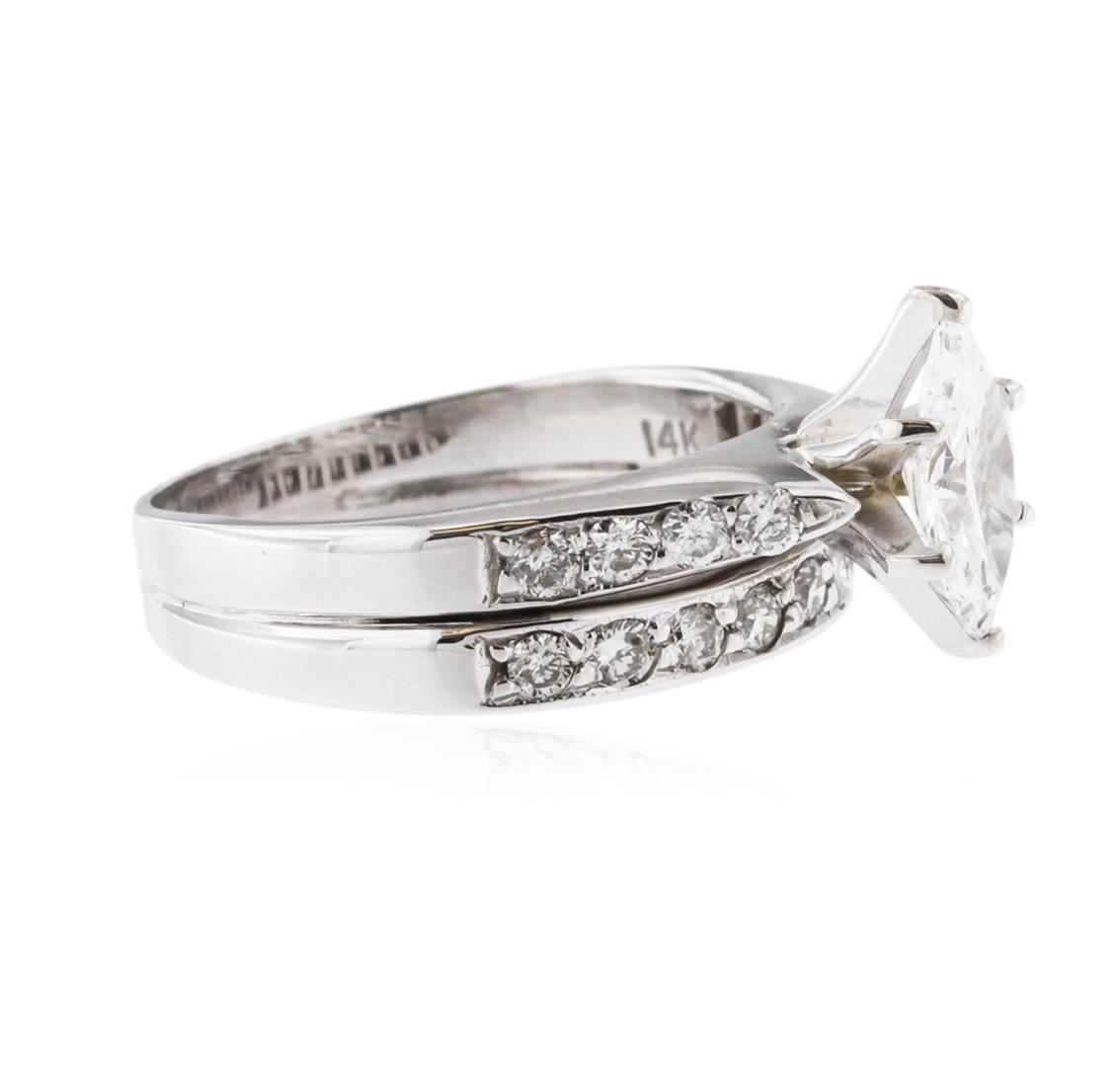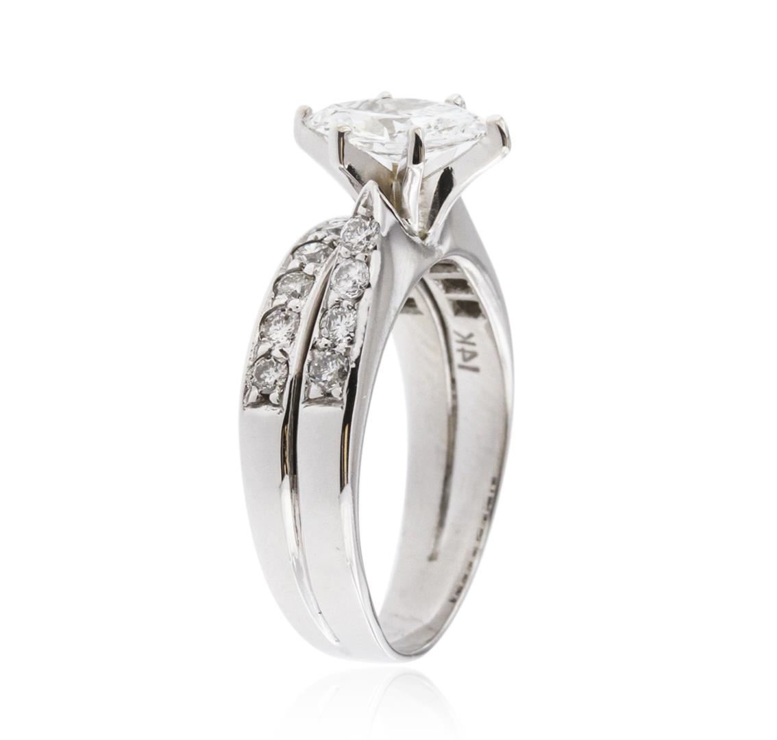 One electronically tested 14KT white gold ladies cast diamond engagement ring with a bright polish finish. Identified with markings of "14K". Condition is new. Containing: One prong set marquise shaped cut diamond, measuring 9.20 x 4.80 x 3.03mm (depth est.) approximate weight of 0.78ct. Clarity: SI-2. Color: J, Cut is Good. Seventeen prong set round brilliant cut diamonds, measuring 1.80 - 1.50 x 0.99mm (depth est.) approximate total weight of 17 Stones = 0.28ct. Clarity: SI-1 to I-1. Color: J - K, Cut is Good. All diamonds are graded in the mounting, unless otherwise stated. Total Weight of Diamonds 1.06ct. Total Weight of Engagement Ring 5.40 grams. GGL Appraised at $5,080.00.