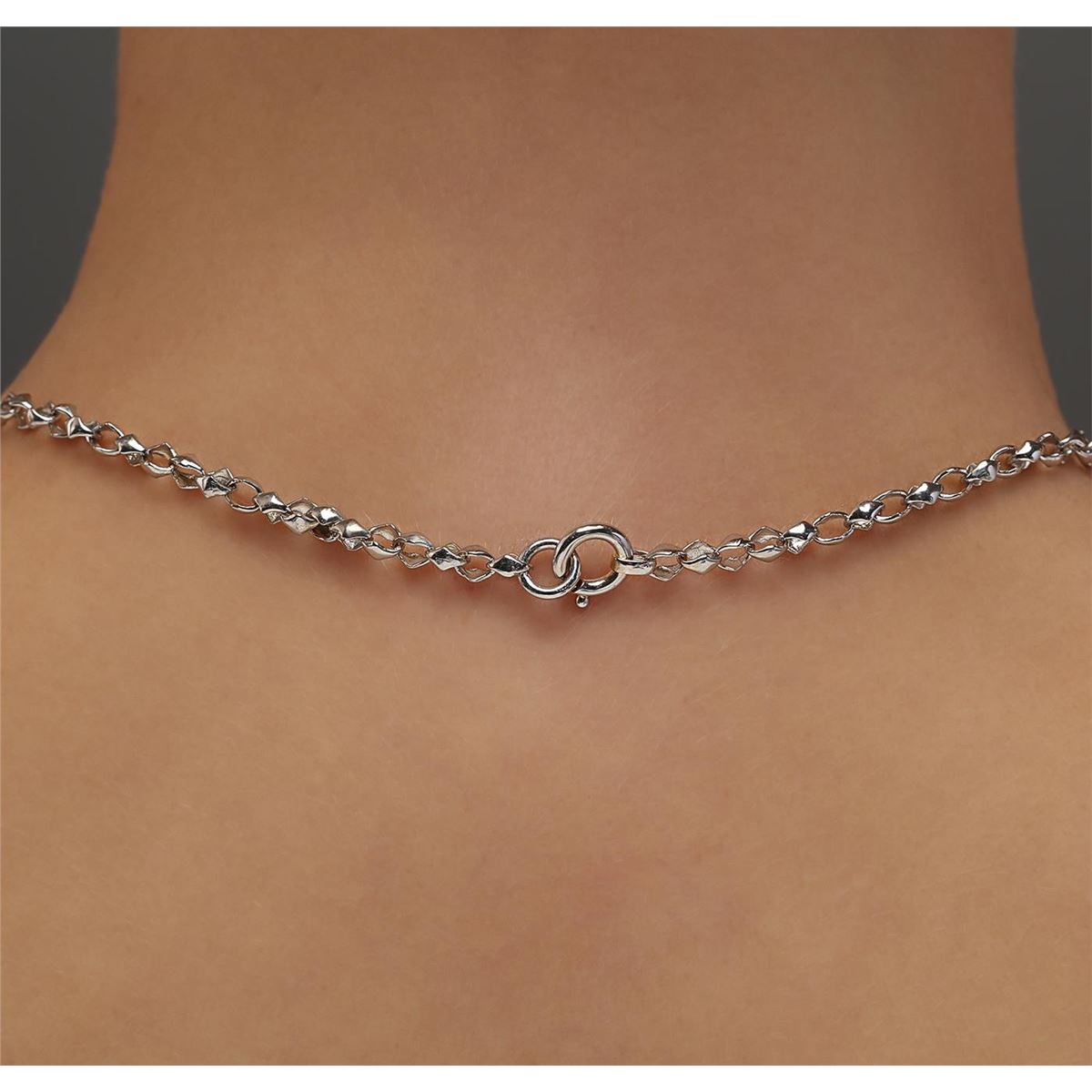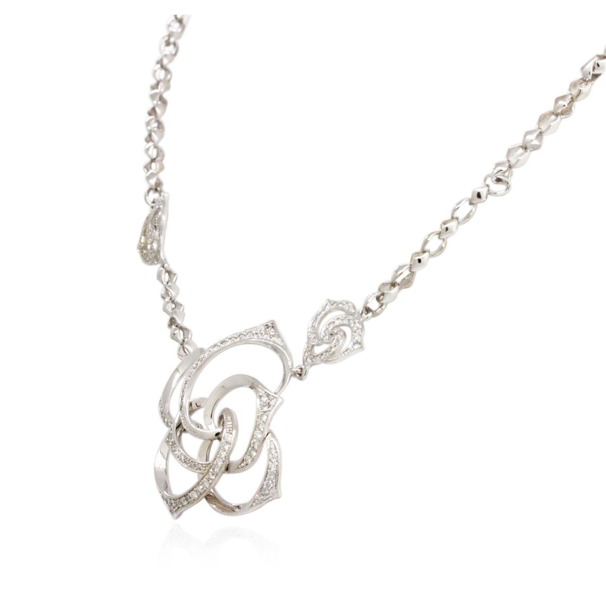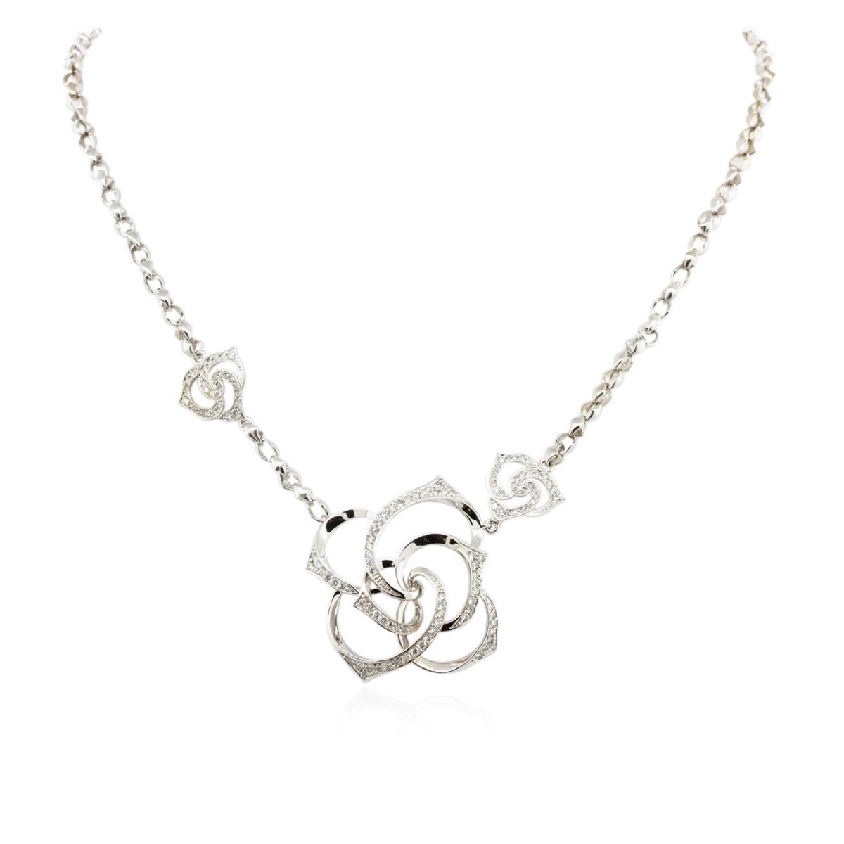 One electronically tested 14KT white gold ladies cast diamond necklace with a spring ring clasp with a bright polish finish. Measurements: 18" in length Identified with markings of "585". Condition is new. Containing: One Hundred Thirty-Three bead set round brilliant cut diamonds, measuring 1.30 - 1.30 x 0.78mm (depth est.) approximate total weight of 133 Stones = 1.06ct. Clarity: SI-1 to I-1. Color: I - J, Cut is Good. All diamonds are graded in the mounting, unless otherwise stated. Total Weight of Diamonds 1.06ct. Total Weight of Necklace 17.50 grams. GGL Appraised at $5,745.00.