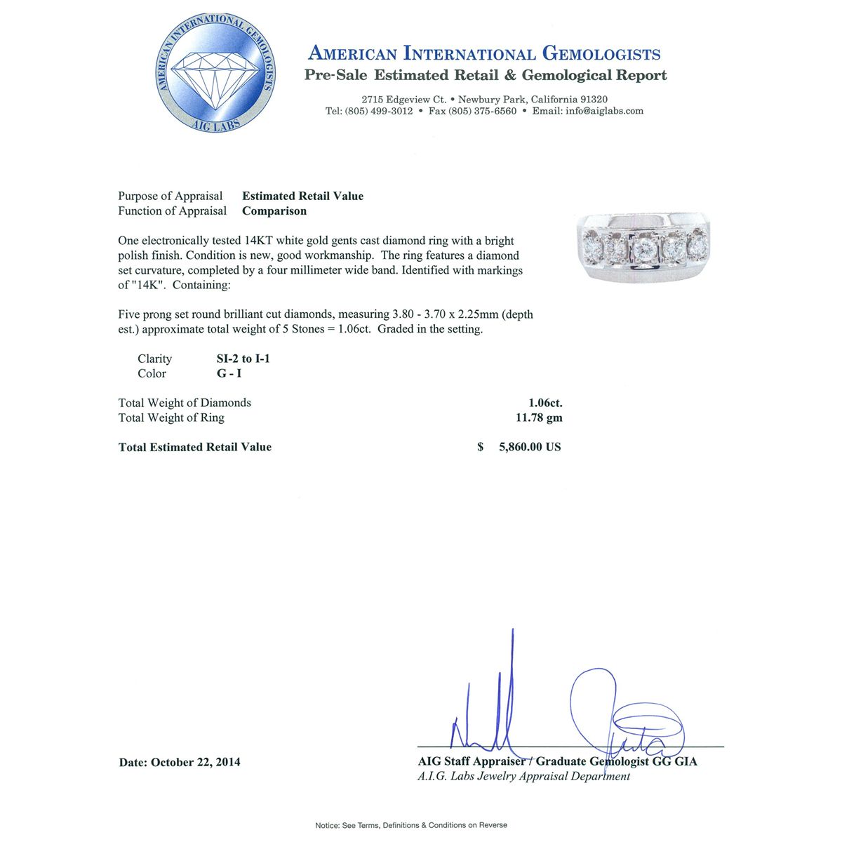 One electronically tested 14KT white gold gents cast diamond ring with a bright polish finish. The ring features a diamond set curvature, completed by a four millimeter wide band. Identified with markings of 14K. Condition is new, good workmanship. Containing: Five prong set round brilliant cut diamonds, measuring 3.80 - 3.70 x 2.25mm (depth est.) approximate total weight of 5 Stones = 1.06ct. Graded in the setting. Clarity: SI-2 to I-1. Color: G - I. Total Weight of Diamonds 1.06ct. Total Weight of Ring 11.78 grams. AIG Appraised at $5,860.00.