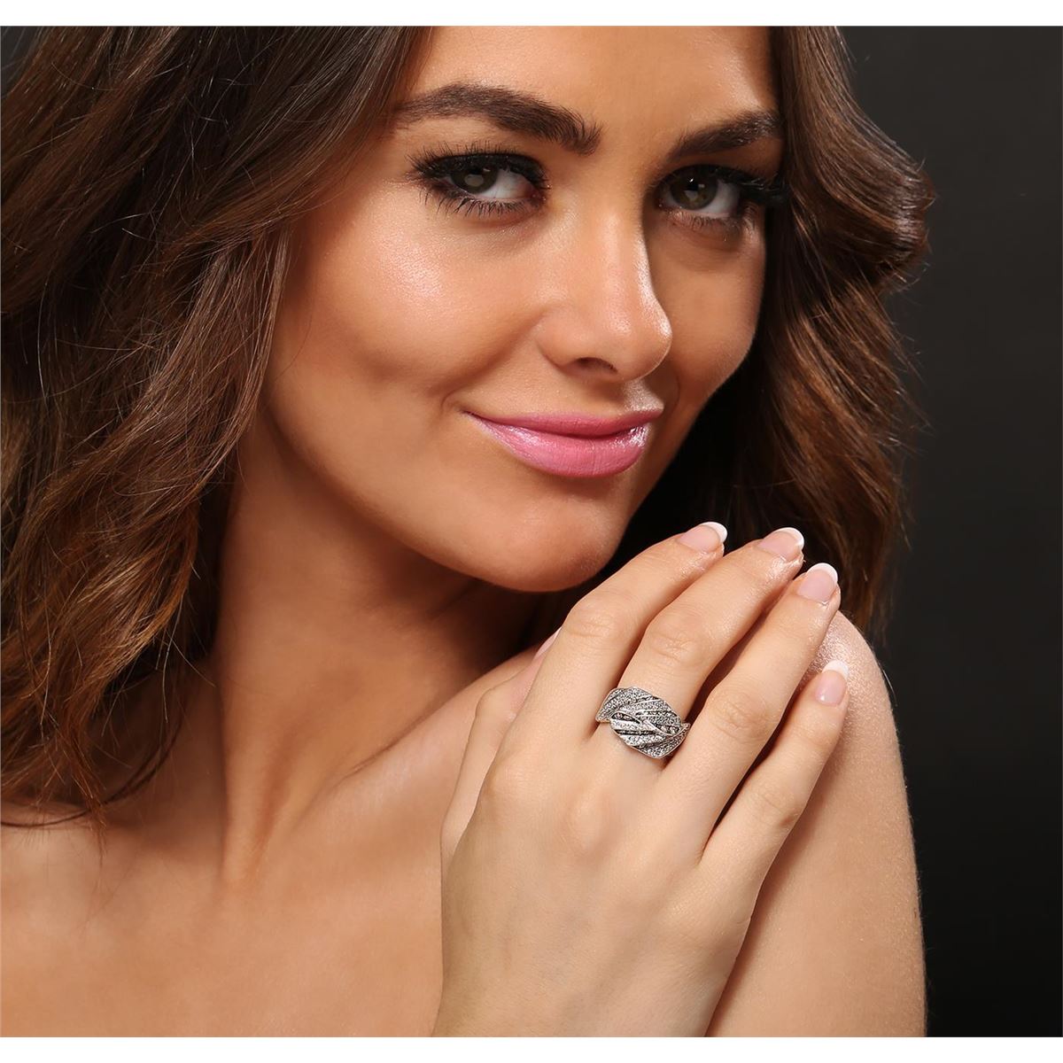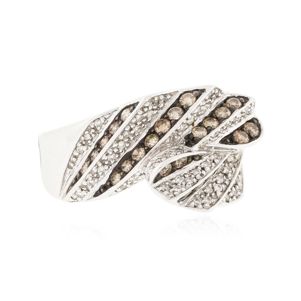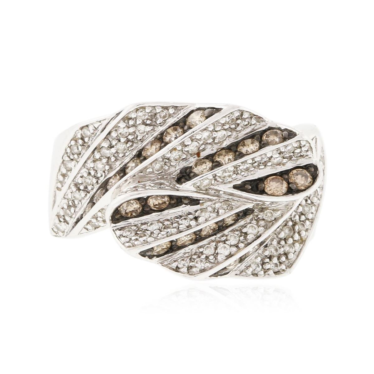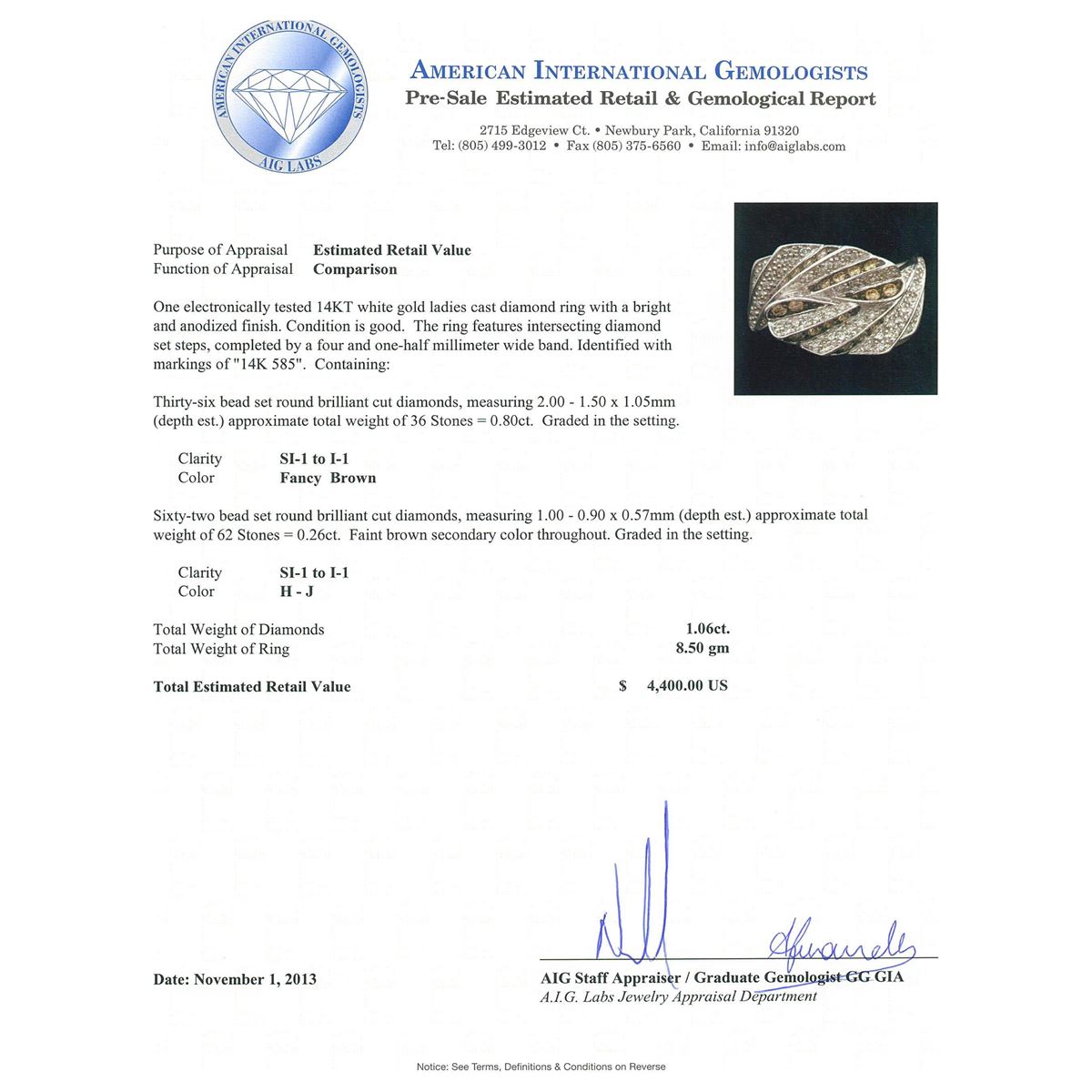 One electronically tested 14KT white gold ladies cast diamond ring with a bright and anodized finish. Condition is good. The ring features intersecting diamond set steps, completed by a four and one-half millimeter wide band. Identified with markings of "14K 585". Containing: Thirty-six bead set round brilliant cut diamonds, measuring 2.00 - 1.50 x 1.05mm (depth est.) approximate total weight of 36 Stones = 0.80ct. Graded in the setting. Clarity SI-1 to I-1. Color Fancy Brown Sixty-two bead set round brilliant cut diamonds, measuring 1.00 - 0.90 x 0.57mm (depth est.) approximate total weight of 62 Stones = 0.26ct. Faint brown secondary color throughout. Graded in the setting. Clarity SI-1 to I-1. Color H - J. Total Weight of Diamonds 1.06ct. Total Weight of Ring 8.50gm. AIG Appraised at $4,400.00.