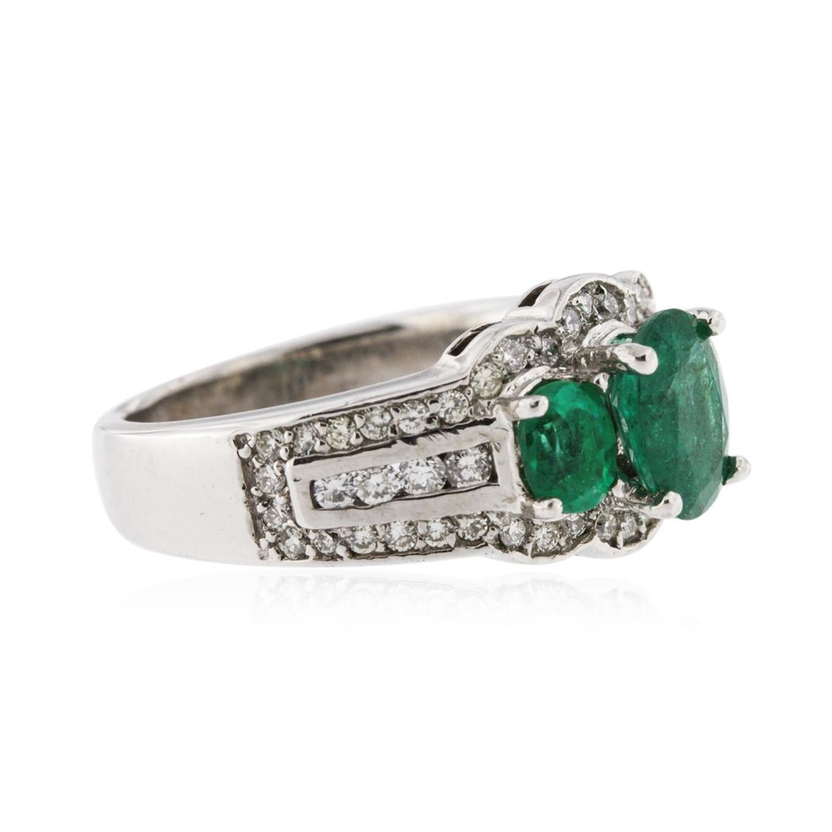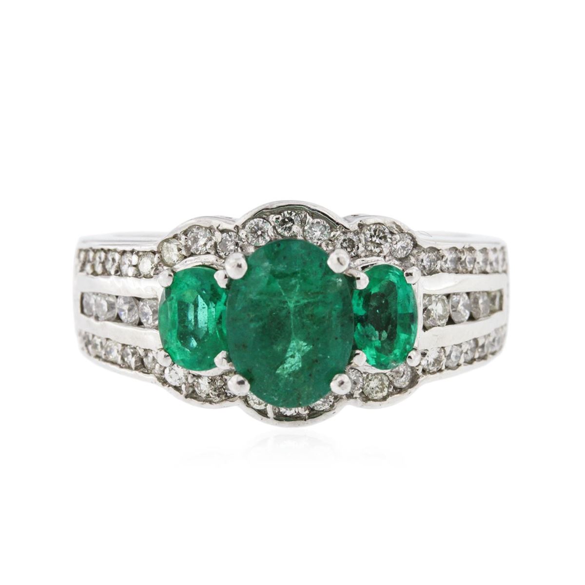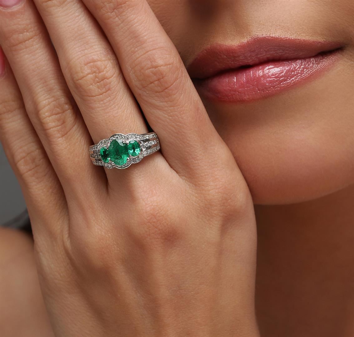 One ring featuring: 14KT white gold weighing 8.40 grams containing three emeralds with a total weight of 1.06ct and diamonds with a total weight of 0.77ct.