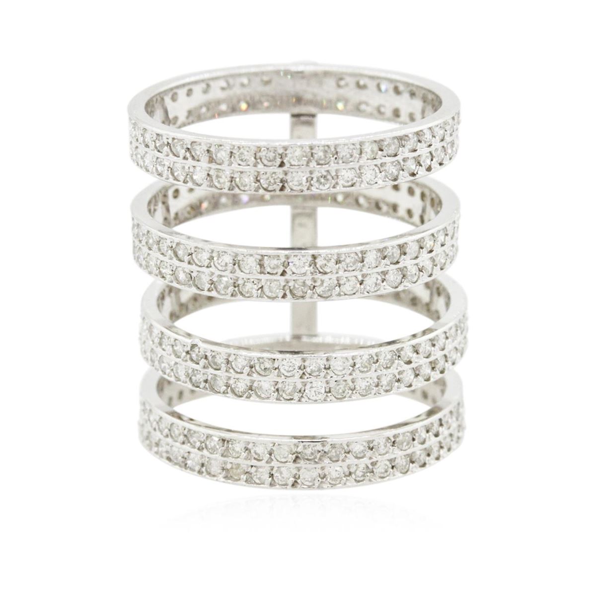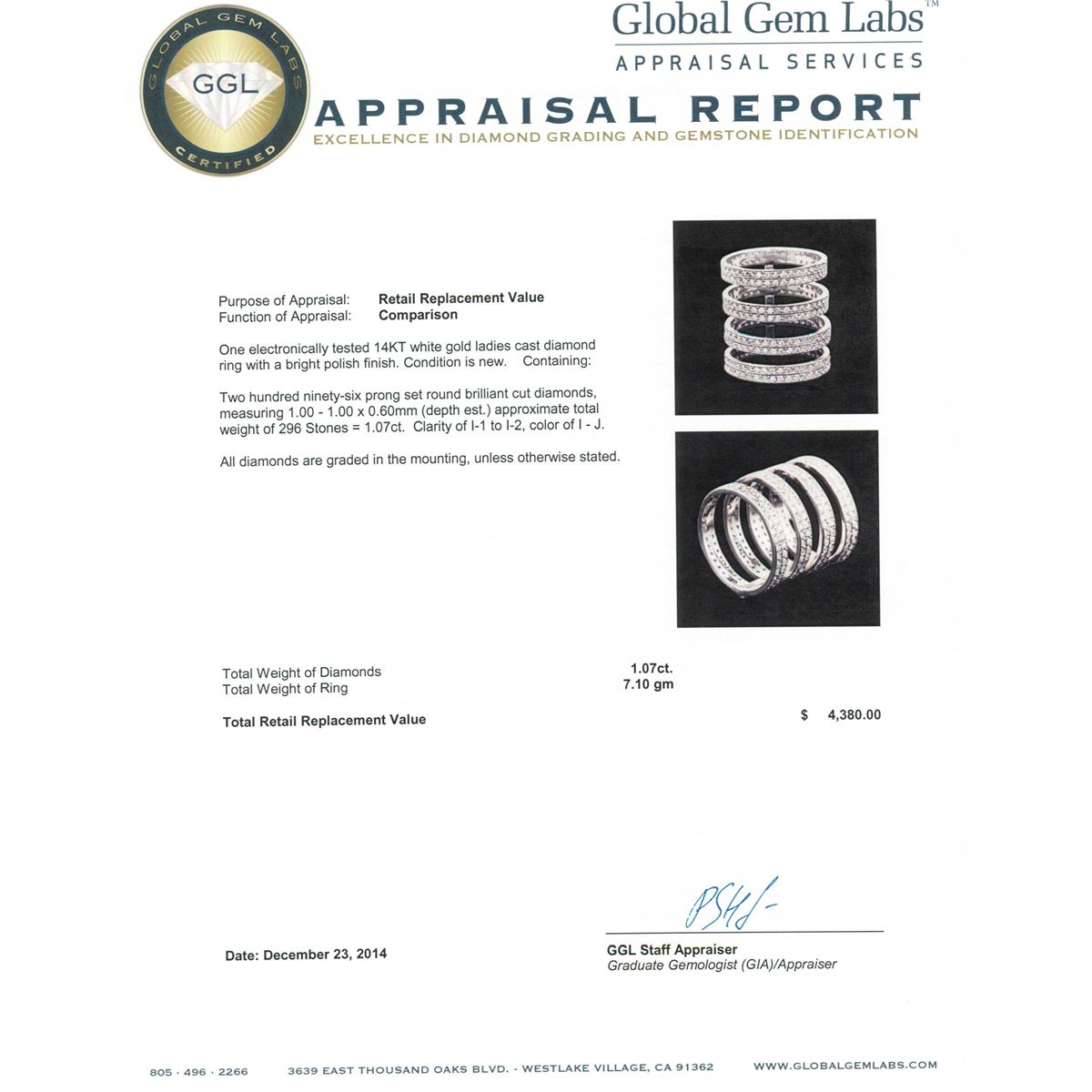 One electronically tested 14KT white gold ladies cast diamond ring with a bright polish finish. Condition is new. Containing: Two Hundred Ninety-Six prong set round brilliant cut diamonds, measuring 1.00 - 1.00 x 0.60mm (depth est.) approximate total weight of 296 Stones = 1.07ct. Clarity: I-1 to I-2. Color: I - J. All diamonds are graded in the mounting, unless otherwise stated. Total Weight of Diamonds 1.07ct. Total Weight of Ring 7.10 grams. GGL Appraised at $4,380.00.