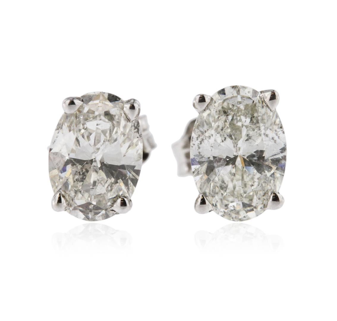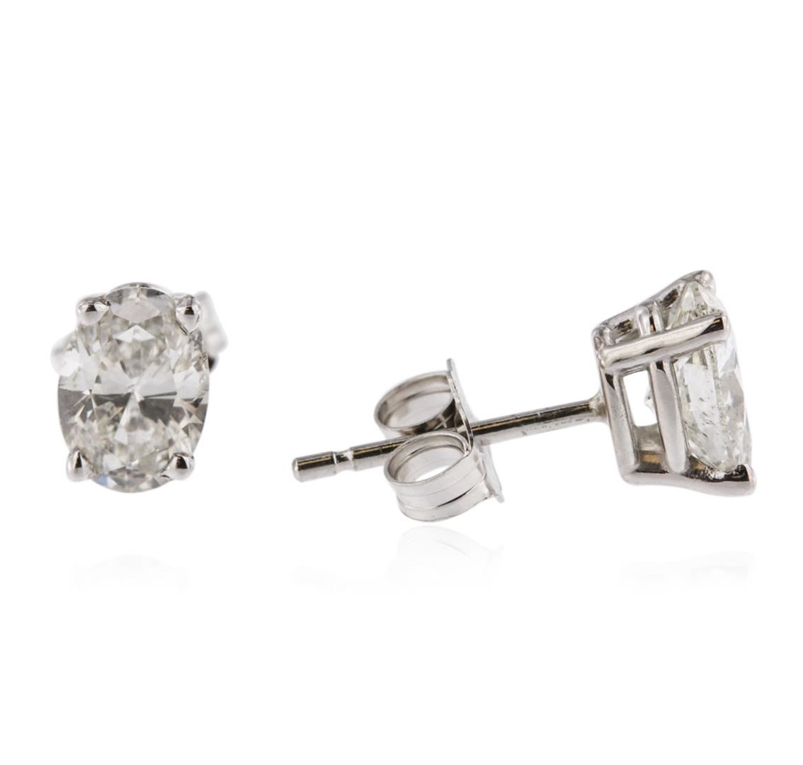 One pair electronically tested 14KT white gold ladies cast diamond stud earrings with friction posts with a bright polish finish. Identified with markings of "14K". Condition is new. Containing: One prong set oval shaped cut diamond, measuring 6.50 x 4.50 x 2.84mm (depth est.) approximate weight of 0.53ct. Clarity: I-1. Color: J, Cut is Good. All diamonds are graded in the mounting, unless otherwise stated. One prong set oval shaped cut diamond, measuring 6.50 x 4.50 x 2.84mm (depth est.) approximate weight of 0.53ct. Clarity: SI-2. Color: J, Cut is Good. Total Weight of Diamonds 1.07ct. Total Weight of Stud Earrings 0.90 grams. GGL Appraised at $3,440.00.