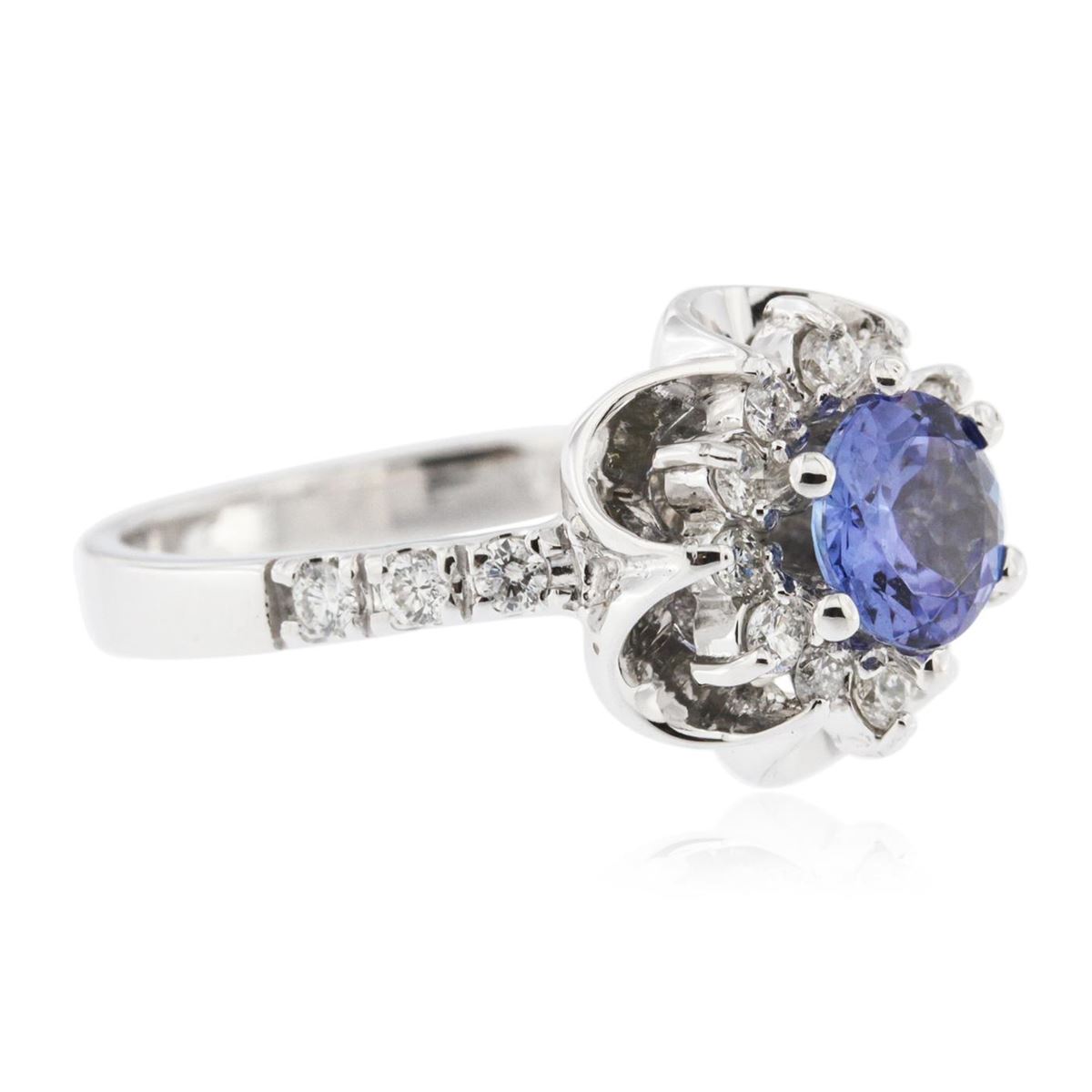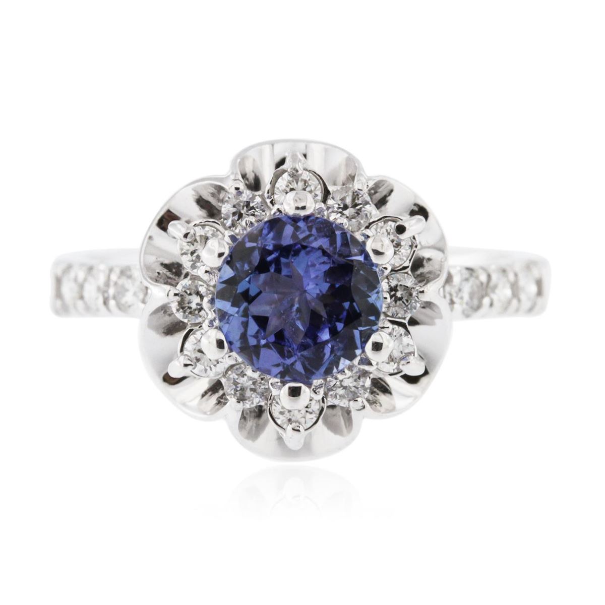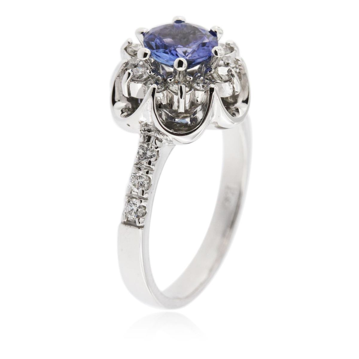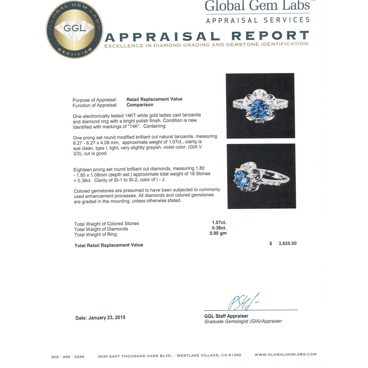 One electronically tested 14KT white gold ladies cast tanzanite and diamond ring with a bright polish finish. Identified with markings of "14K". Condition is new. Containing: One prong set round modified brilliant cut natural tanzanite, measuring 6.27 - 6.27 x 4.08 mm, approximate weight of 1.07ct., clarity is eye clean, type I, light, very slightly grayish, violet color, (GIA V 3/3), cut is good. Eighteen prong set round brilliant cut diamonds, measuring 1.80 - 1.80 x 1.08mm (depth est.) approximate total weight of 18 Stones = 0.38ct. Clarity: SI-1 to SI-2. Color: I - J. Colored gemstones are presumed to have been subjected to commonly used enhancement processes. All diamonds and colored gemstones are graded in the mounting, unless otherwise stated. Total Weight of Colored Stones 1.07ct. Total Weight of Diamonds 0.38ct. Total Weight of Ring 5.90 grams. GGL Appraised at $3,825.00.