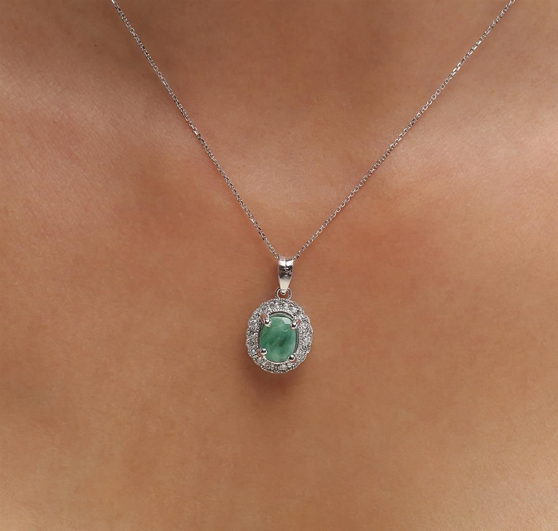 One electronically tested 14KT white gold ladies cast emerald and diamond pendant & chain 16.0" long, cable link with a spring ring clasp with a bright polish finish. Identified with markings of "14K". Condition is new. Containing: One prong set oval modified brilliant cut natural emerald, measuring 8.00 x 6.00 x 3.90mm, approximate weight of 1.07ct., clarity is heavily included, type III, medium, very slightly grayish, green color, (GIA G 5/3), cut is good. Twenty prong set round brilliant cut diamonds, measuring 1.30 - 1.30 x 0.78mm (depth est.) approximate total weight of 20 Stones = 0.16ct. Clarity: SI-1 to SI-2. Color: K - L. Colored gemstones are presumed to have been subjected to commonly used enhancement processes, All diamonds and colored gemstones are graded in the mounting, unless otherwise stated. Total Weight of Colored Stones 1.07ct. Total Weight of Diamonds 0.16ct. Total Weight of Pendant & Chain 3.20 grams. GGL Appraised at $1,890.00.