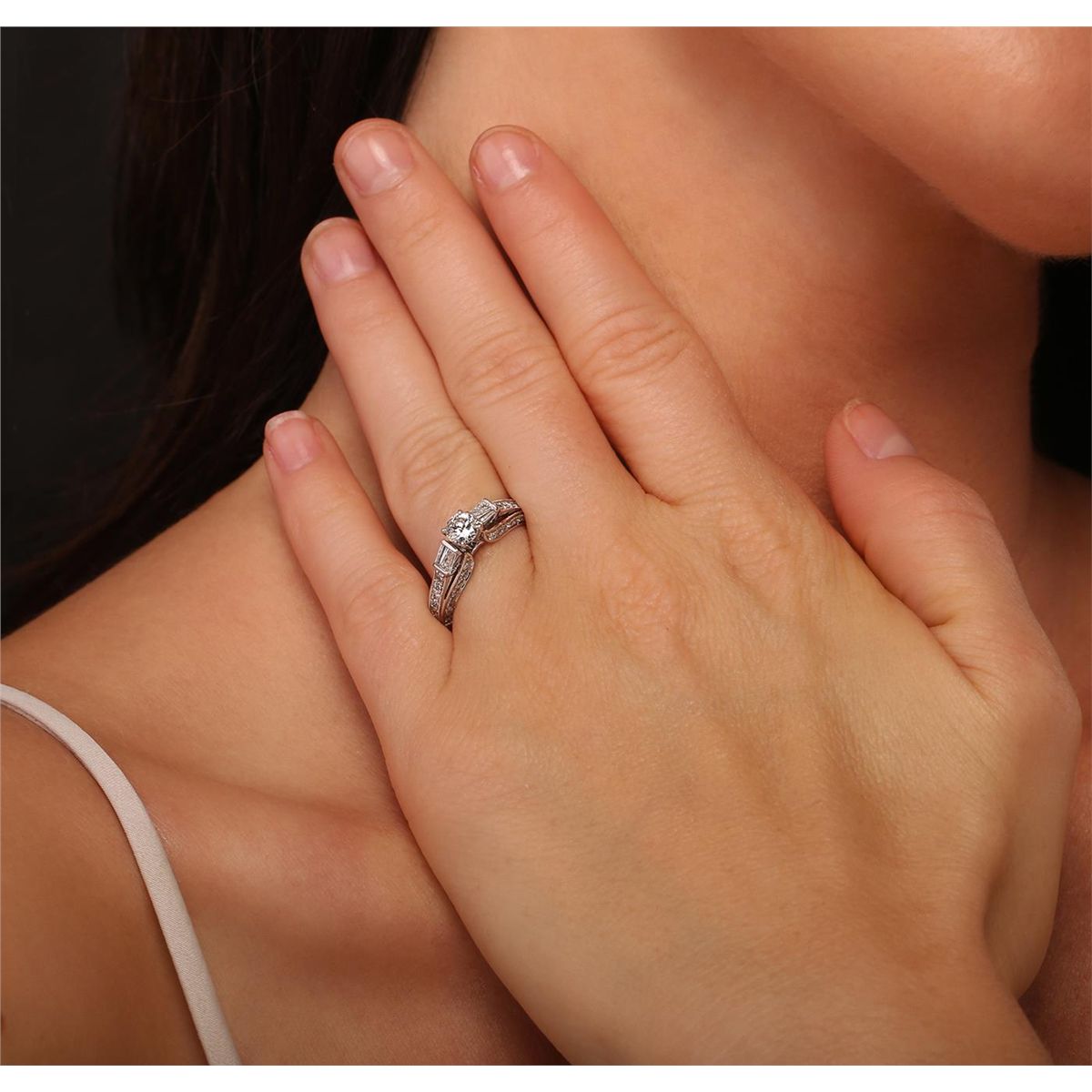 One electronically tested 14KT white gold ladies combination cast & assembled engagement ring with a bright polish finish. Identified with markings of "14K". Condition is new. Containing: One prong set round brilliant cut diamond, measuring 5.00 - 5.00 x 3.00mm (depth est.) approximate weight of 0.46ct. Clarity: VS-2. Color: I, Cut is Very Good. Four prong set baguette cut diamonds, measuring 3.00 x 1.50 x 1.28mm (depth est.) approximate total weight of 4 Stones = 0.21ct. Clarity: SI-1 to SI-2. Color: G - H, Cut is Good. Fifty prong set round brilliant cut diamonds, measuring 1.30 - 1.30 x 0.78mm (depth est.) approximate total weight of 50 Stones = 0.40ct. Clarity: I-1 to I-3. Color: H - I, Cut is Good. All diamonds are graded in the mounting, unless otherwise stated. Total Weight of Diamonds 1.07ct. Total Weight of Ring 4.20 grams. GGL Appraised at $7,095.00.
