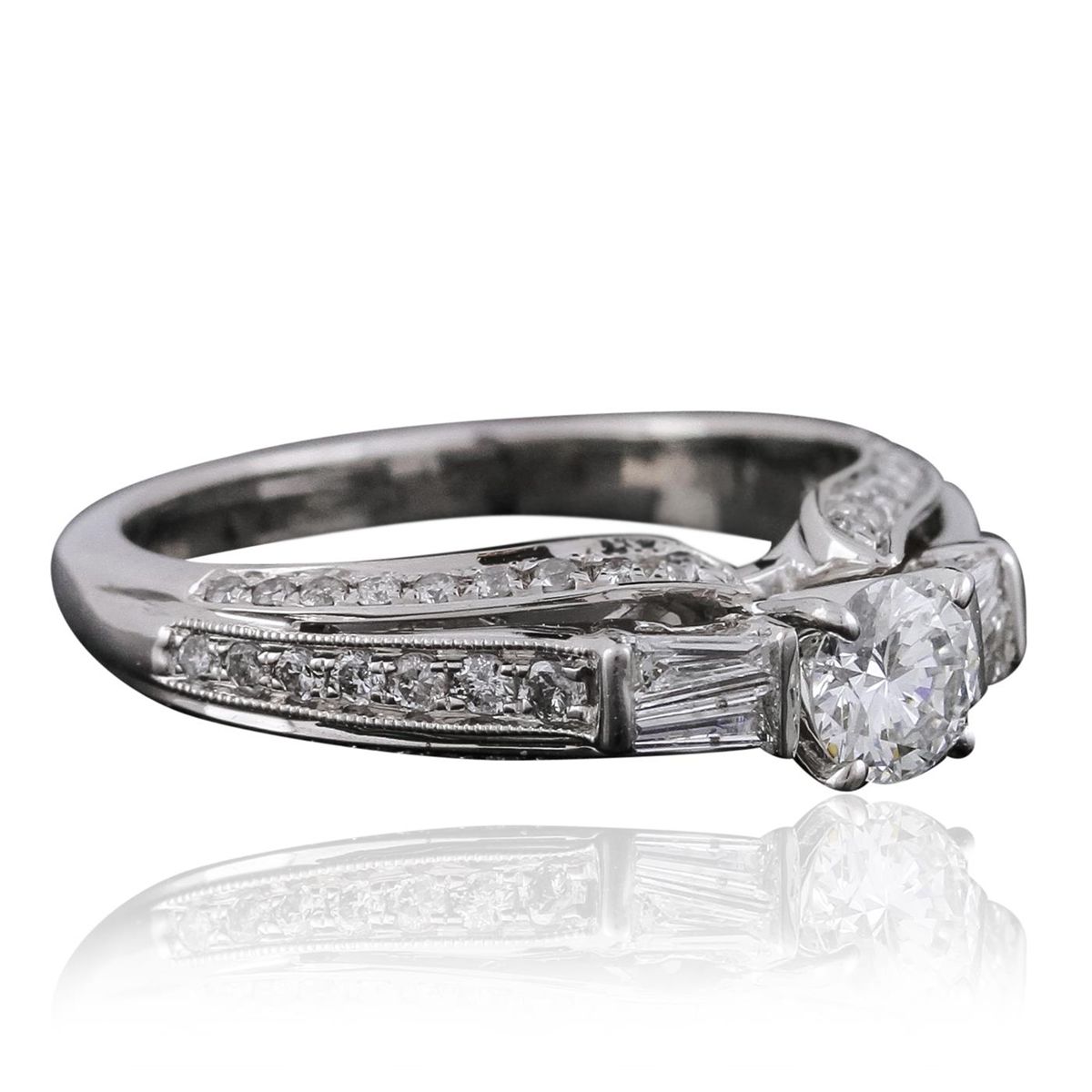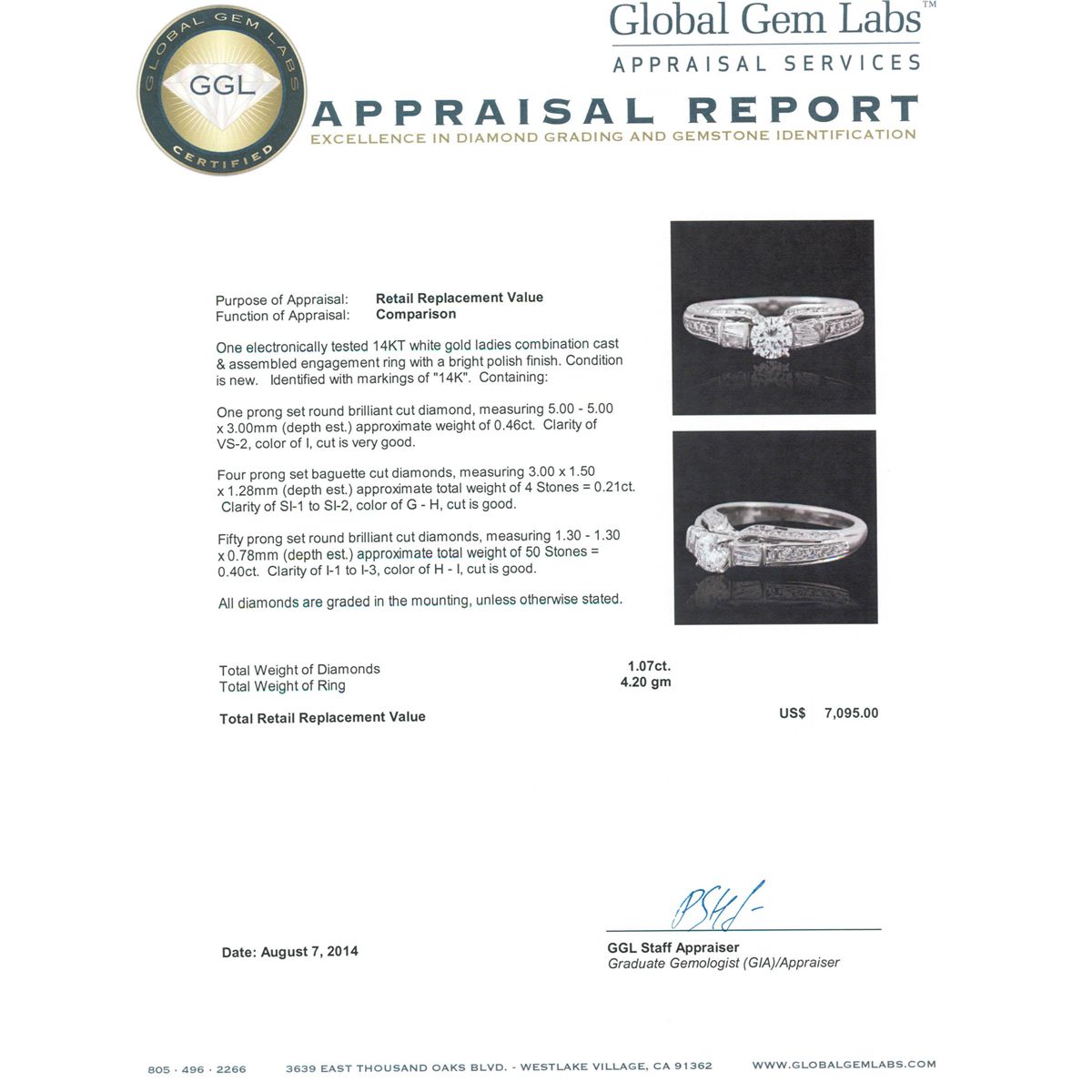 One electronically tested 14KT white gold ladies combination cast & assembled engagement ring with a bright polish finish. Identified with markings of "14K". Condition is new. Containing: One prong set round brilliant cut diamond, measuring 5.00 - 5.00 x 3.00mm (depth est.) approximate weight of 0.46ct. Clarity: VS-2. Color: I, Cut is Very Good. Four prong set baguette cut diamonds, measuring 3.00 x 1.50 x 1.28mm (depth est.) approximate total weight of 4 Stones = 0.21ct. Clarity: SI-1 to SI-2. Color: G - H, Cut is Good. Fifty prong set round brilliant cut diamonds, measuring 1.30 - 1.30 x 0.78mm (depth est.) approximate total weight of 50 Stones = 0.40ct. Clarity: I-1 to I-3. Color: H - I, Cut is Good. All diamonds are graded in the mounting, unless otherwise stated. Total Weight of Diamonds 1.07ct. Total Weight of Ring 4.20 grams. GGL Appraised at $7,095.00.