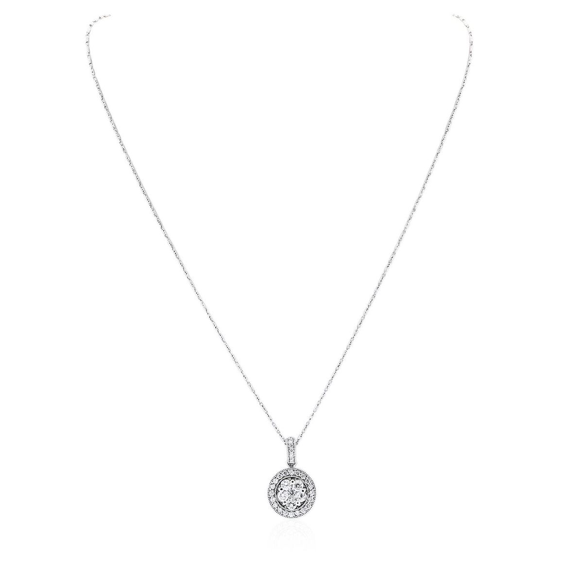 One electronically tested 14KT white gold ladies combination cast & assembled diamond pendant & chain 18.0" long, medium fancy link with a lobster claw clasp with a bright polish finish. Identified with markings of "14K". Condition is new. Containing: Six prong set round brilliant cut diamonds, measuring 3.20 - 3.20 x 1.92mm (depth est.) approximate total weight of 6 Stones = 0.72ct. Clarity: SI-2 to I-1. Color: I - J, Cut is Good. Twenty-Six prong set round brilliant cut diamonds, measuring 1.70 - 1.40 x 0.93mm (depth est.) approximate total weight of 26 Stones = 0.35ct. Clarity: SI-2 to I-1. Color: I - J, Cut is Good. All diamonds are graded in the mounting, unless otherwise stated. Total Weight of Diamonds 1.07ct. Total Weight of Pendant & Chain 7.80 grams. GGL Appraised at $5,110.00.
