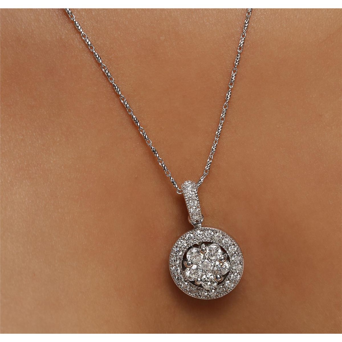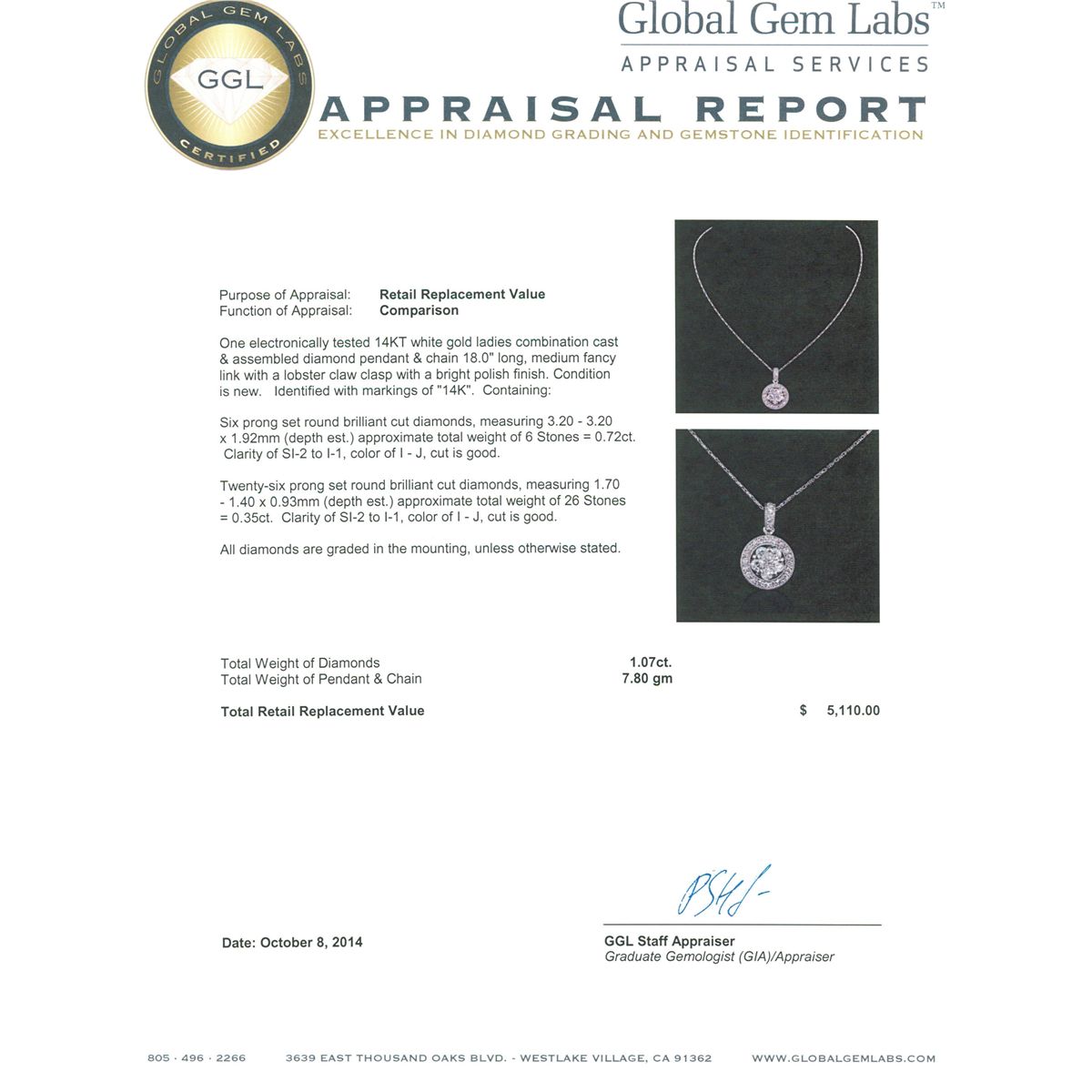 One electronically tested 14KT white gold ladies combination cast & assembled diamond pendant & chain 18.0" long, medium fancy link with a lobster claw clasp with a bright polish finish. Identified with markings of "14K". Condition is new. Containing: Six prong set round brilliant cut diamonds, measuring 3.20 - 3.20 x 1.92mm (depth est.) approximate total weight of 6 Stones = 0.72ct. Clarity: SI-2 to I-1. Color: I - J, Cut is Good. Twenty-Six prong set round brilliant cut diamonds, measuring 1.70 - 1.40 x 0.93mm (depth est.) approximate total weight of 26 Stones = 0.35ct. Clarity: SI-2 to I-1. Color: I - J, Cut is Good. All diamonds are graded in the mounting, unless otherwise stated. Total Weight of Diamonds 1.07ct. Total Weight of Pendant & Chain 7.80 grams. GGL Appraised at $5,110.00.