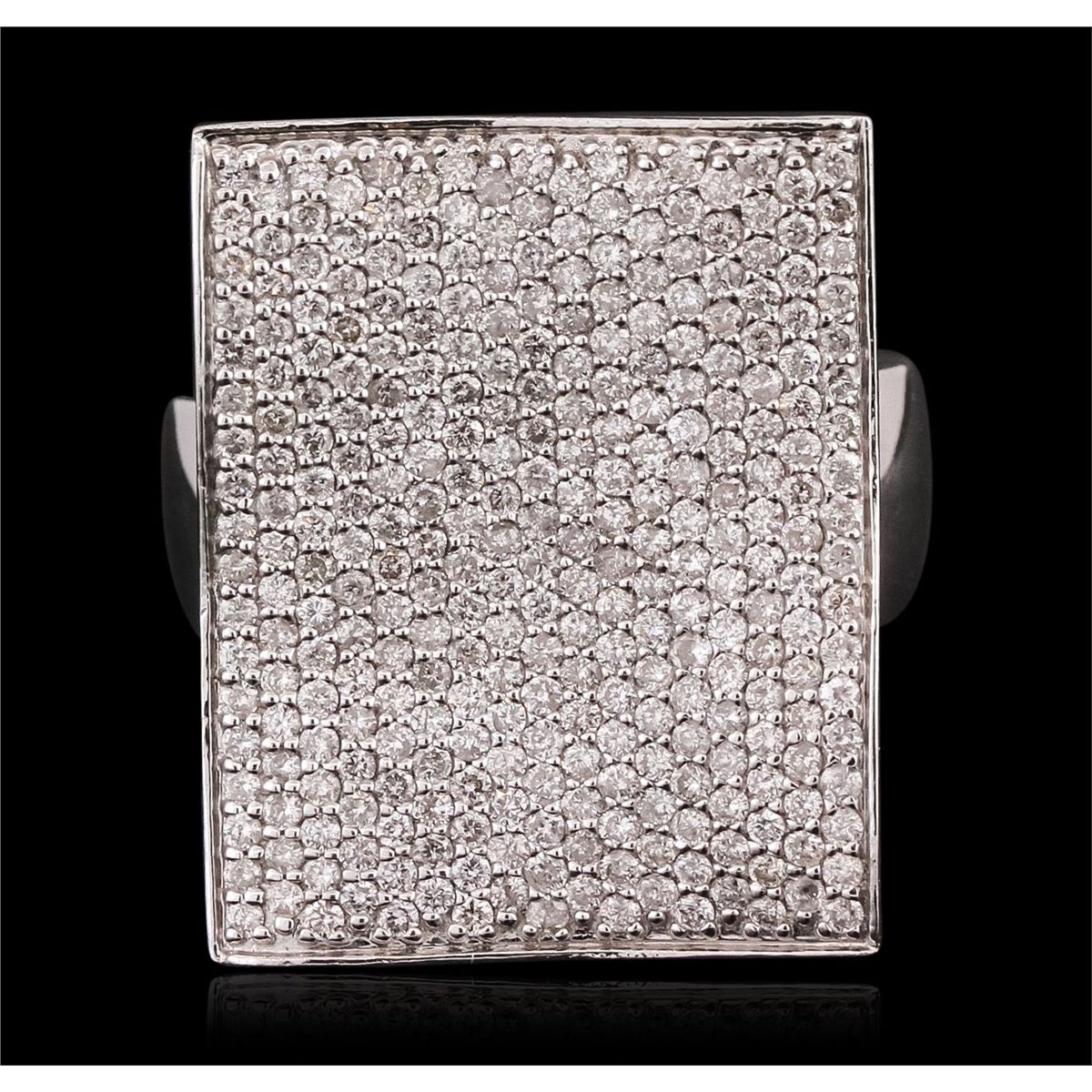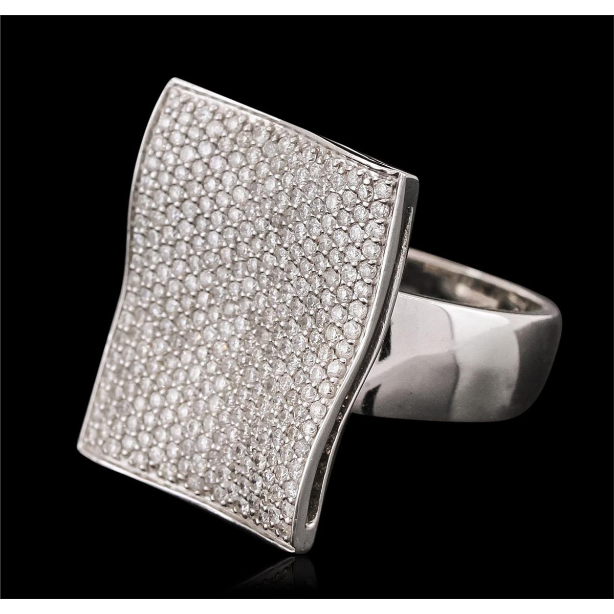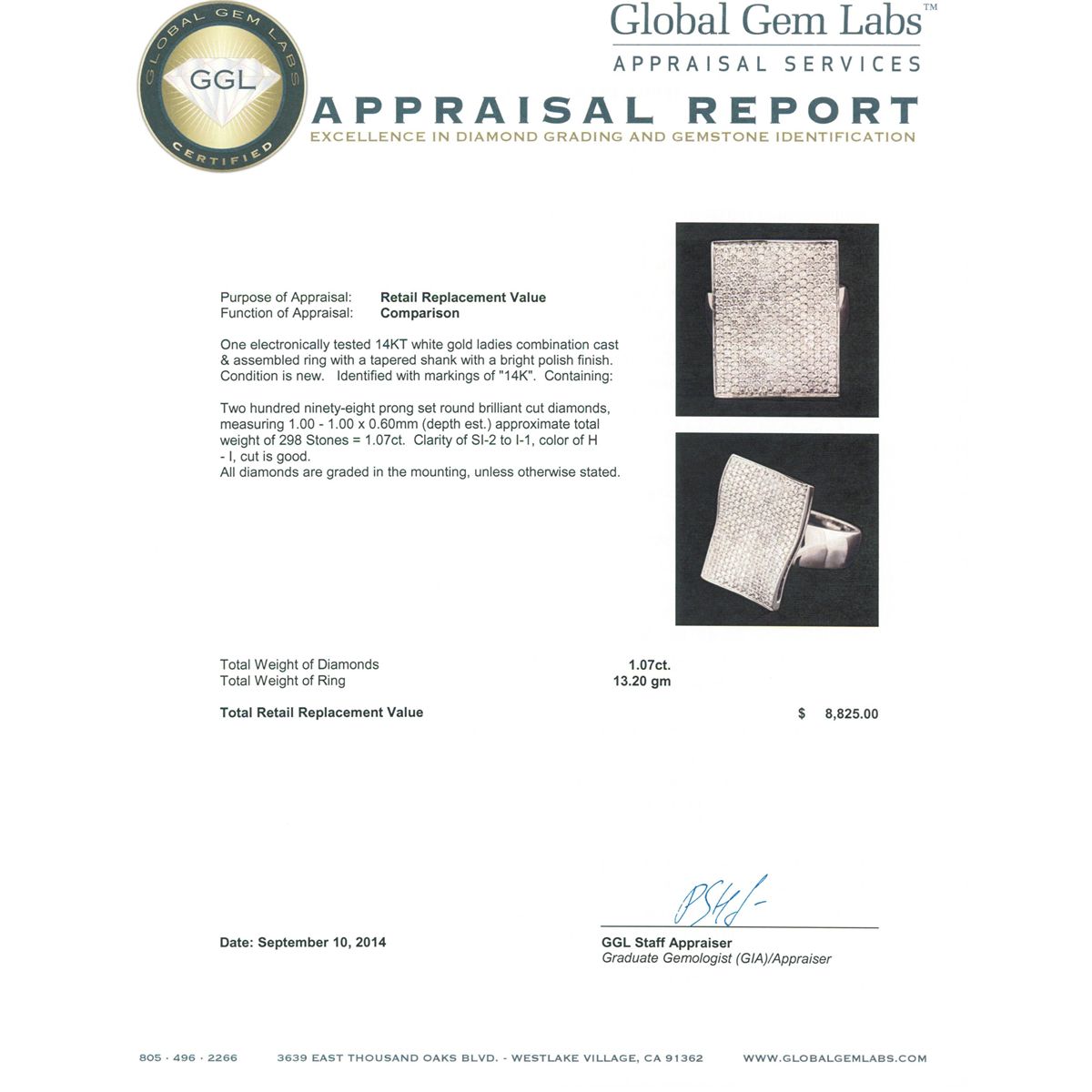 One electronically tested 14KT white gold ladies combination cast & assembled ring with a tapered shank with a bright polish finish. Identified with markings of "14K". Condition is new. Containing: Two Hundred Ninety-Eight prong set round brilliant cut diamonds, measuring 1.00 - 1.00 x 0.60mm (depth est.) approximate total weight of 298 Stones = 1.07ct. Clarity: SI-2 to I-1. Color: H - I, Cut is Good. All diamonds are graded in the mounting, unless otherwise stated. Total Weight of Diamonds 1.07ct. Total Weight of Ring 13.20 grams. GGL Appraised at $8,825.00.