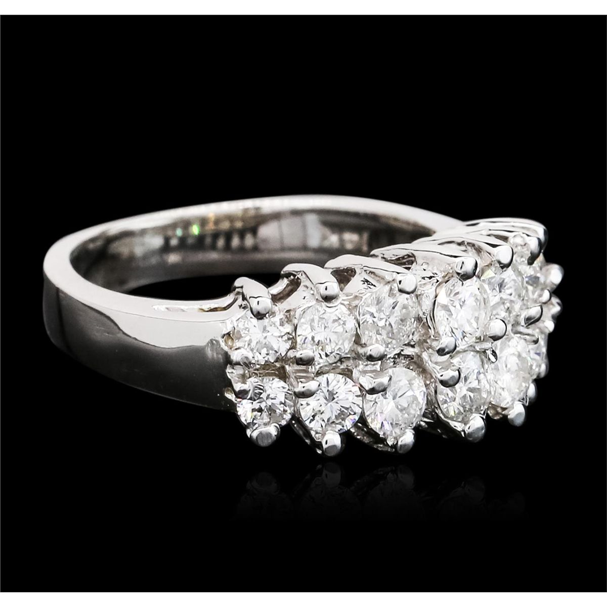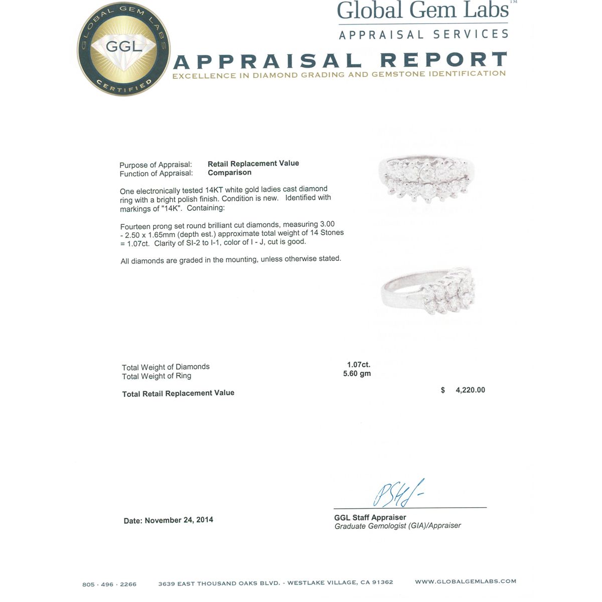 One electronically tested 14KT white gold ladies cast diamond ring with a bright polish finish. Identified with markings of "14K". Condition is new. Containing: Fourteen prong set round brilliant cut diamonds, measuring 3.00 - 2.50 x 1.65mm (depth est.) approximate total weight of 14 Stones = 1.07ct. Clarity: SI-2 to I-1. Color: I - J, Cut is Good. All diamonds are graded in the mounting, unless otherwise stated. Total Weight of Diamonds 1.07ct. Total Weight of Ring 5.60 grams. GGL Appraised at $4,220.00.