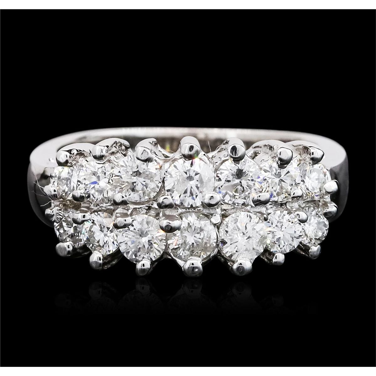 One electronically tested 14KT white gold ladies cast diamond ring with a bright polish finish. Identified with markings of "14K". Condition is new. Containing: Fourteen prong set round brilliant cut diamonds, measuring 3.00 - 2.50 x 1.65mm (depth est.) approximate total weight of 14 Stones = 1.07ct. Clarity: SI-2 to I-1. Color: I - J, Cut is Good. All diamonds are graded in the mounting, unless otherwise stated. Total Weight of Diamonds 1.07ct. Total Weight of Ring 5.60 grams. GGL Appraised at $4,220.00.