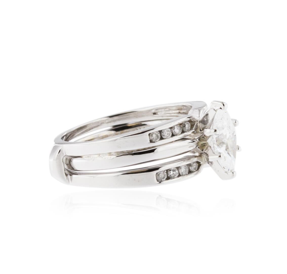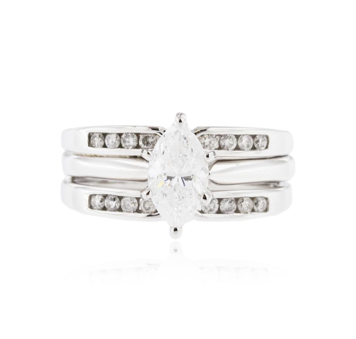 One electronically tested 14KT white gold ladies cast diamond engagement ring with a bright polish finish. Identified with markings of "14K". Condition is new. Containing: One prong set marquise shaped cut diamond, measuring 9.00 x 5.20 x 3.28mm (depth est.) approximate weight of 0.89ct. Clarity: I-1. Color: G, Cut is Good. Sixteen channel set round brilliant cut diamonds, measuring 1.50 - 1.50 x 0.90mm (depth est.) approximate total weight of 16 Stones = 0.20ct. Clarity: I-2. Color: H - I, Cut is Good. All diamonds are graded in the mounting, unless otherwise stated. Total Weight of Diamonds 1.09ct. Total Weight of Engagement Ring 6.50 grams. GGL Appraised at $4,745.00.