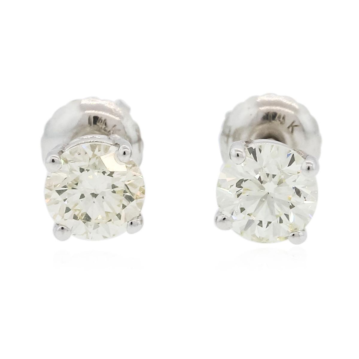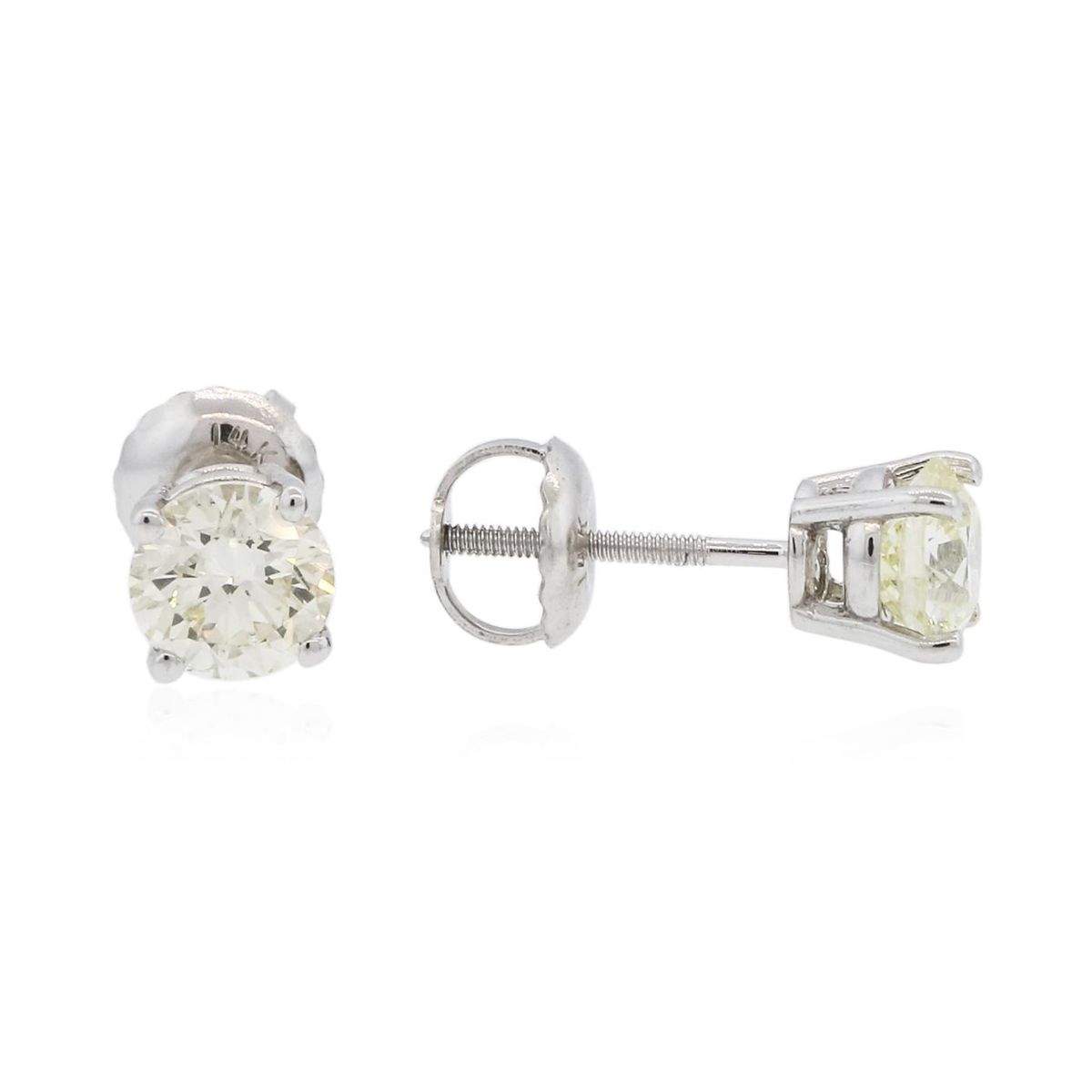 One pair electronically tested 14KT white gold cast & assembled diamond solitaire earrings with screw backs. Condition is new, good workmanship. Containing: One prong set round brilliant cut diamond, measuring 5.18 - 5.15 x 3.25mm (depth est.), 4.00% GTCF approximate weight of 0.55ct with a very strong blue fluorescence. Graded in the setting. Clarity: I-1. Depth: 62.9%. Table 58.0%. One prong set round brilliant cut diamond, measuring 5.20 - 5.17 x 3.28mm (depth est.) approximate weight of 0.54ct with a strong blue fluorescence. Graded in the setting. Clarity: I-1. Depth: 63.2%. Table 51.6%. Total Weight of Diamonds 1.09ct. Total Weight of Earrings 1.00 grams. AIG Appraised at $3,280.00.