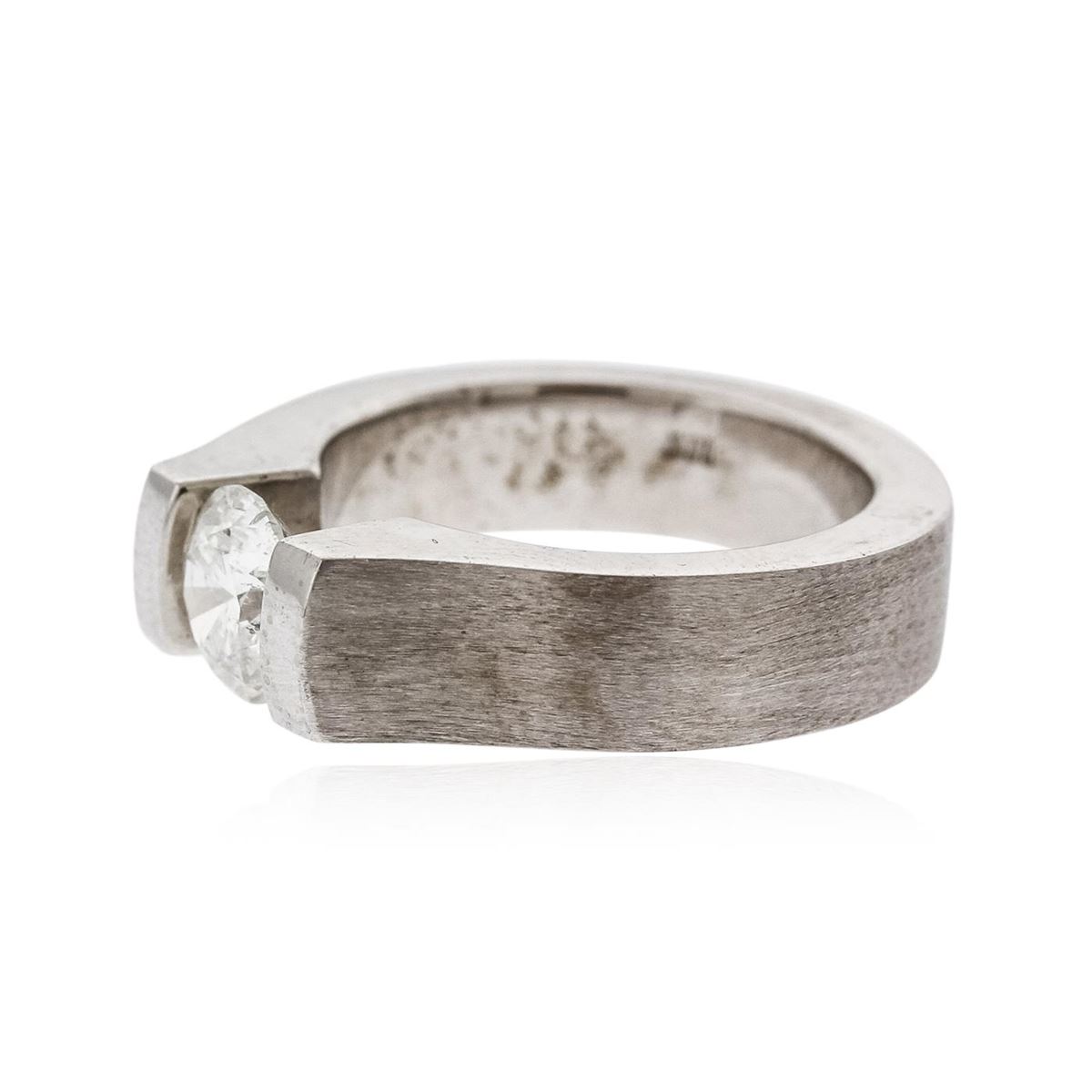 One electronically tested 14KT white gold ladies cast diamond solitaire ring with a brushed finish. Identified with markings of "14K". Condition is new. Containing: One tension set round brilliant cut diamond, measuring 6.70 - 6.70 x 4.02mm (depth est.) approximate weight of 1.10ct. Clarity: I-2. Color: H, Cut is Good. All diamonds are graded in the mounting, unless otherwise stated. Total Weight of Diamonds 1.10ct. Total Weight of Solitaire Ring 11.30 grams. GGL Appraised at $7,325.00.