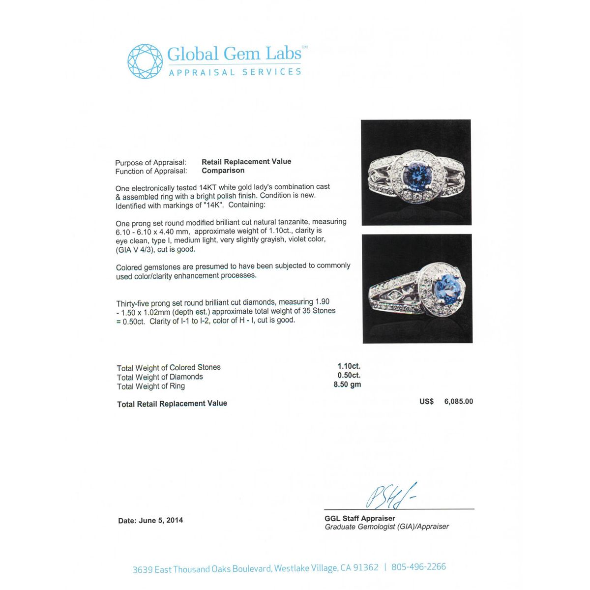 One electronically tested 14KT white gold Ladies combination cast & assembled ring with a bright polish finish. Condition is new. Identified with markings of "14K". Containing: One prong set round modified brilliant cut natural tanzanite, measuring 6.10 - 6.10 x 4.40 mm, approximate weight of 1.10ct., clarity is eye clean, type I, medium light, very slightly grayish, violet color, (GIA V 4/3), cut is good. Colored gemstones are presumed to have been subjected to commonly used color/clarity enhancement processes. Thirty-Five prong set round brilliant cut diamonds, measuring 1.90 - 1.50 x 1.02mm (depth est.) approximate total weight of 35 Stones = 0.50ct. Clarity of I-1 to I-2, Color of H - I, Cut is Good. Total Weight of Colored Stones 1.10ct. Total Weight of Diamonds 0.50ct. Total Weight of Ring 8.50 grams. GGL Appraised at $6,085.00.