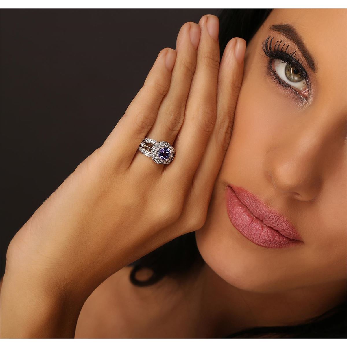 One electronically tested 14KT white gold Ladies combination cast & assembled ring with a bright polish finish. Condition is new. Identified with markings of "14K". Containing: One prong set round modified brilliant cut natural tanzanite, measuring 6.10 - 6.10 x 4.40 mm, approximate weight of 1.10ct., clarity is eye clean, type I, medium light, very slightly grayish, violet color, (GIA V 4/3), cut is good. Colored gemstones are presumed to have been subjected to commonly used color/clarity enhancement processes. Thirty-Five prong set round brilliant cut diamonds, measuring 1.90 - 1.50 x 1.02mm (depth est.) approximate total weight of 35 Stones = 0.50ct. Clarity of I-1 to I-2, Color of H - I, Cut is Good. Total Weight of Colored Stones 1.10ct. Total Weight of Diamonds 0.50ct. Total Weight of Ring 8.50 grams. GGL Appraised at $6,085.00.